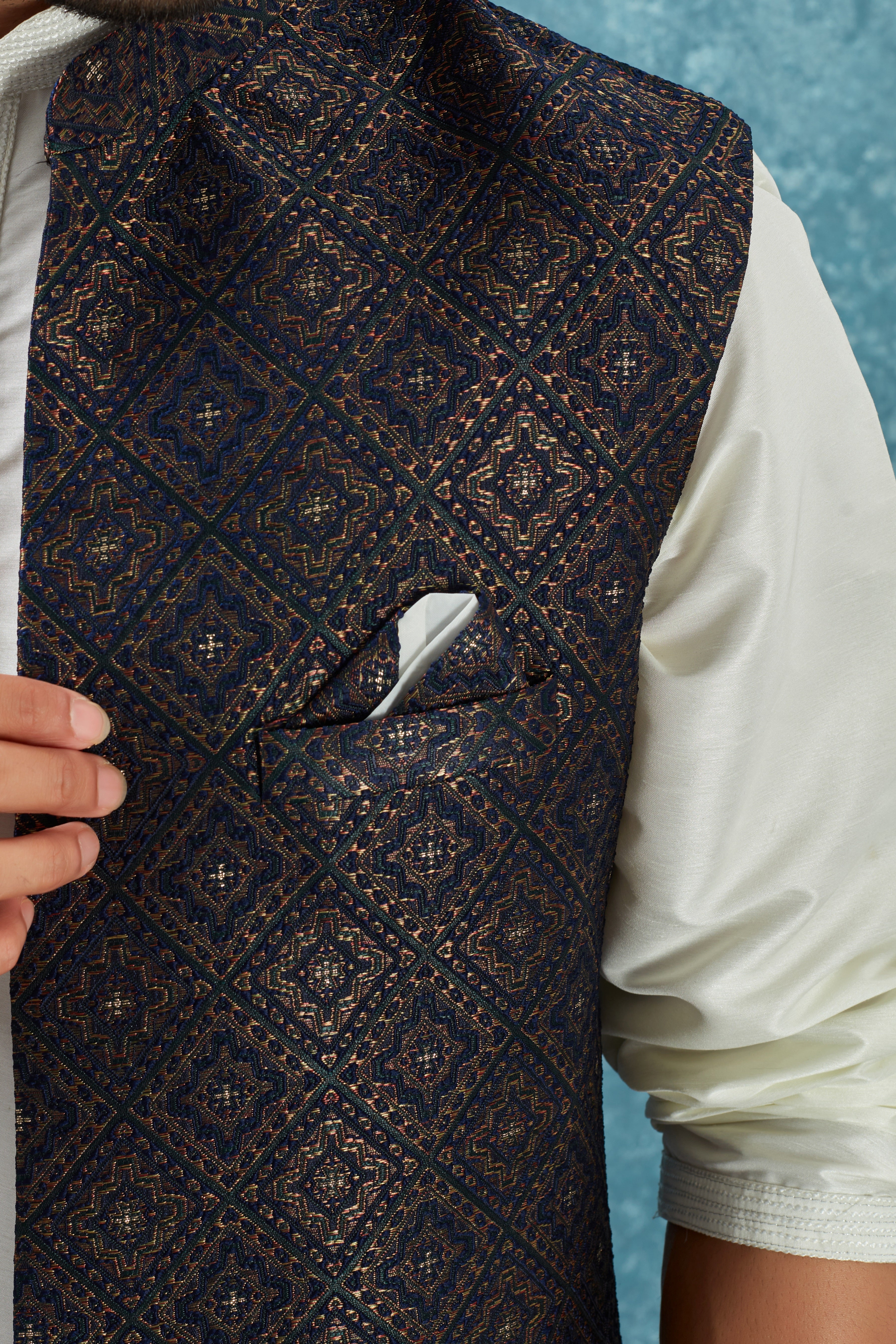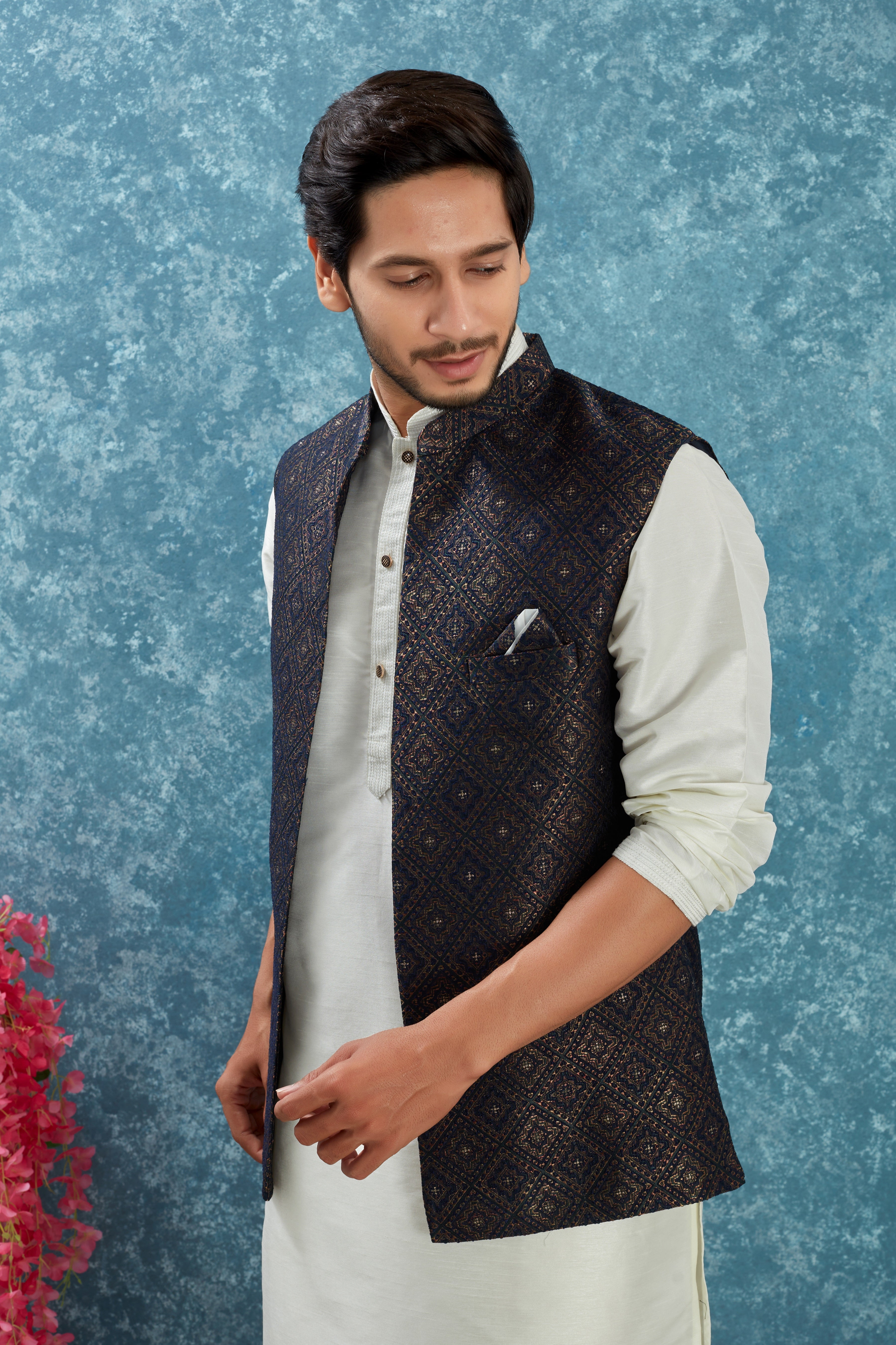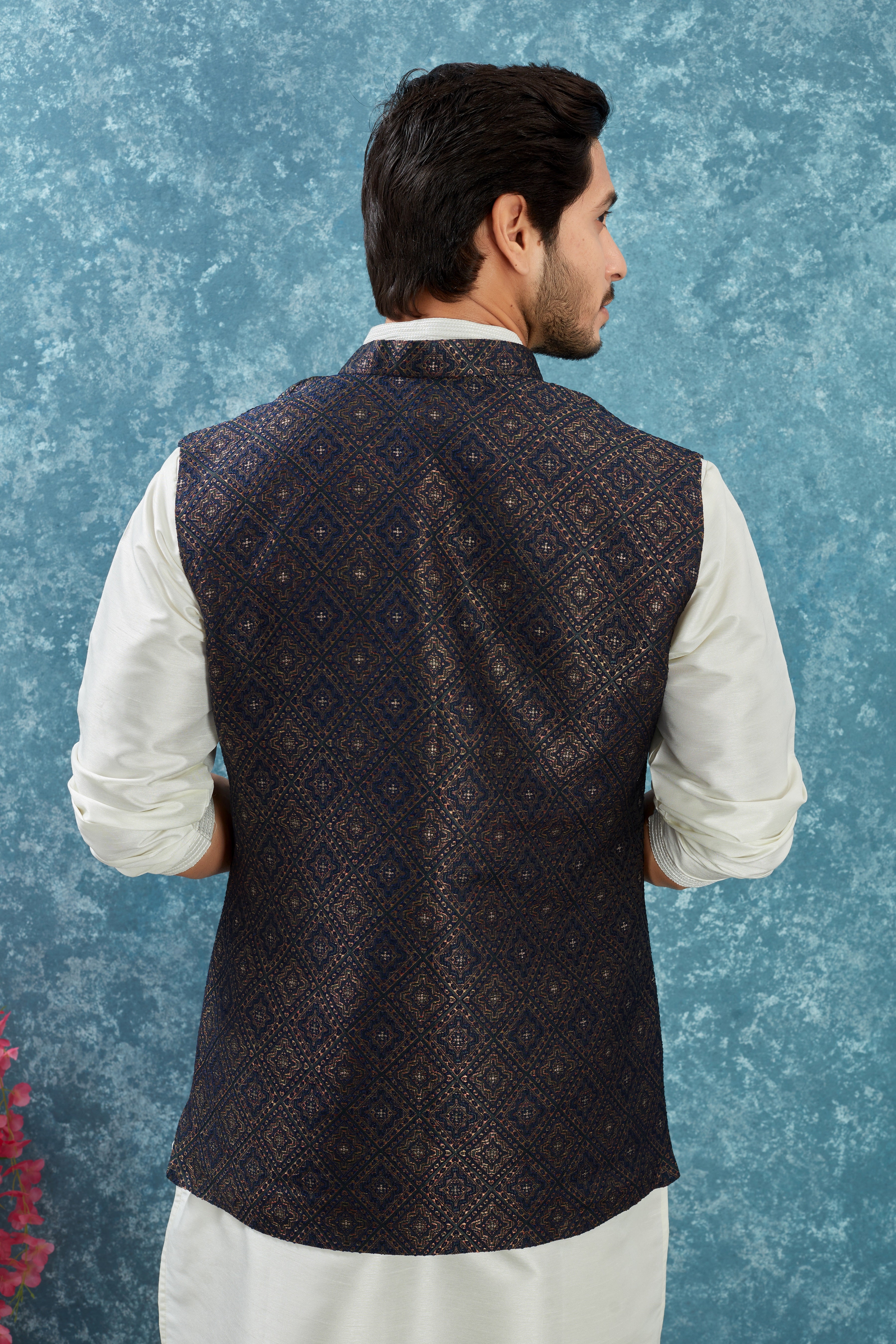 Step into timeless elegance with our Navy Blue & Black Brocade Nehru Jacket paired with a classic Solid kurta. This ensemble brings together traditional style and modern sophistication, making it perfect for festive events, weddings, and formal gatherings.