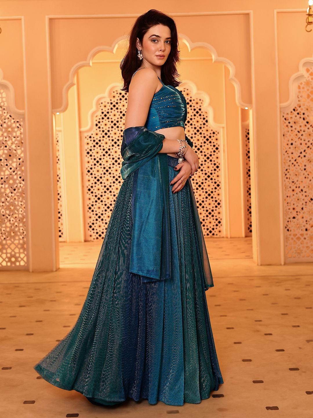 Bring glamor to every celebration with our Iris Multi Color Shimmer Lehenga Choli Set. Crafted from luxe shimmer fabric, this statement ensemble features a pleated flared lehenga paired with a criss-cross crop top and a matching dupatta. The rich teal hues with metallic shine make it perfect for weddings, receptions, sangeet nights, or festive occasions.