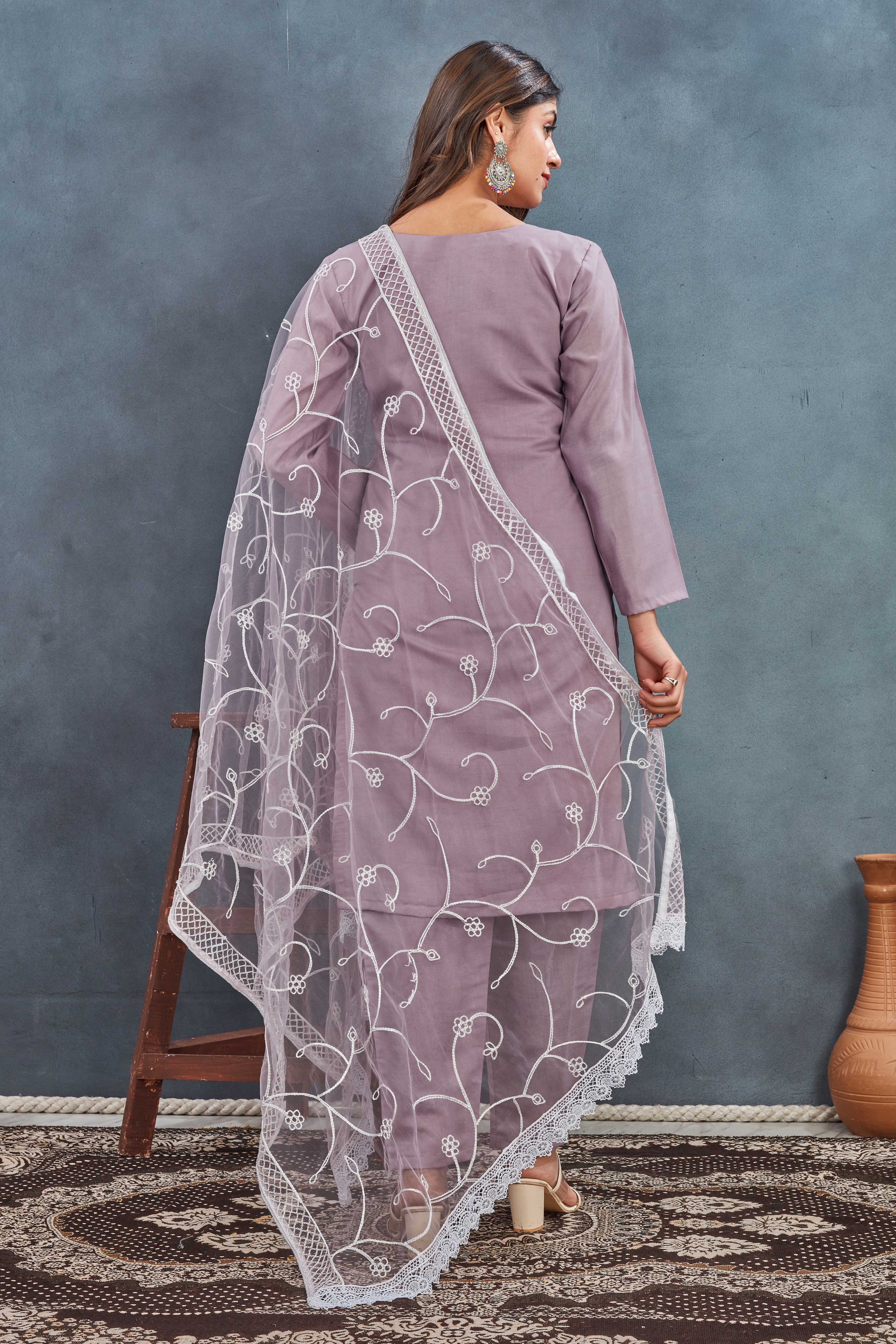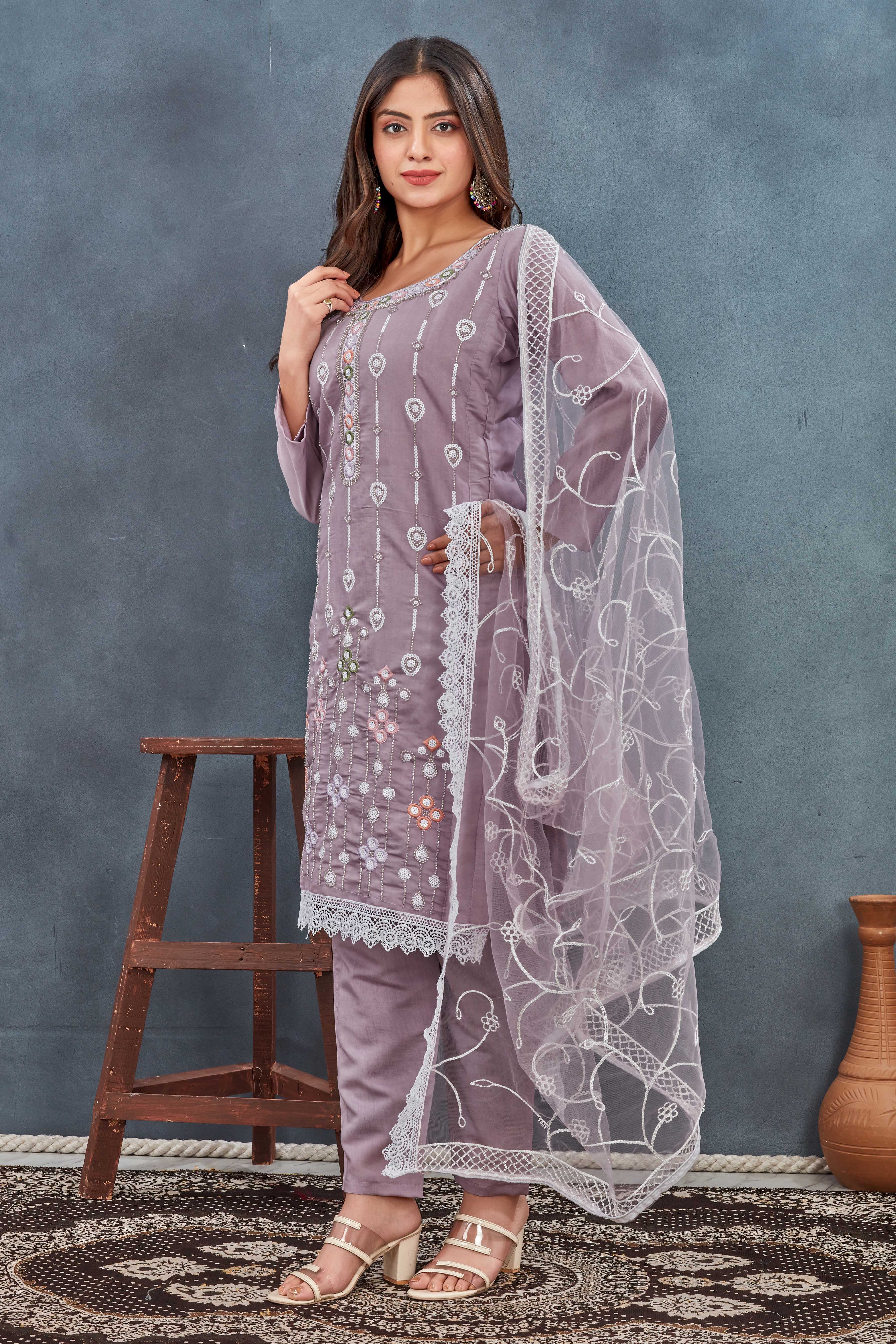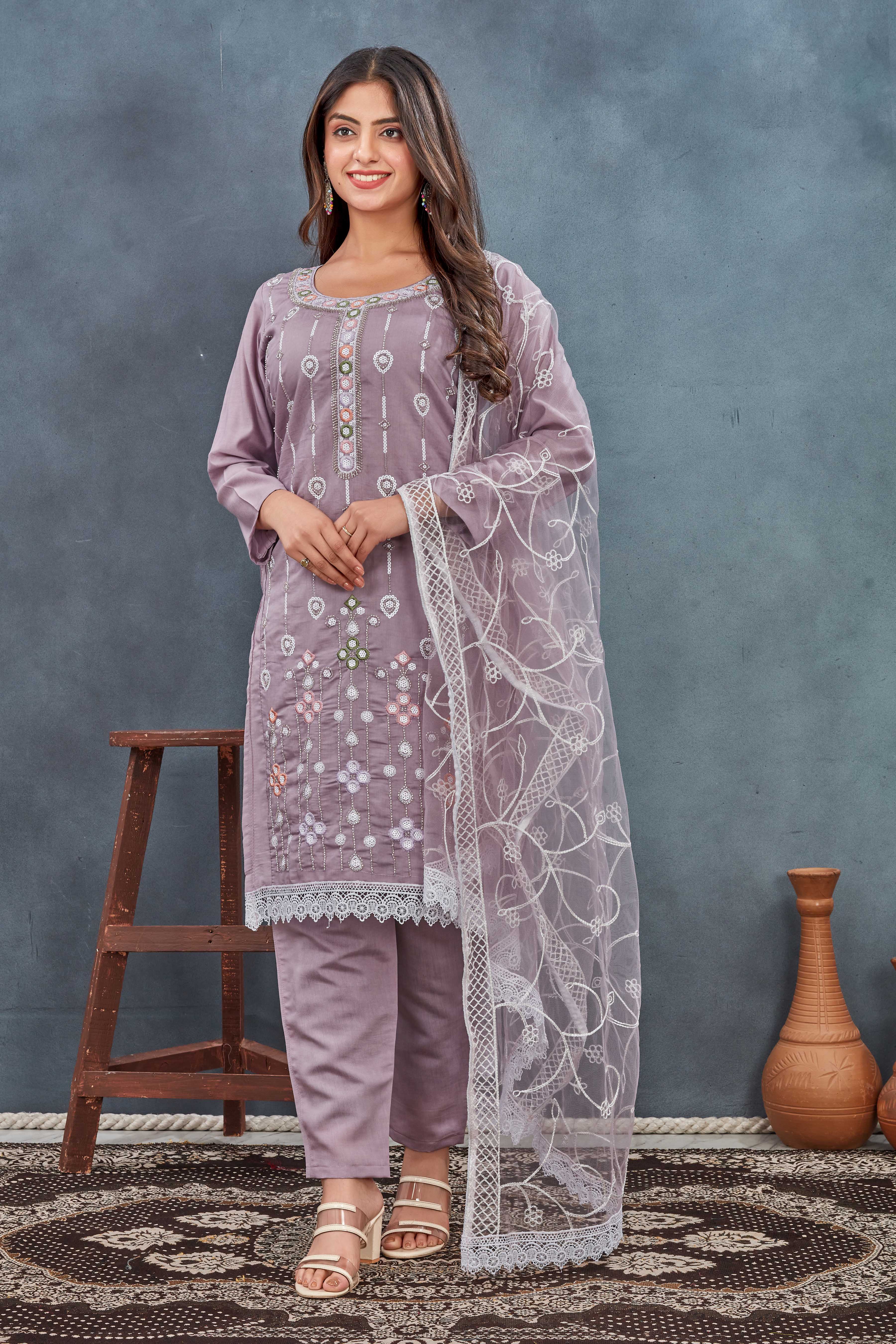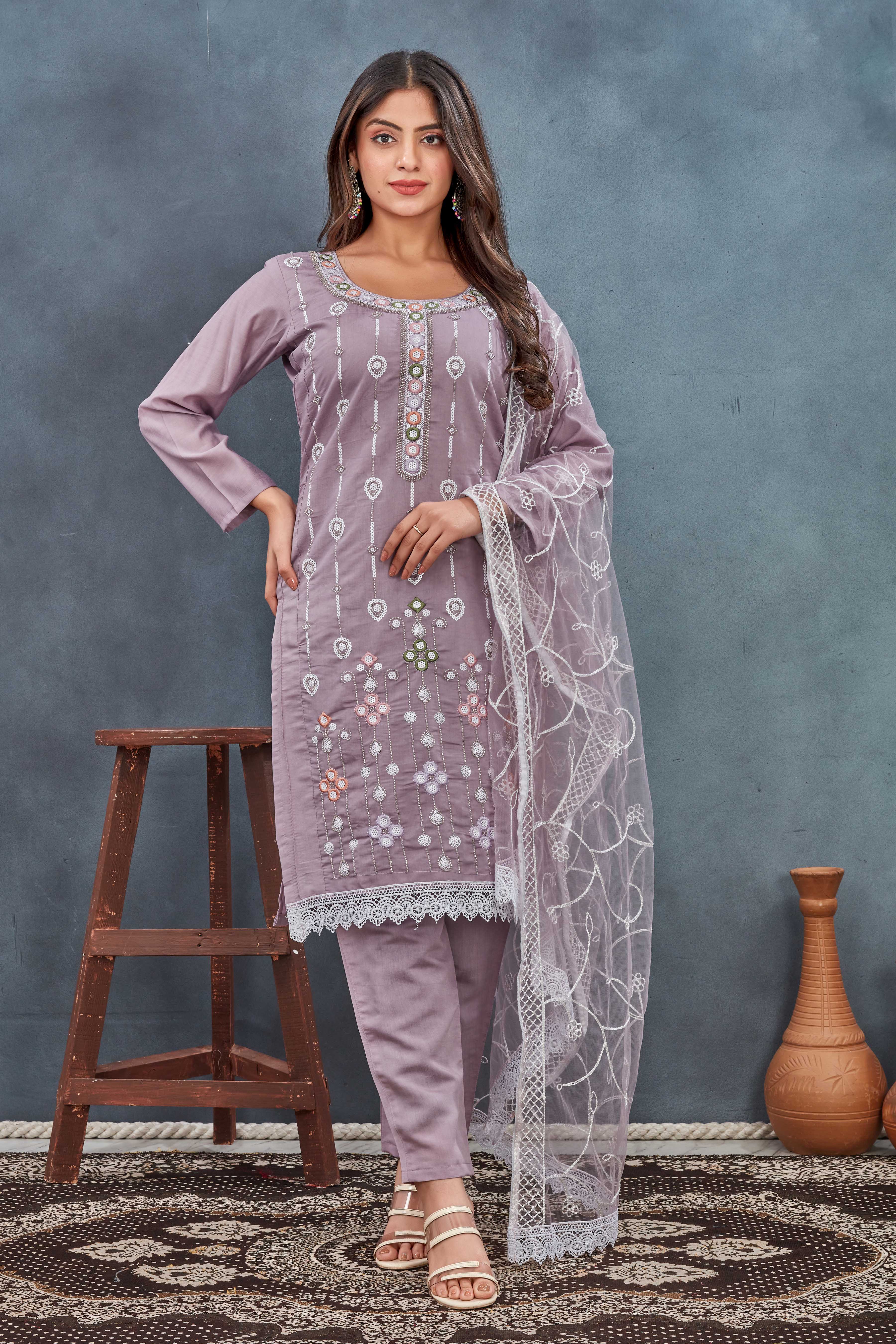 Add charm and grace to your ethnic wardrobe with this elegant lavender embroidered salwar suit. This three-piece outfit showcases intricate vertical embroidery patterns with floral motifs and subtle sequin accents, paired with a soft net dupatta adorned with delicate lace borders.