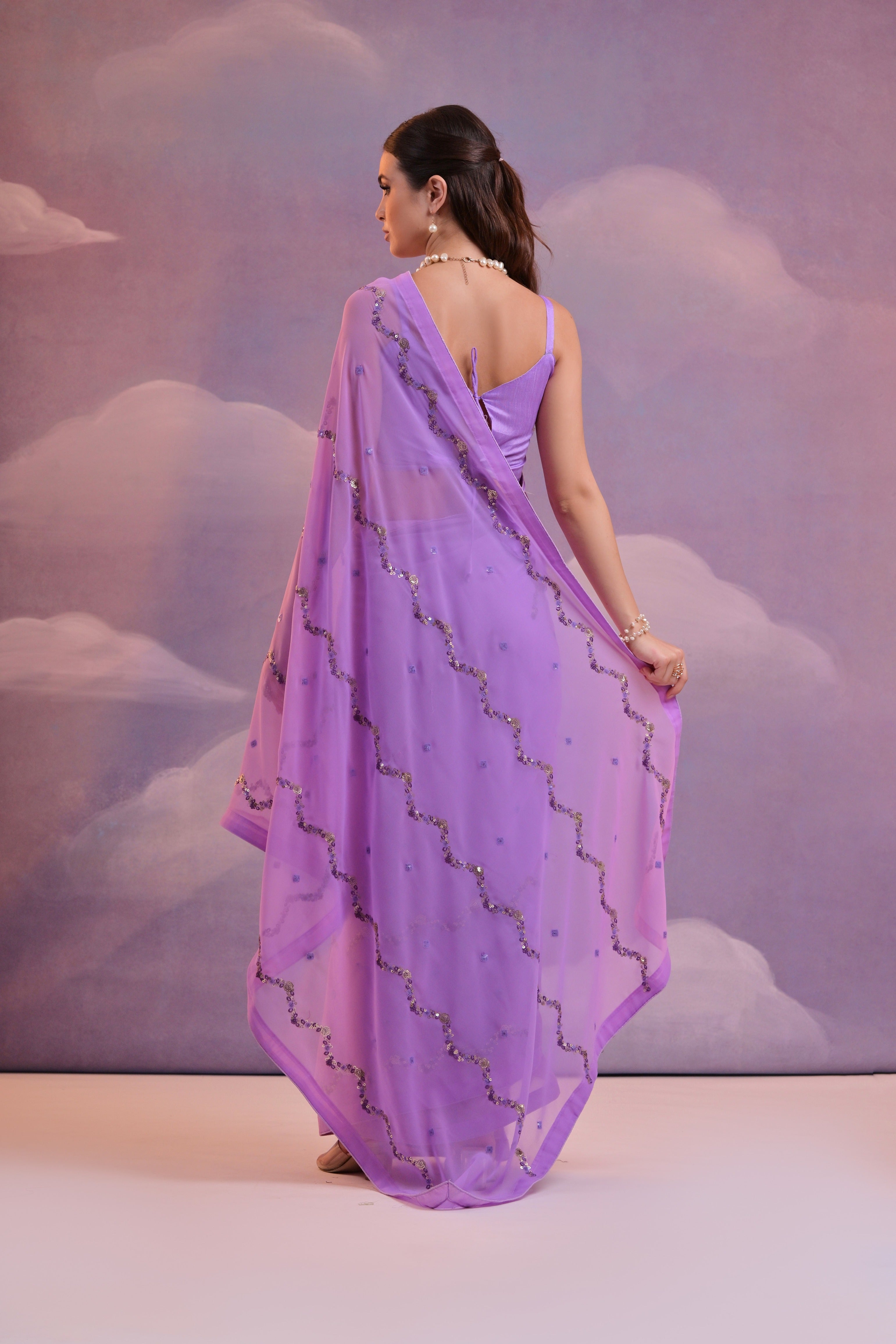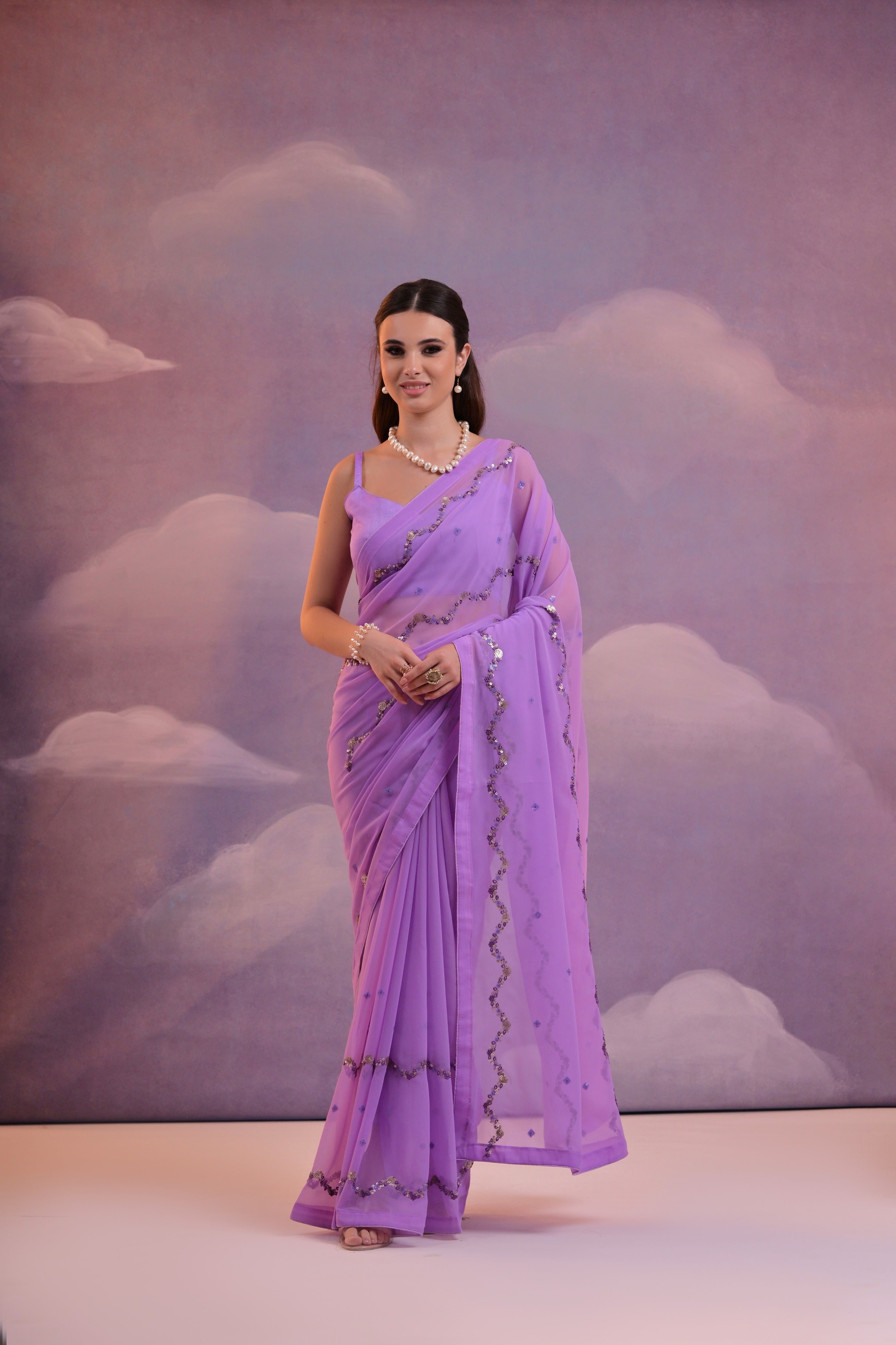 Graceful and feminine, this lavender saree is a dreamy ensemble for special occasions. Crafted from soft georgette, it features a delicate sequin wave border and scattered sequin motifs for a refined shimmer.
