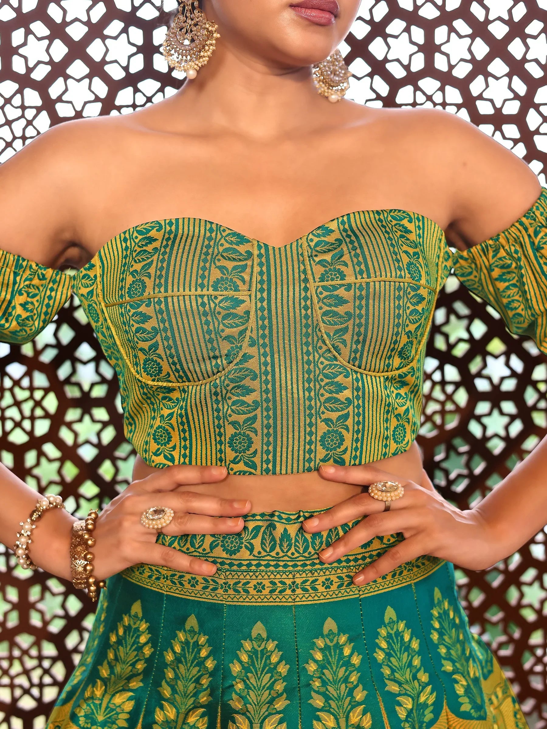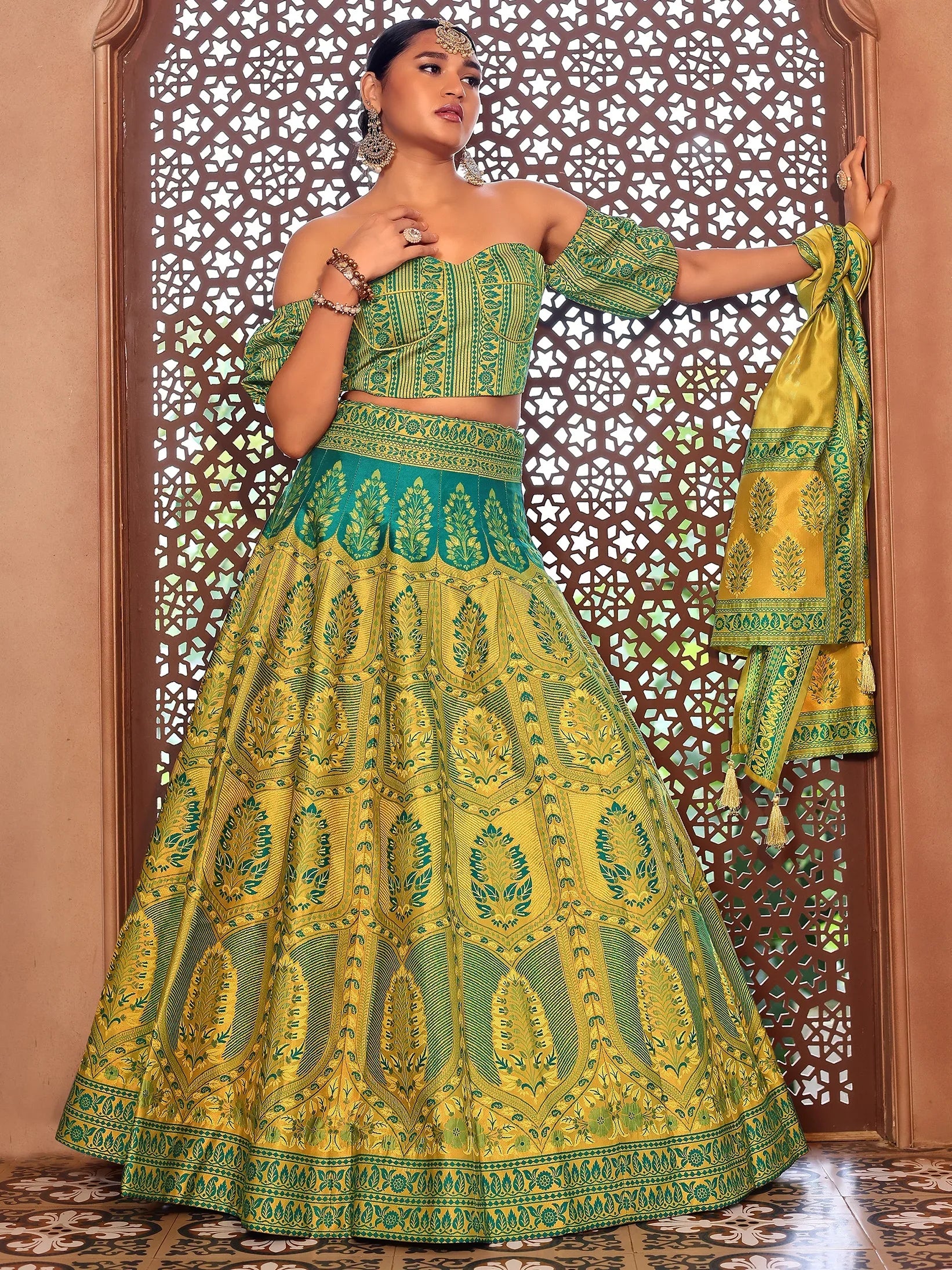 Infuse sunshine into your ethnic wardrobe with this Lime Yellow Ajrakh Print Lehenga Set. Crafted in a brilliant palette of yellow and green, this ensemble features a fitted sweetheart neckline blouse with puff off-shoulder sleeves, a voluminous skirt adorned in intricate ethnic motifs, and a coordinated dupatta with elegant printed borders.