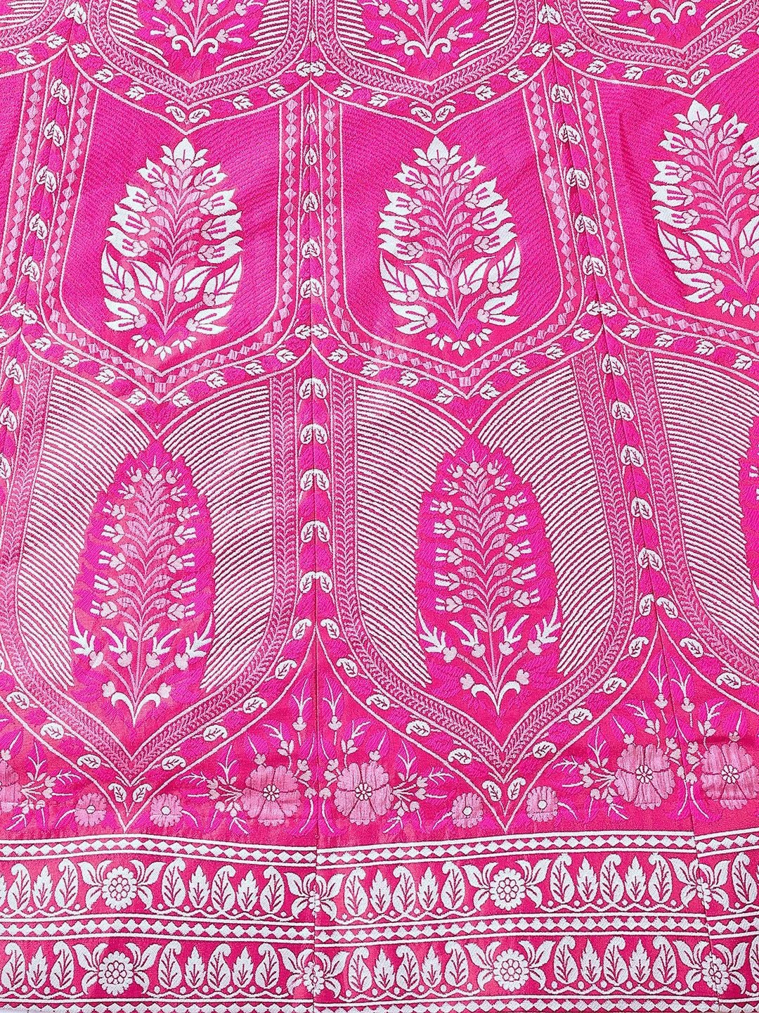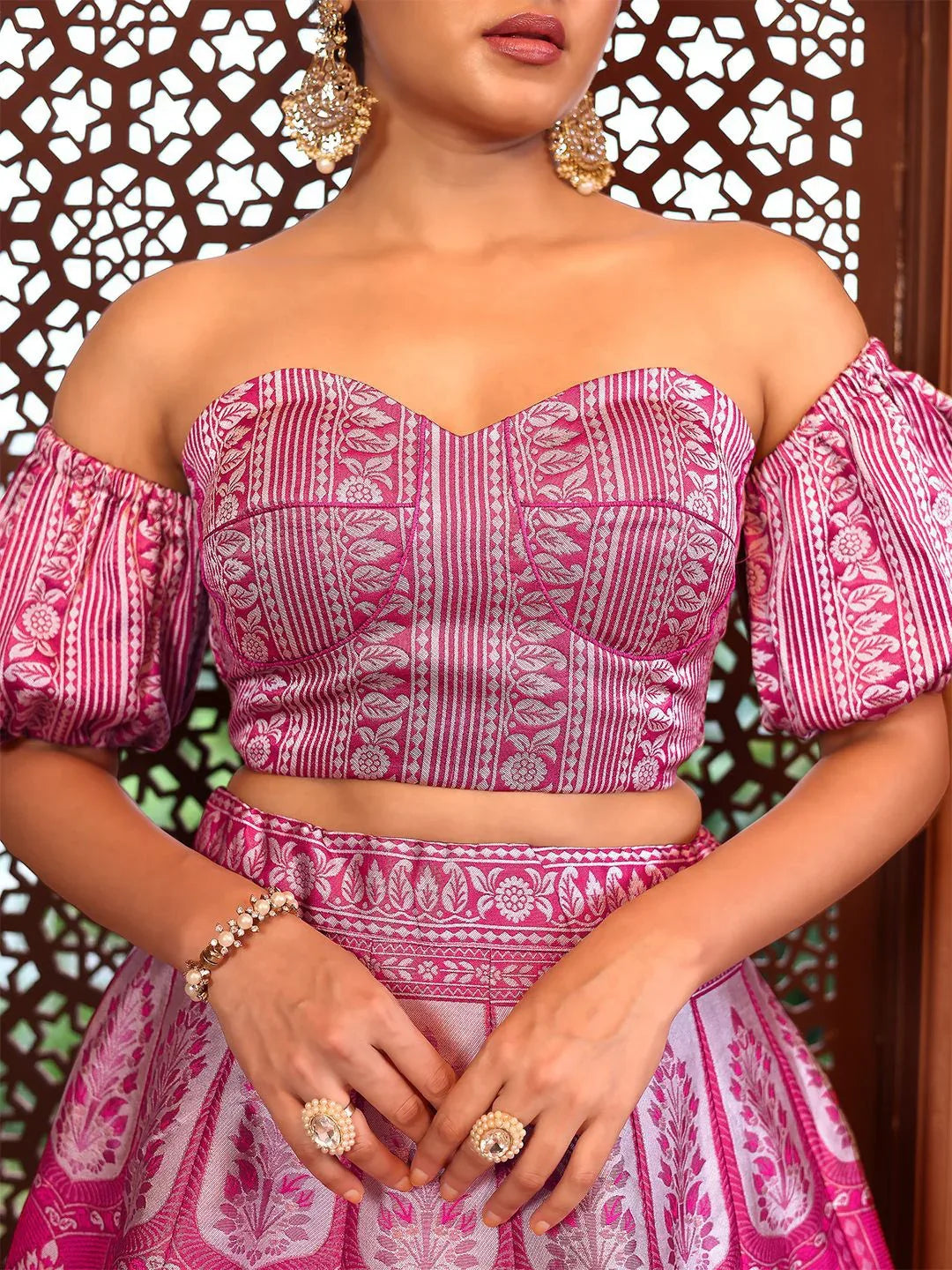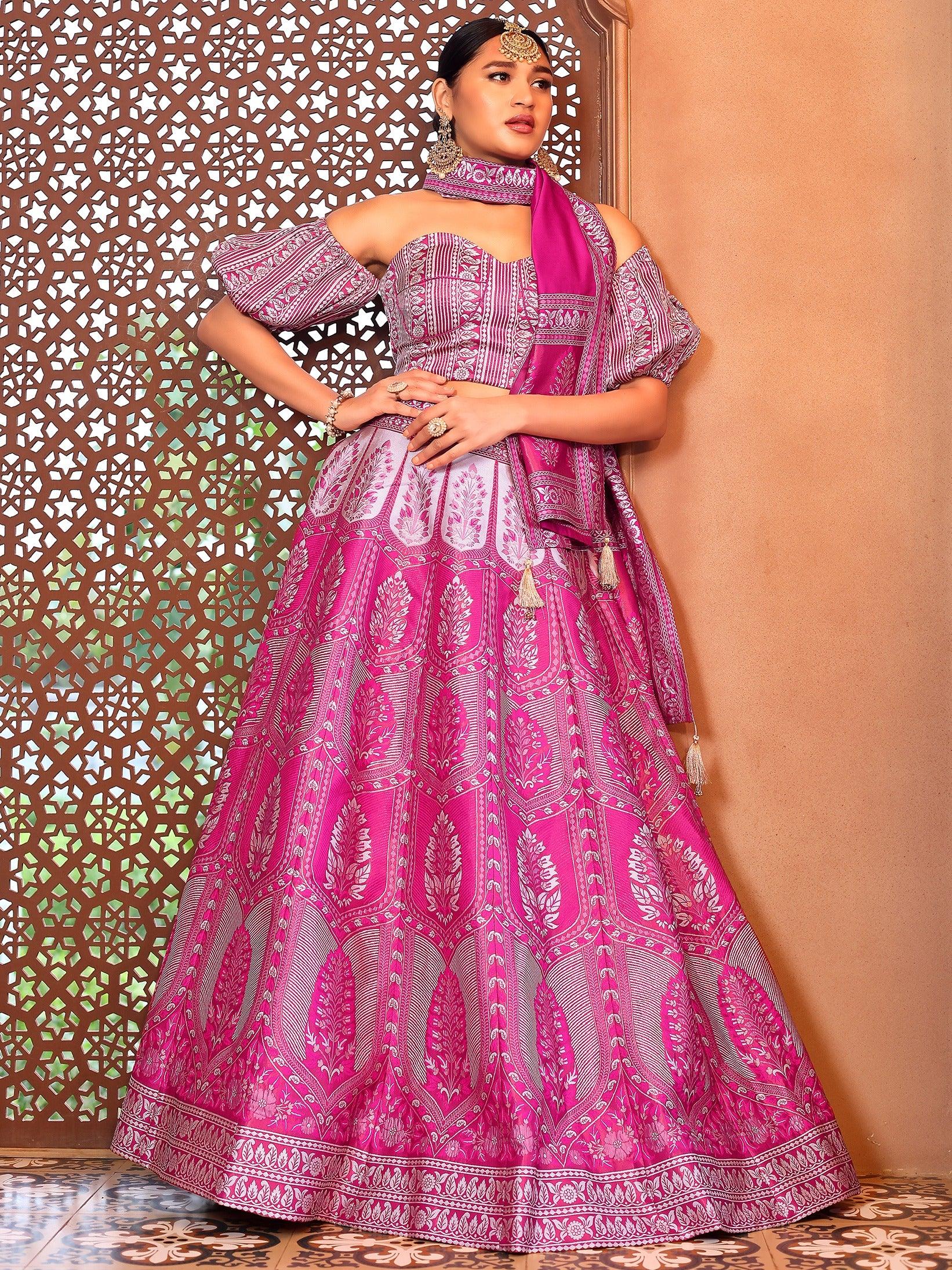 Infuse your wardrobe with royal vibrance in this Magenta and Lavender Ajrakh Print Lehenga Set. Crafted with folk-inspired motifs and a bold color palette, this ensemble features a bustier blouse with puff sleeves, a gracefully flared lehenga, and a matching printed dupatta.