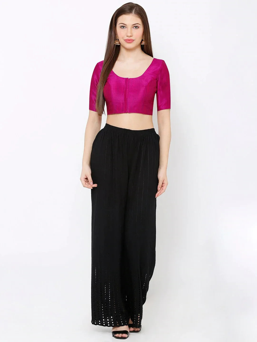 Turn heads with this stunning magenta readymade blouse featuring a deep scoop neckline and elegant elbow-length sleeves. Designed with a sleek front hook closure and tailored fit, it’s the perfect match for festive sarees and lehengas.
