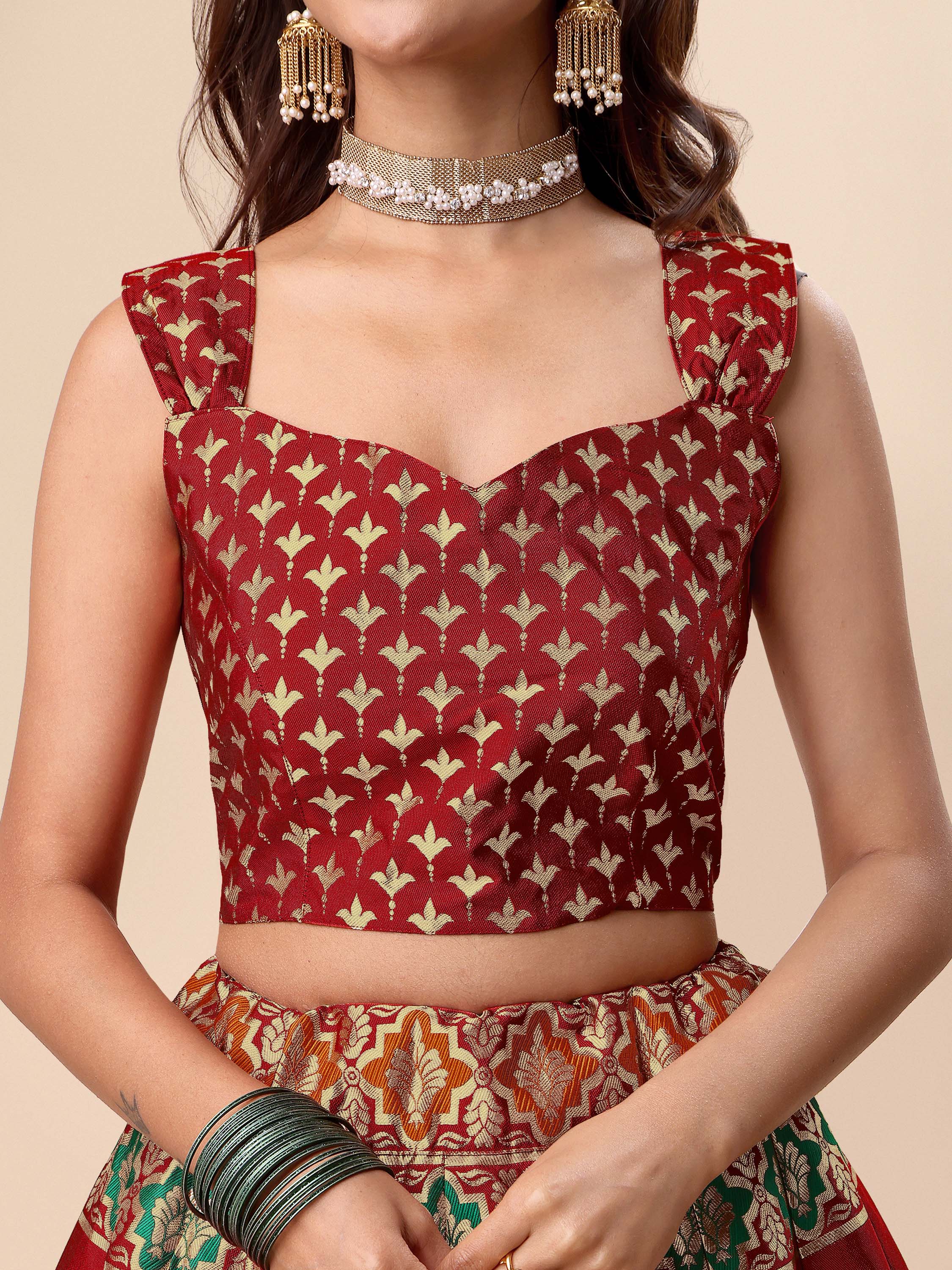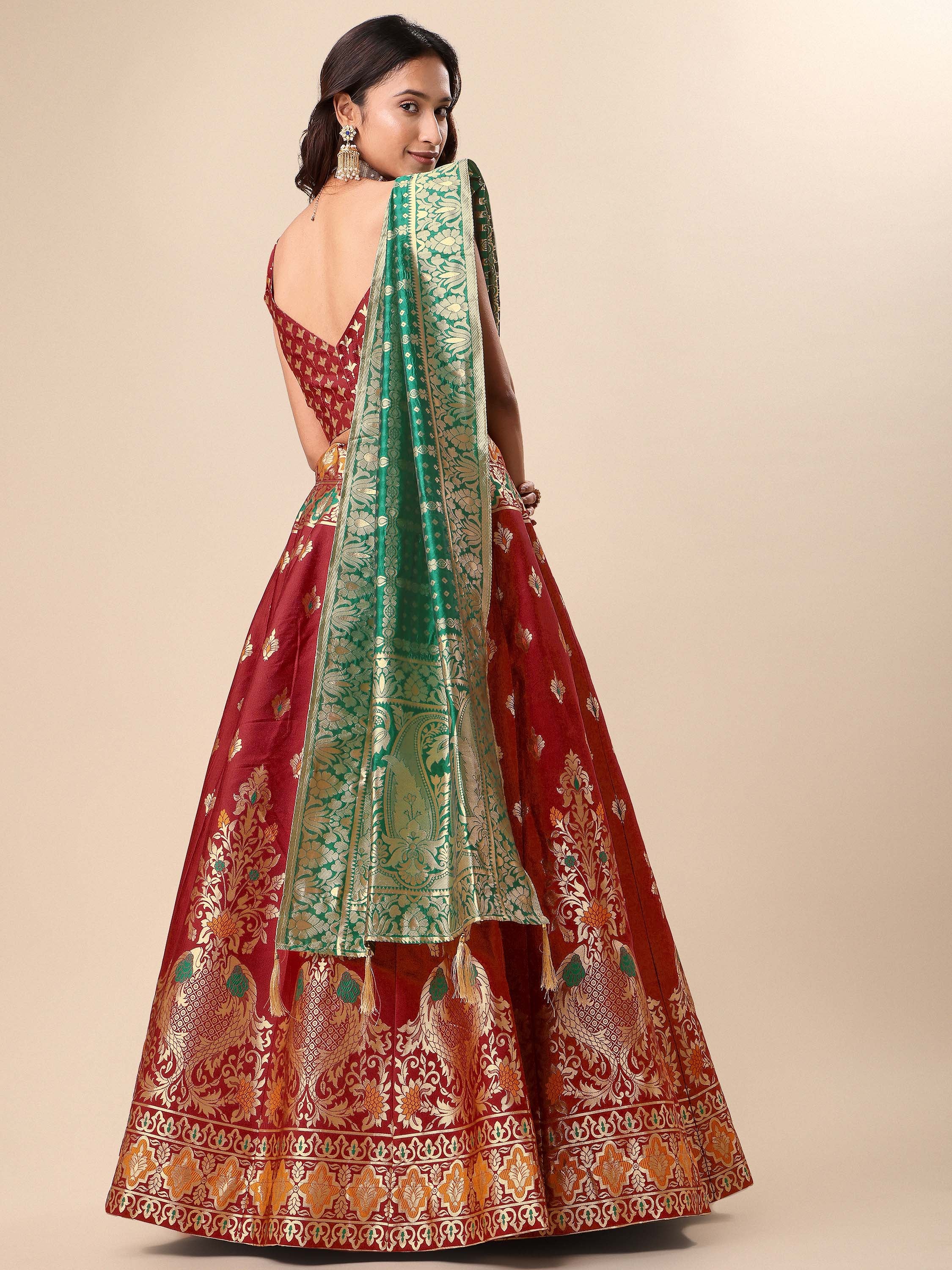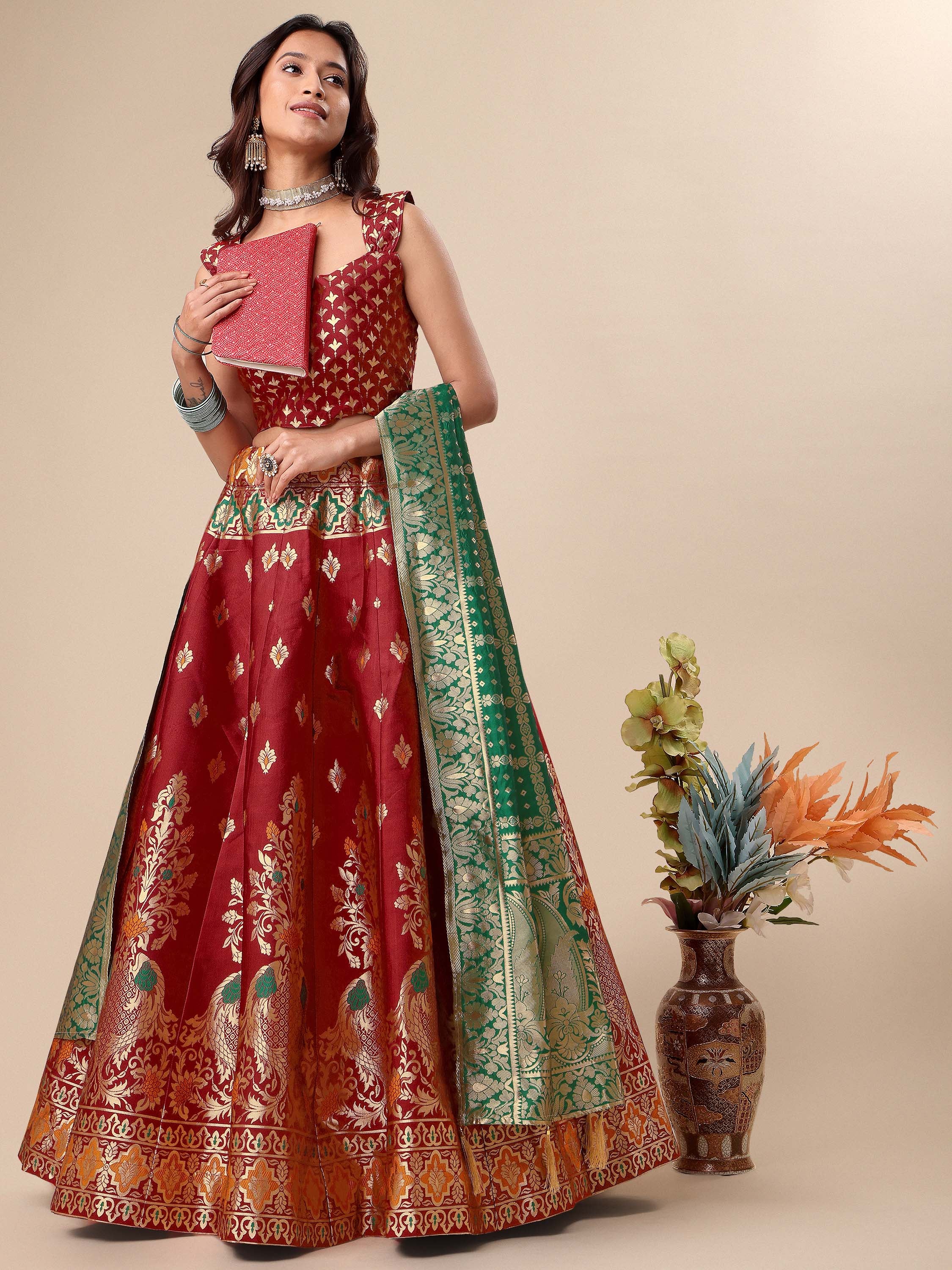 Elevate festive elegance with this exquisite Banarasi-inspired lehenga set. Crafted in a rich teal base with intricate gold woven motifs, the lehenga features a grand ornamental border that adds timeless charm. Paired with a structured brocade blouse and a vibrant Green woven dupatta, this ensemble blends tradition with refined modern style—perfect for weddings, festivals, and special celebrations.