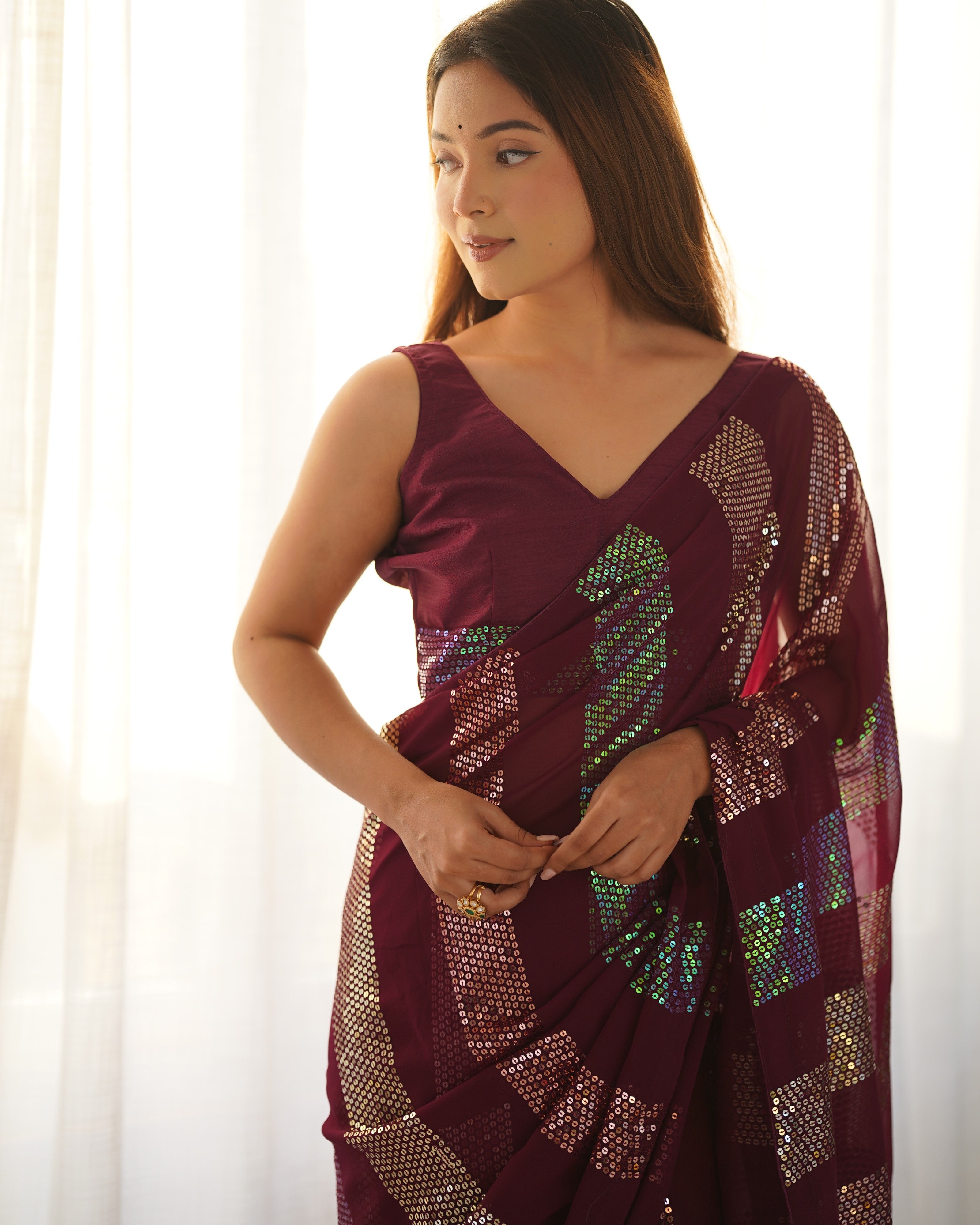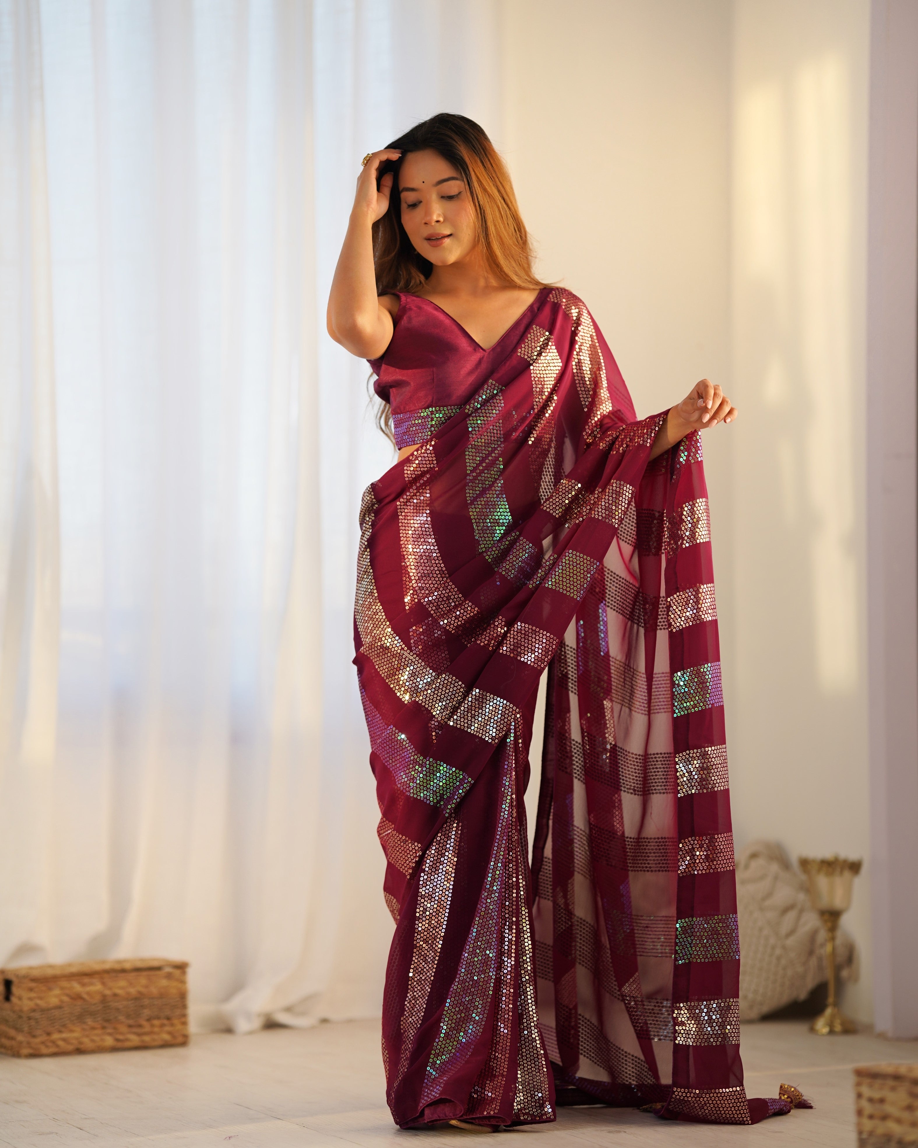 Turn heads at any celebration with our stunning Maroon sequin saree, designed for the modern diva who adores timeless elegance with a hint of shimmer. Crafted on soft net fabric, this saree features dazzling striped sequin embroidery that reflects light beautifully with every movement.