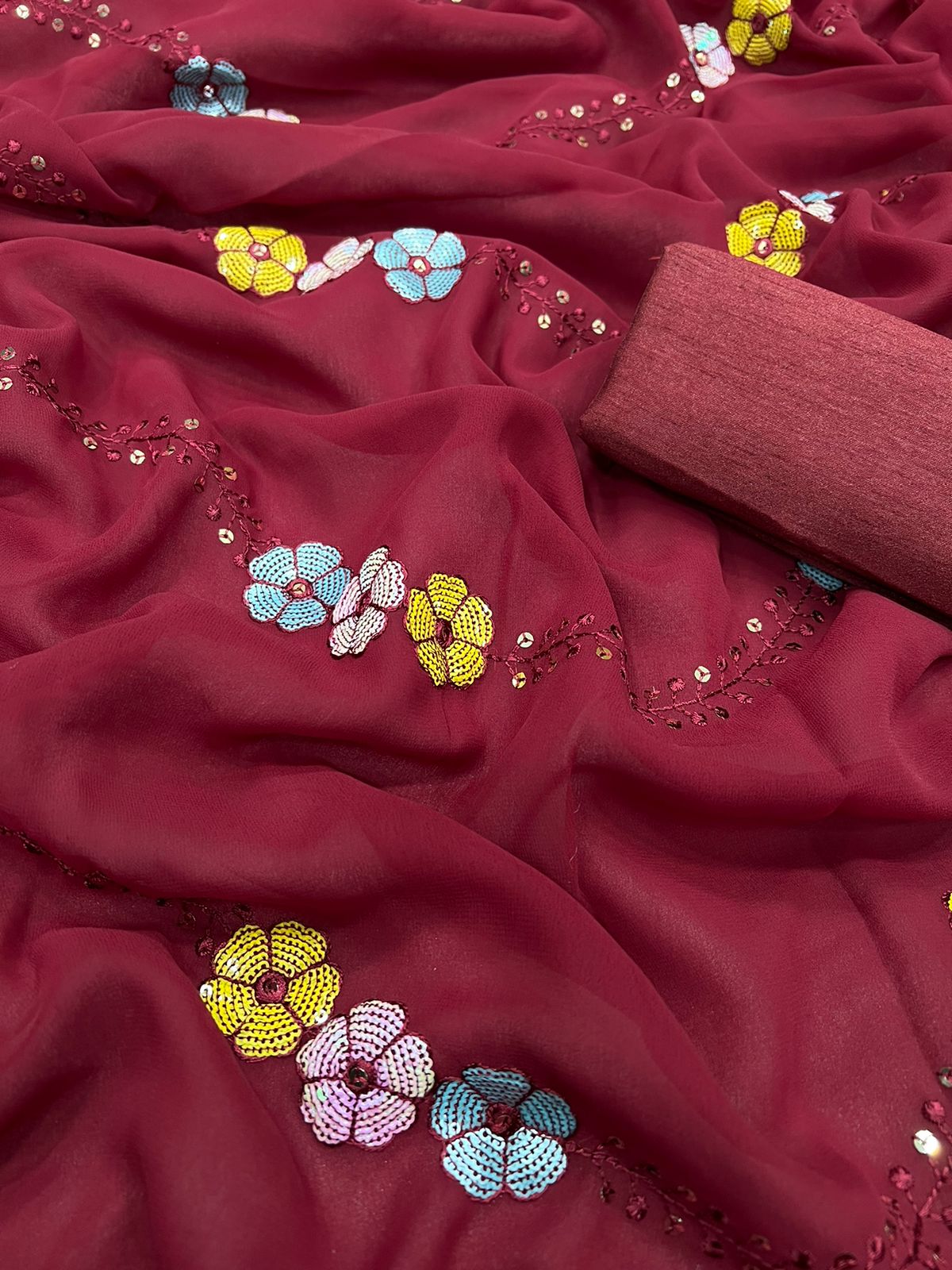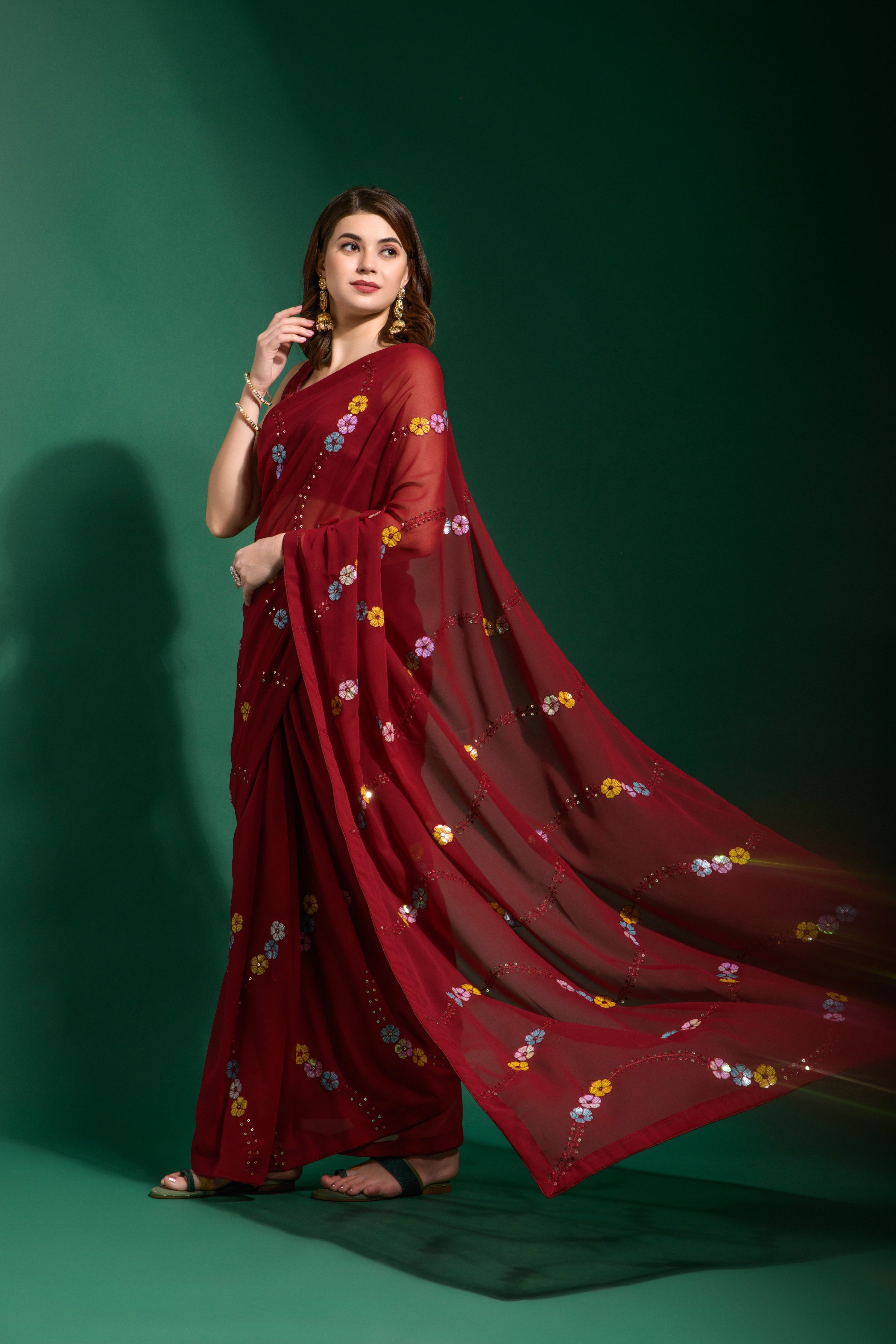 Bring vibrance and grace to your wardrobe with this Maroon Sheer Saree featuring delightful multicolor floral sequin embroidery. The lightweight drape and eye-catching detailing make it perfect for both festive days and evening affairs.