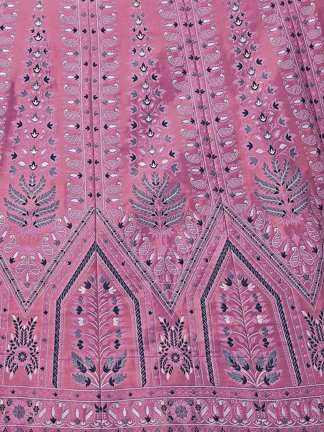 Embrace ethereal elegance with our Meher Pink Lehenga Set, crafted in opulent Banarasi silk and adorned with intricate brocade work. The soft pastel pink hue enhanced with silver and sage green motifs makes it a stunning choice for daytime weddings or festive celebrations. A graceful dupatta completes this timeless ensemble.