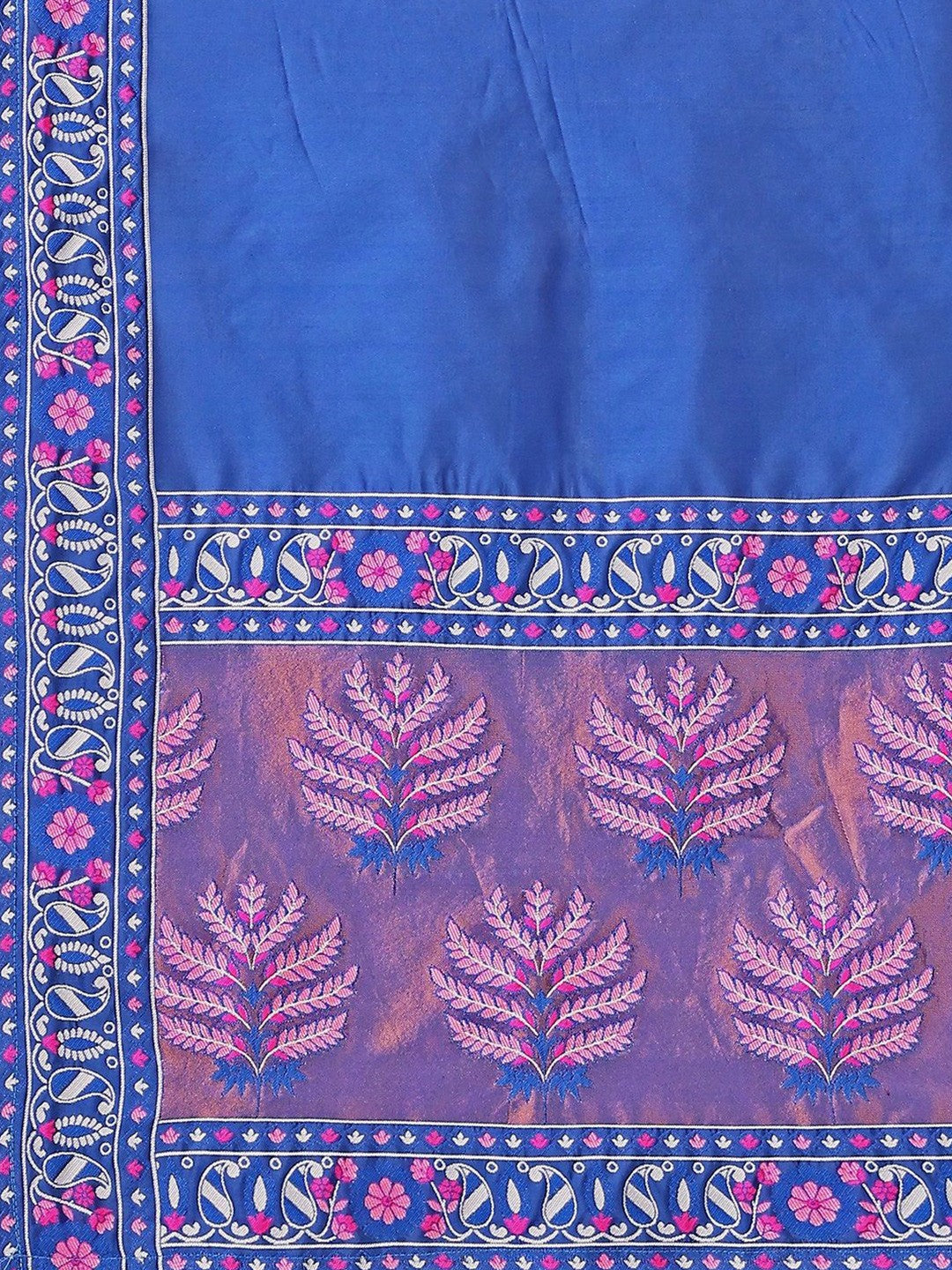 Elevate your festive style with the dazzling Meher Royal Blue Lehenga Set. Crafted from luxurious Banarasi silk, this ensemble features a radiant blue base enriched with magenta and pink woven detailing. The intricately designed lehenga, paired with a classic square-neck blouse and an elegant dupatta, offers the perfect blend of boldness and tradition.