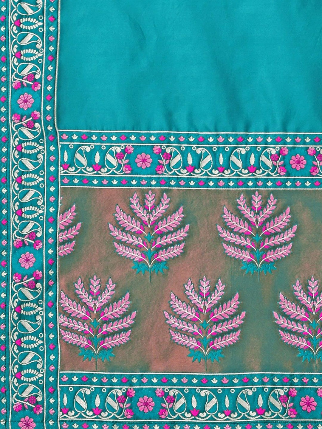 Channel your inner grace with this exquisite Meher Teal Green Lehenga Set. Crafted from pure Banarasi silk, the rich green hue is complemented by intricate woven patterns in pink and blue, exuding a luxurious ethnic appeal. The structured blouse, flared lehenga, and coordinated dupatta come together in a timeless design perfect for festive celebrations.