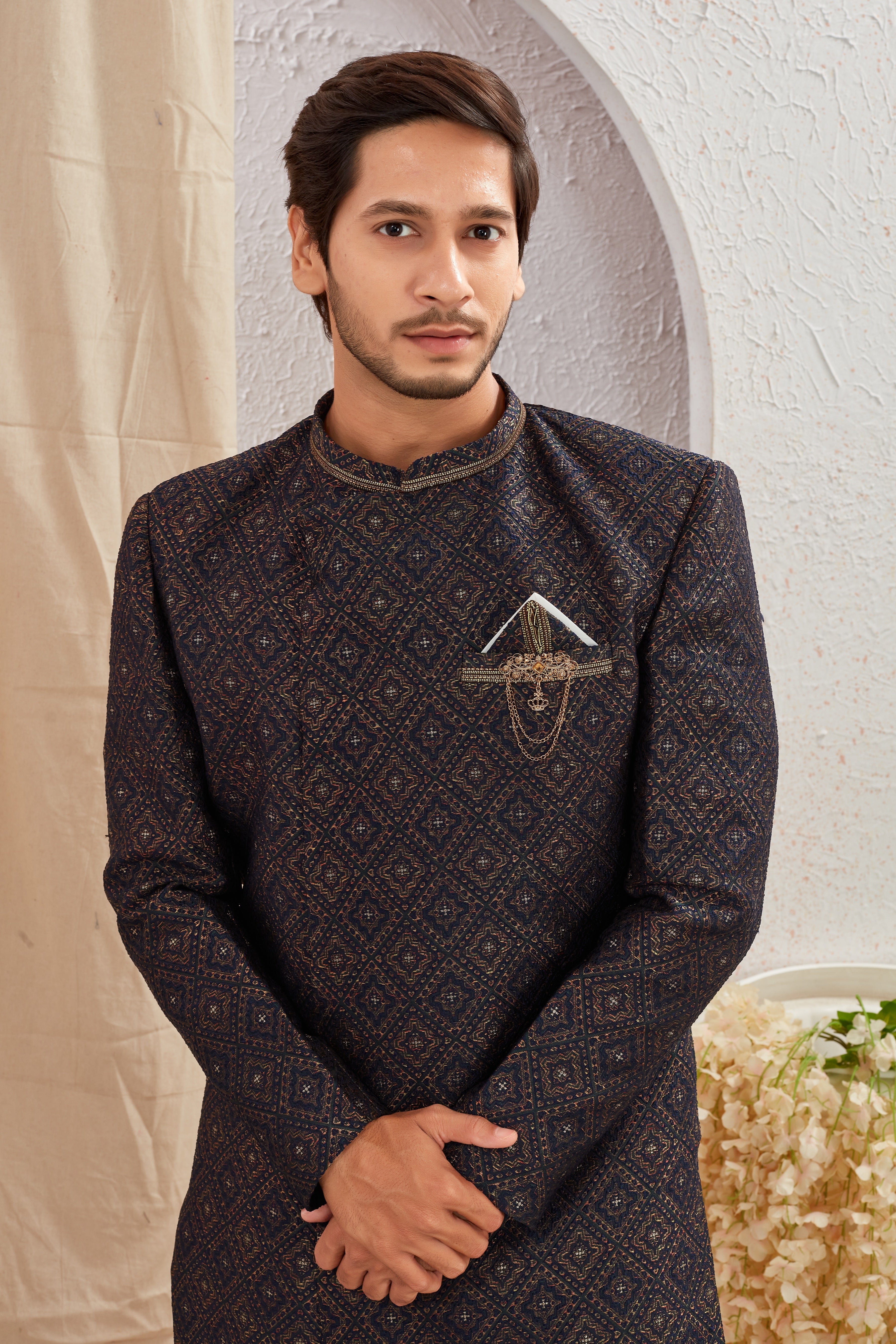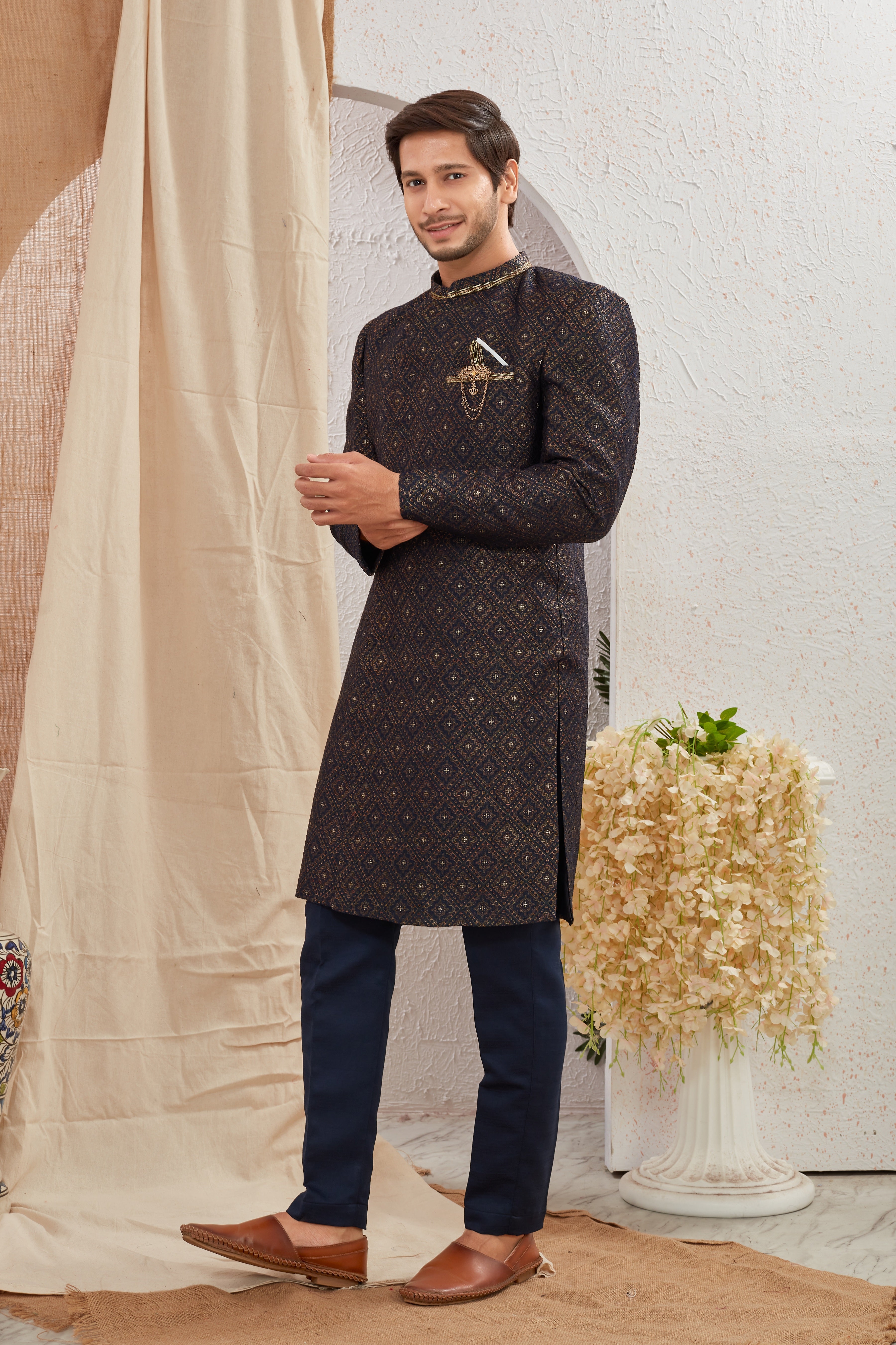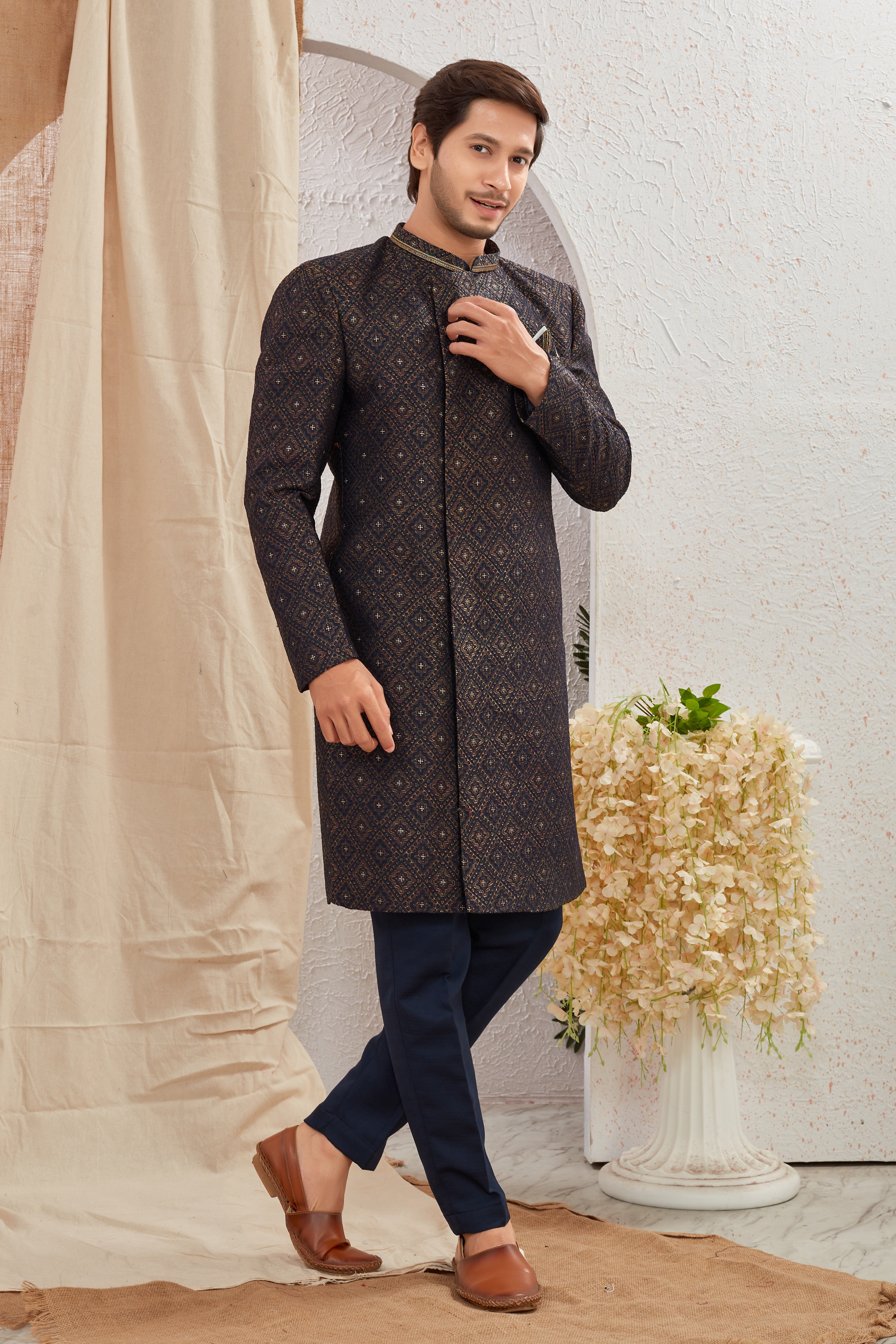 Elevate your ethnic style with our Designer Black & Navy Blue Asymmetric Sherwani featuring unique diagonal button styling and detailed textured patterns. Paired with crisp Navy Blue churidar pants, this ensemble offers a bold and regal look for weddings, receptions, and special occasions.