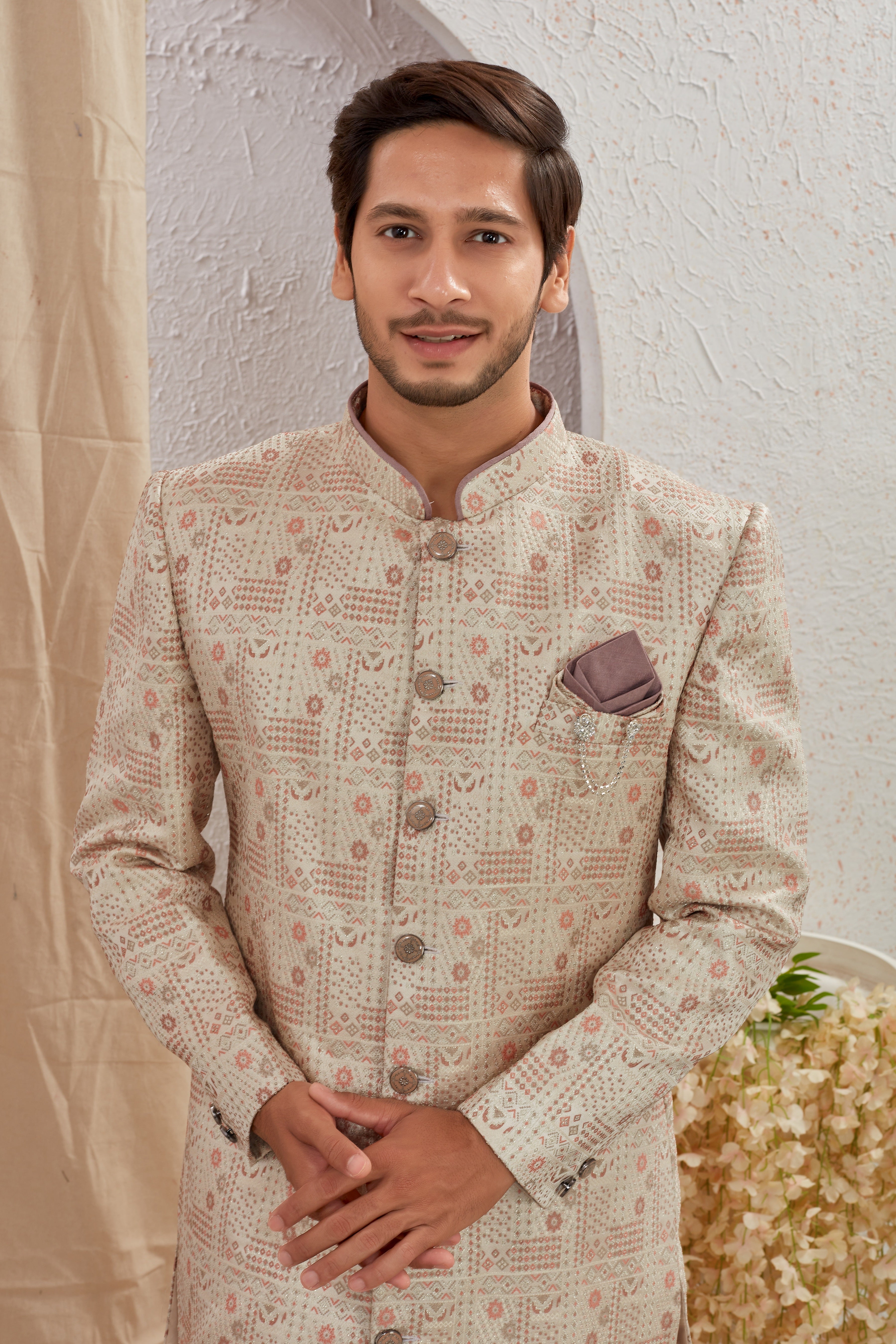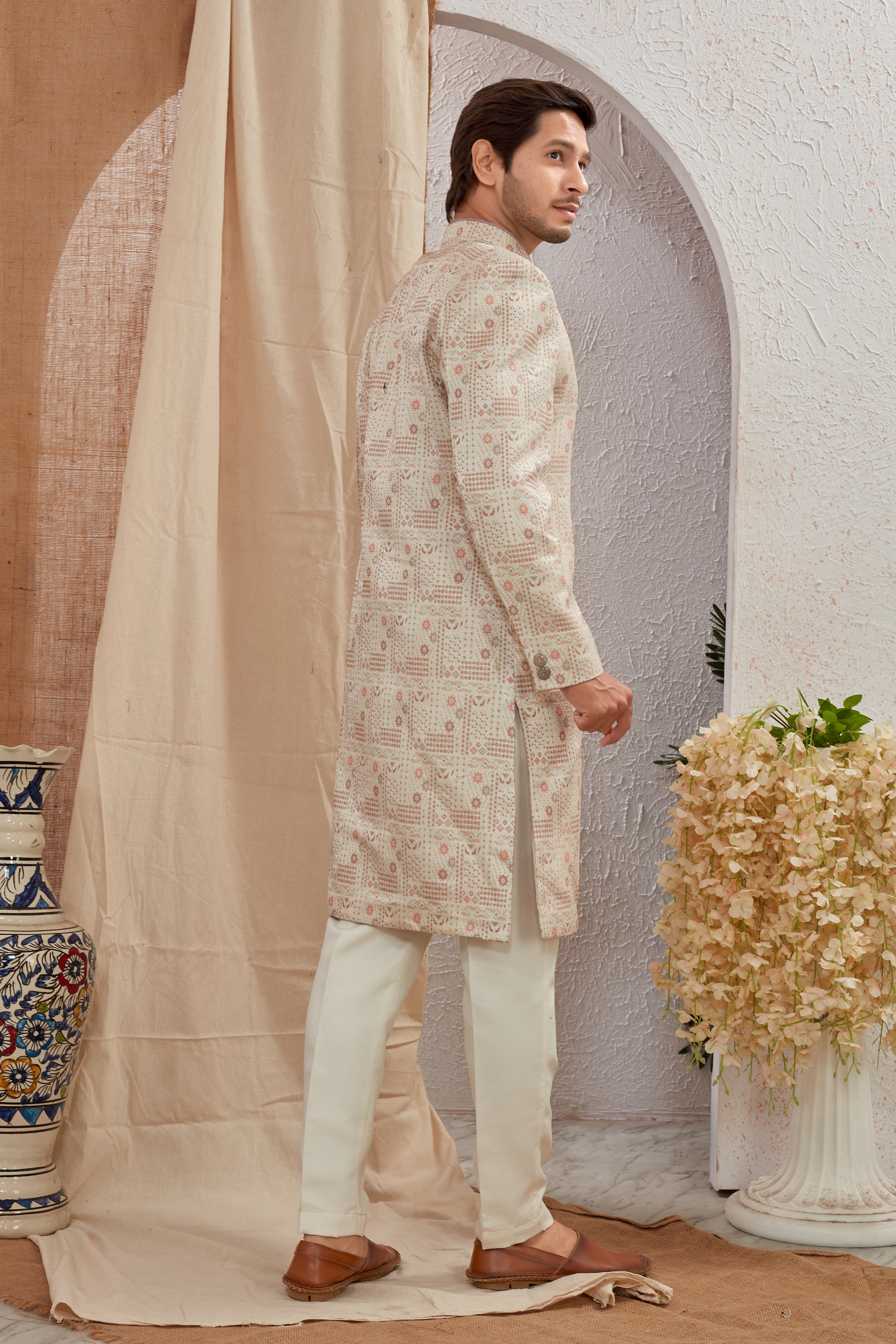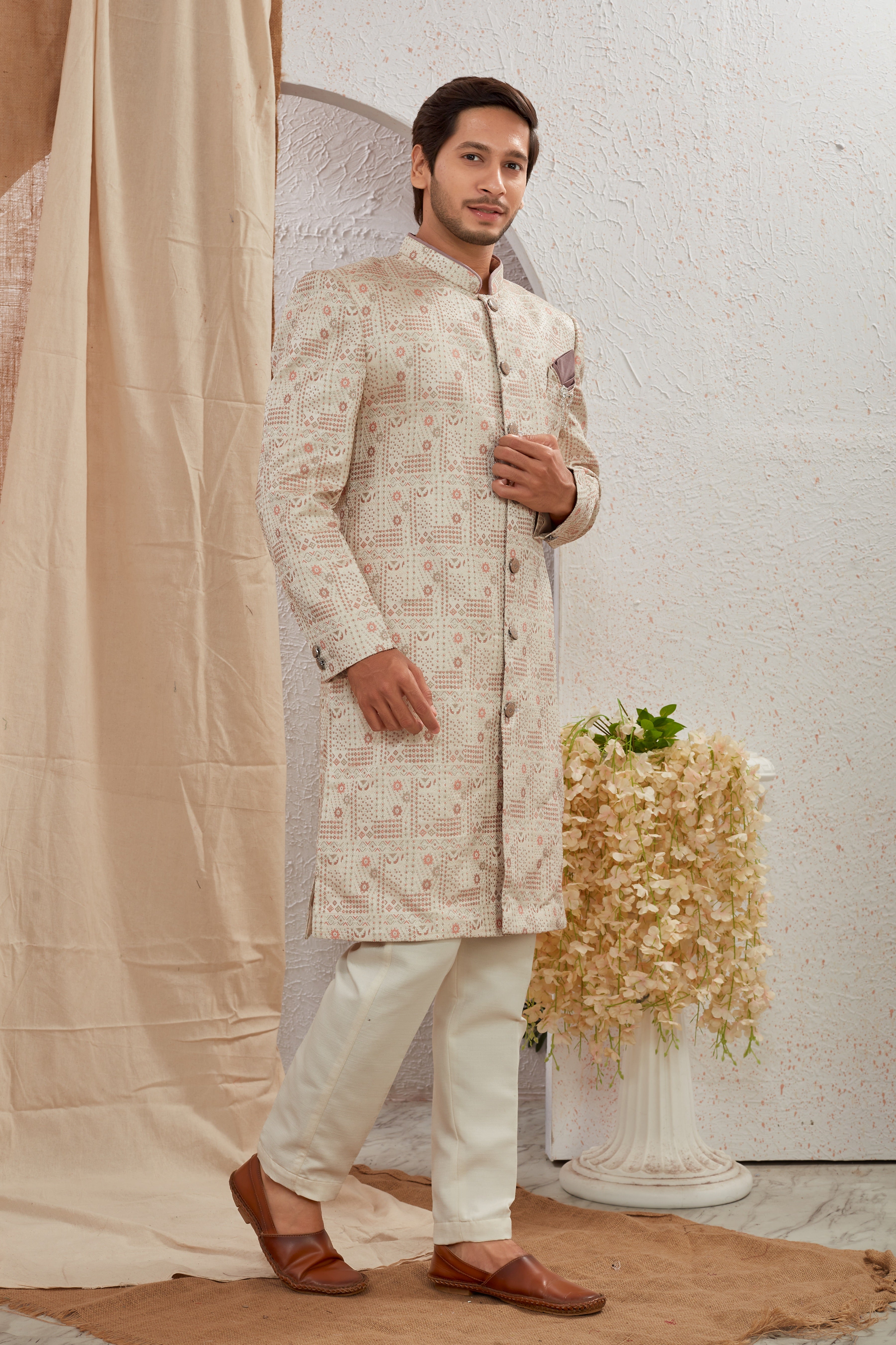 Elevate your ethnic style with our Designer Multicolor Asymmetric Sherwani featuring unique diagonal button styling and detailed textured patterns. Paired with crisp white churidar pants, this ensemble offers a bold and regal look for weddings, receptions, and special occasions.