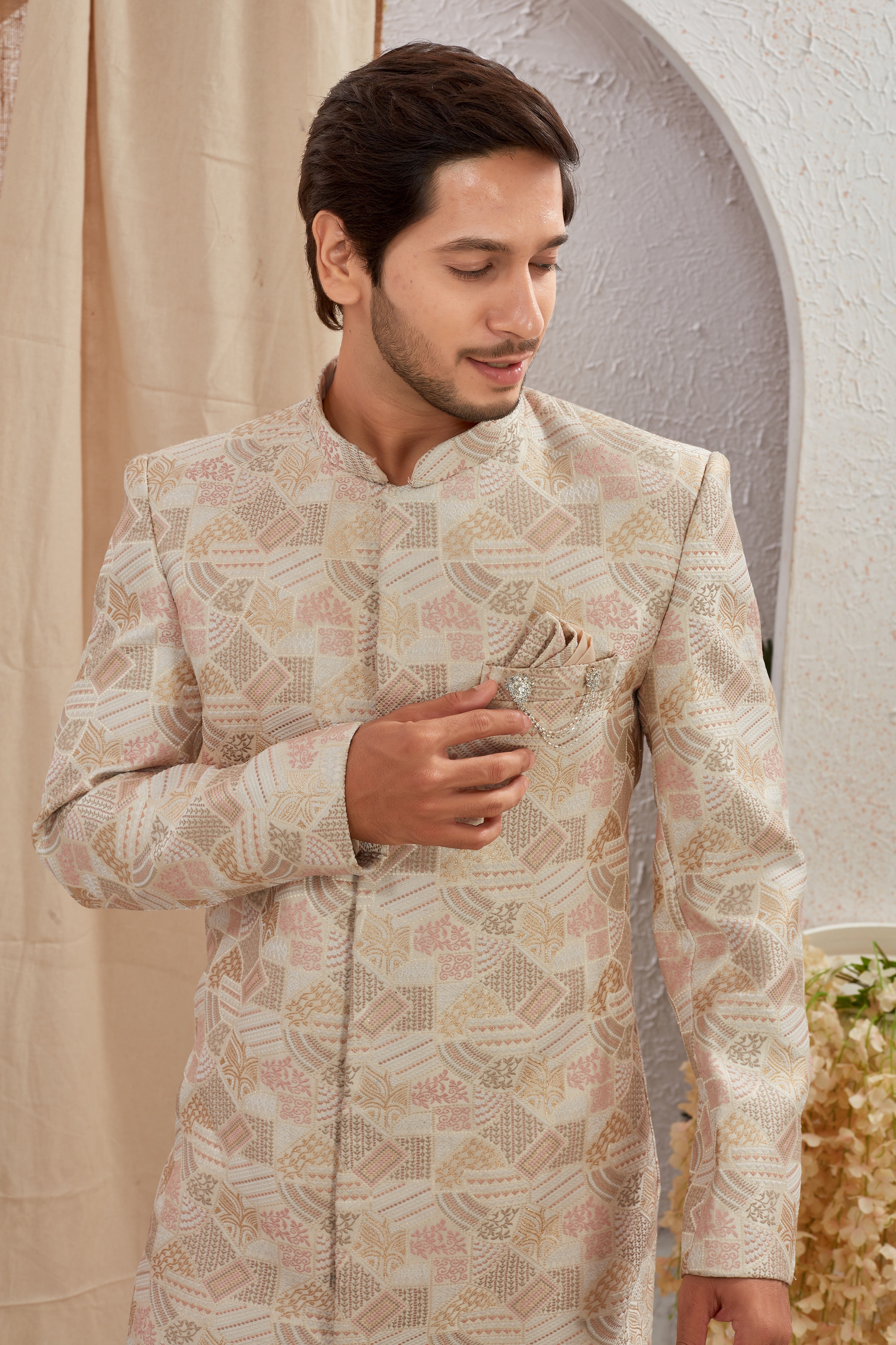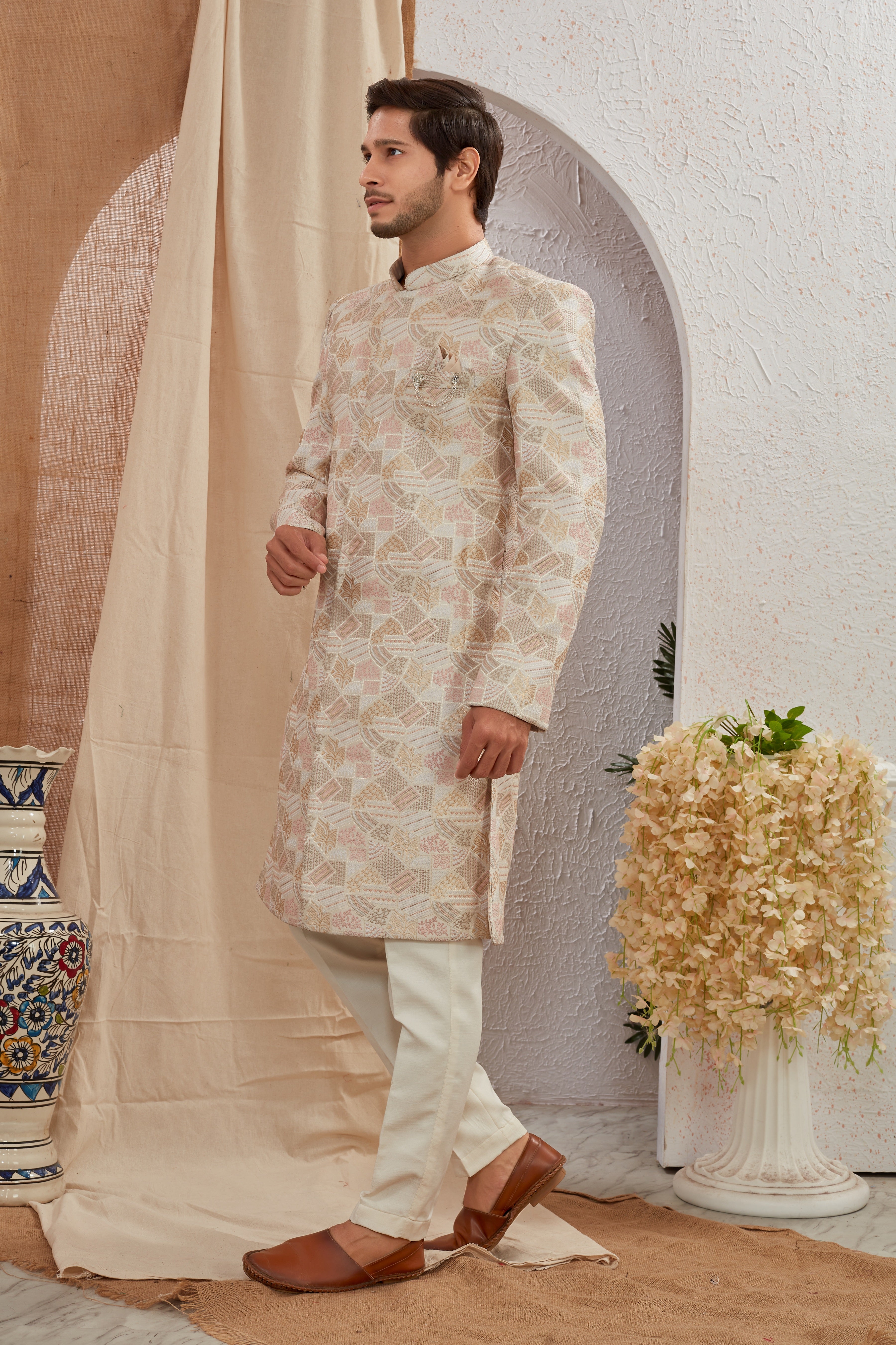 Elevate your ethnic style with our Designer Cream Asymmetric Sherwani featuring unique diagonal button styling and detailed textured patterns. Paired with crisp white churidar pants, this ensemble offers a bold and regal look for weddings, receptions, and special occasions.