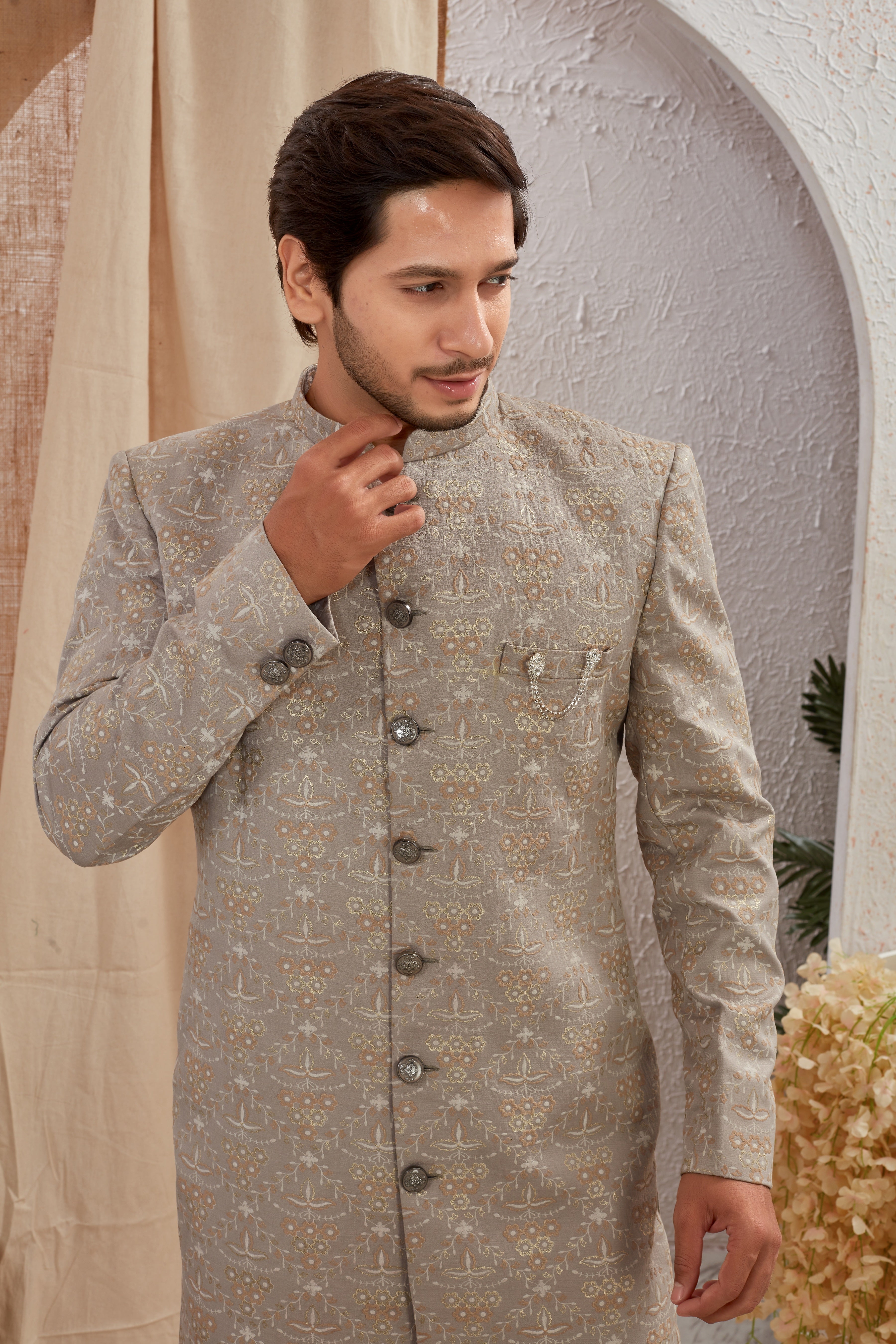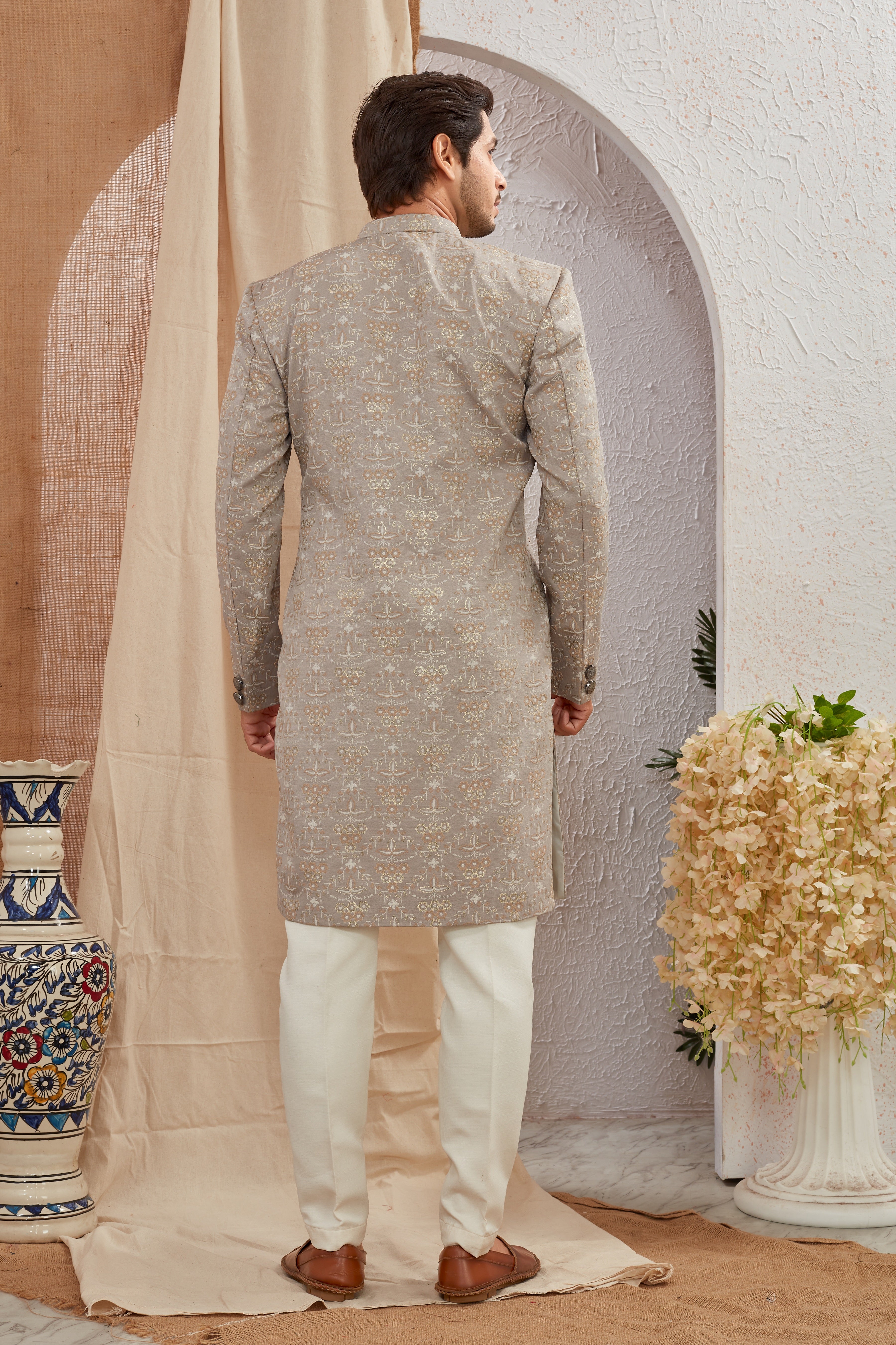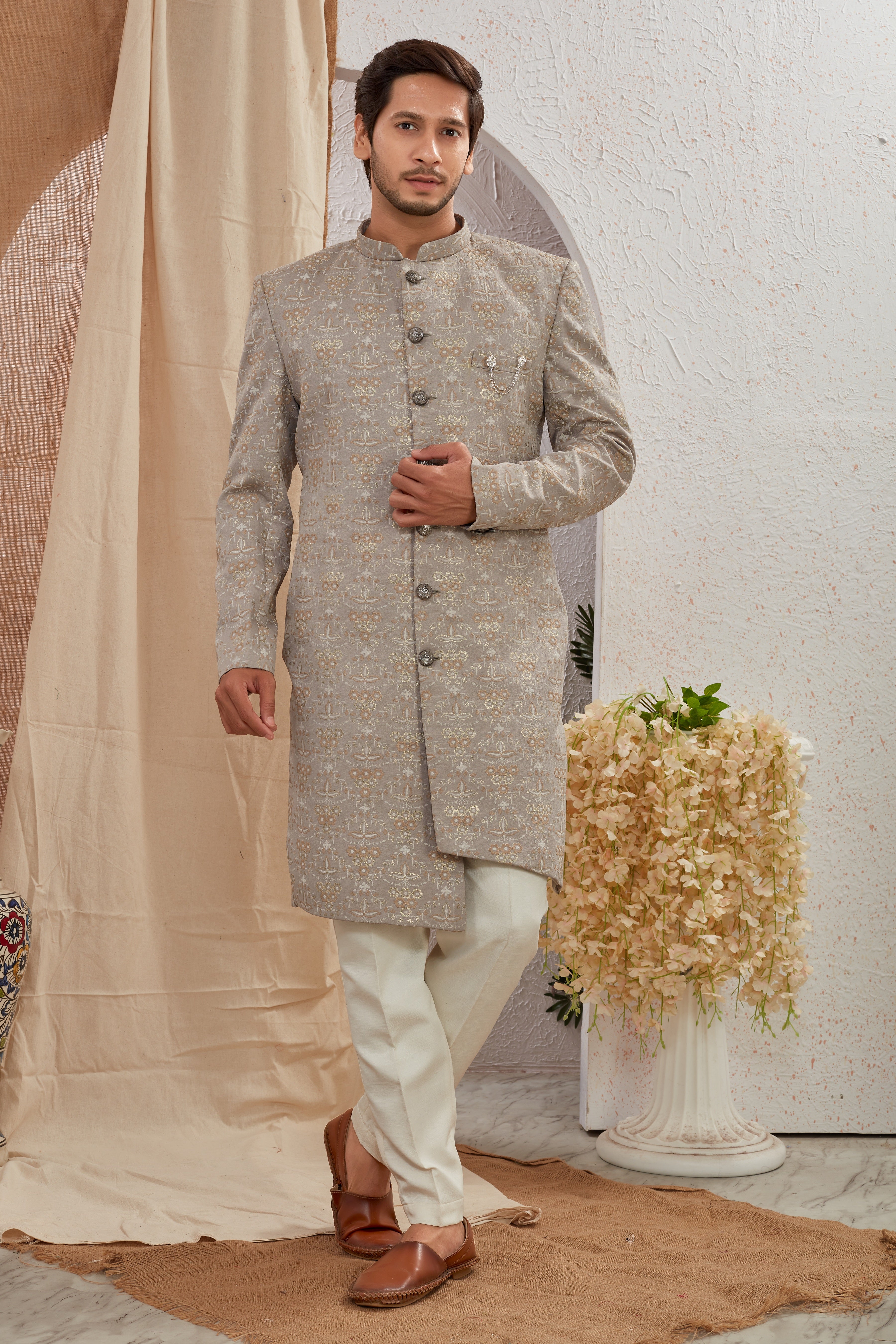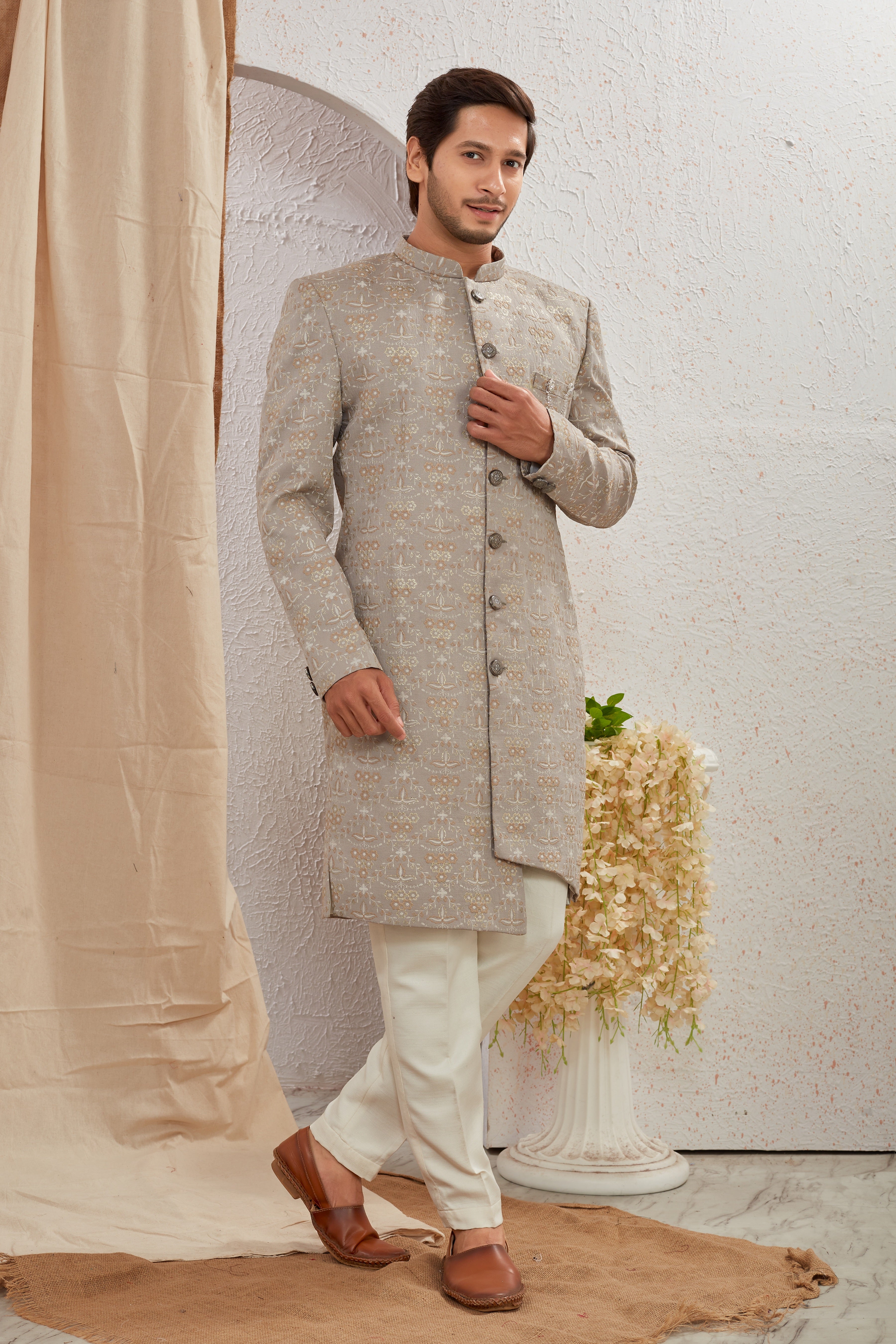 Elevate your ethnic style with our Designer Grey Asymmetric Sherwani featuring unique diagonal button styling and detailed textured patterns. Paired with crisp white churidar pants, this ensemble offers a bold and regal look for weddings, receptions, and special occasions.