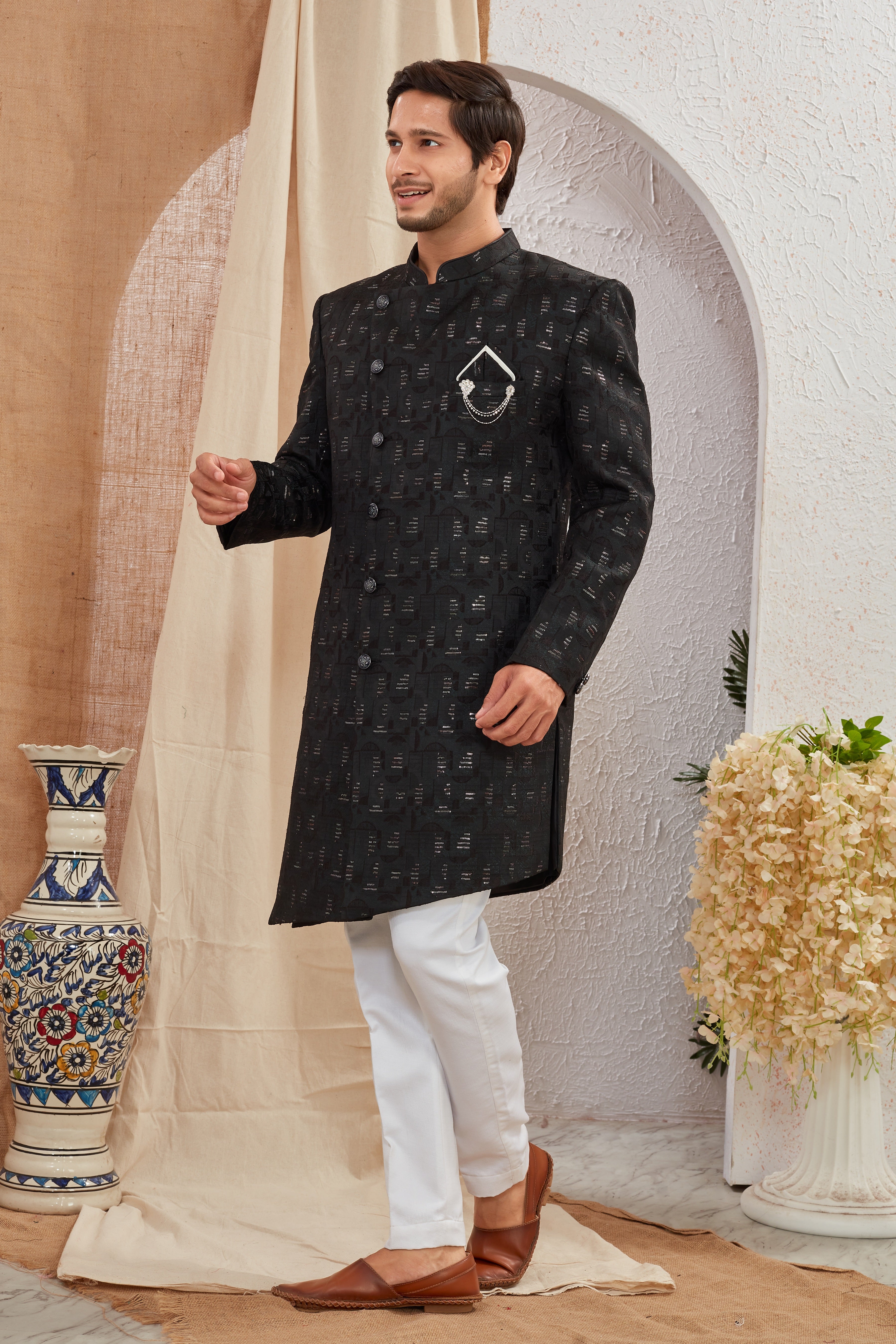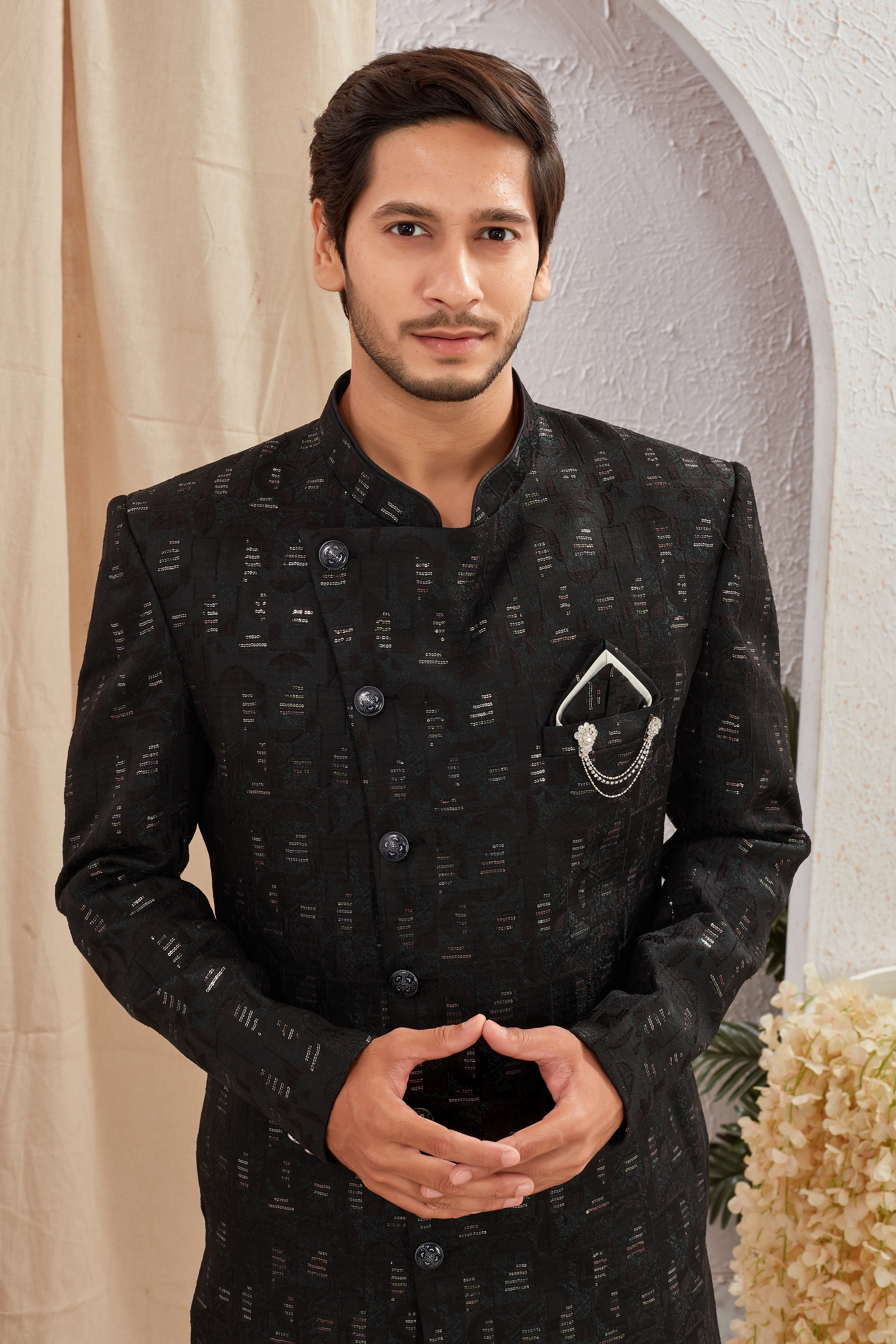 Elevate your ethnic style with our Designer Black Asymmetric Sherwani featuring unique diagonal button styling and detailed textured patterns. Paired with crisp white churidar pants, this ensemble offers a bold and regal look for weddings, receptions, and special occasions.
