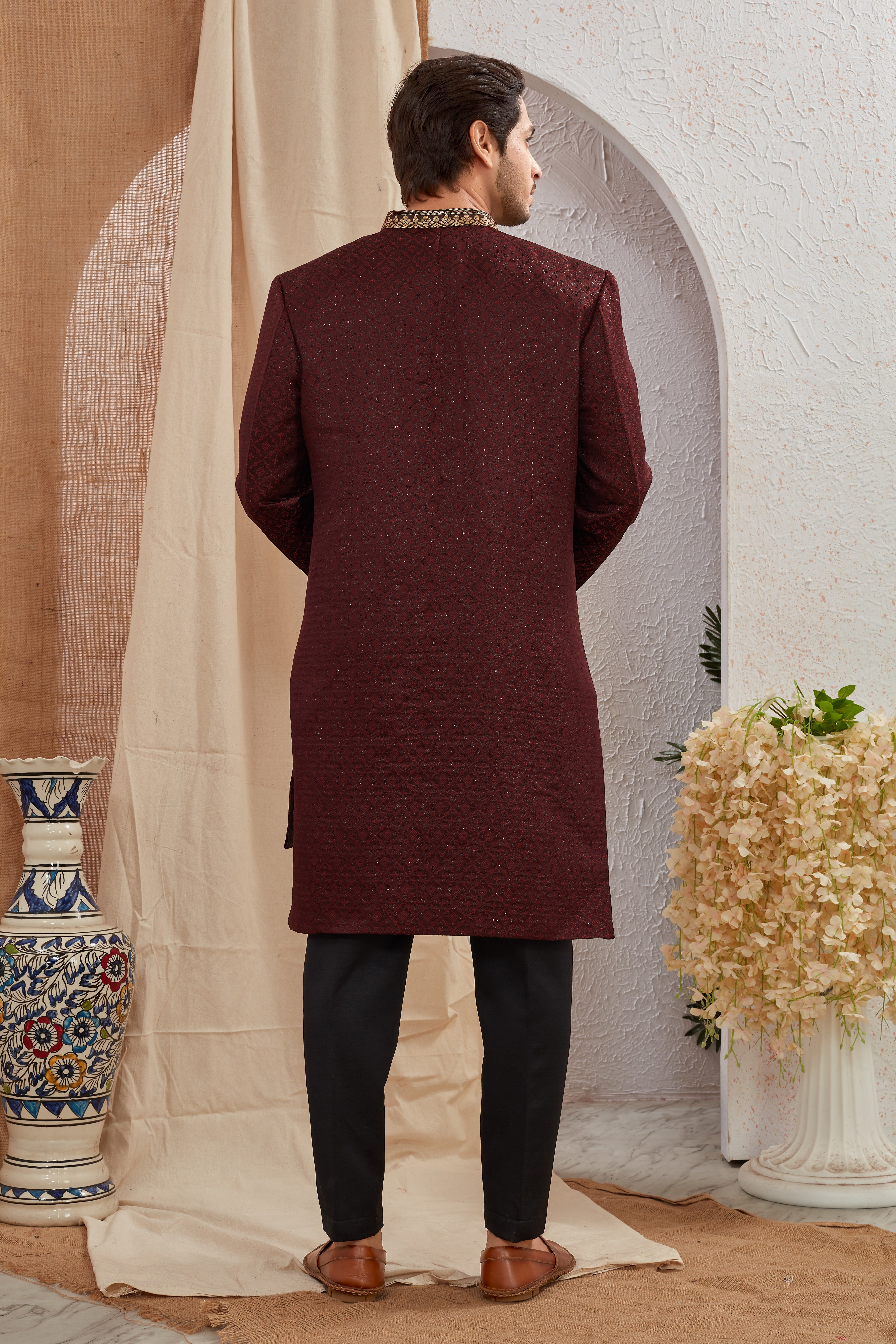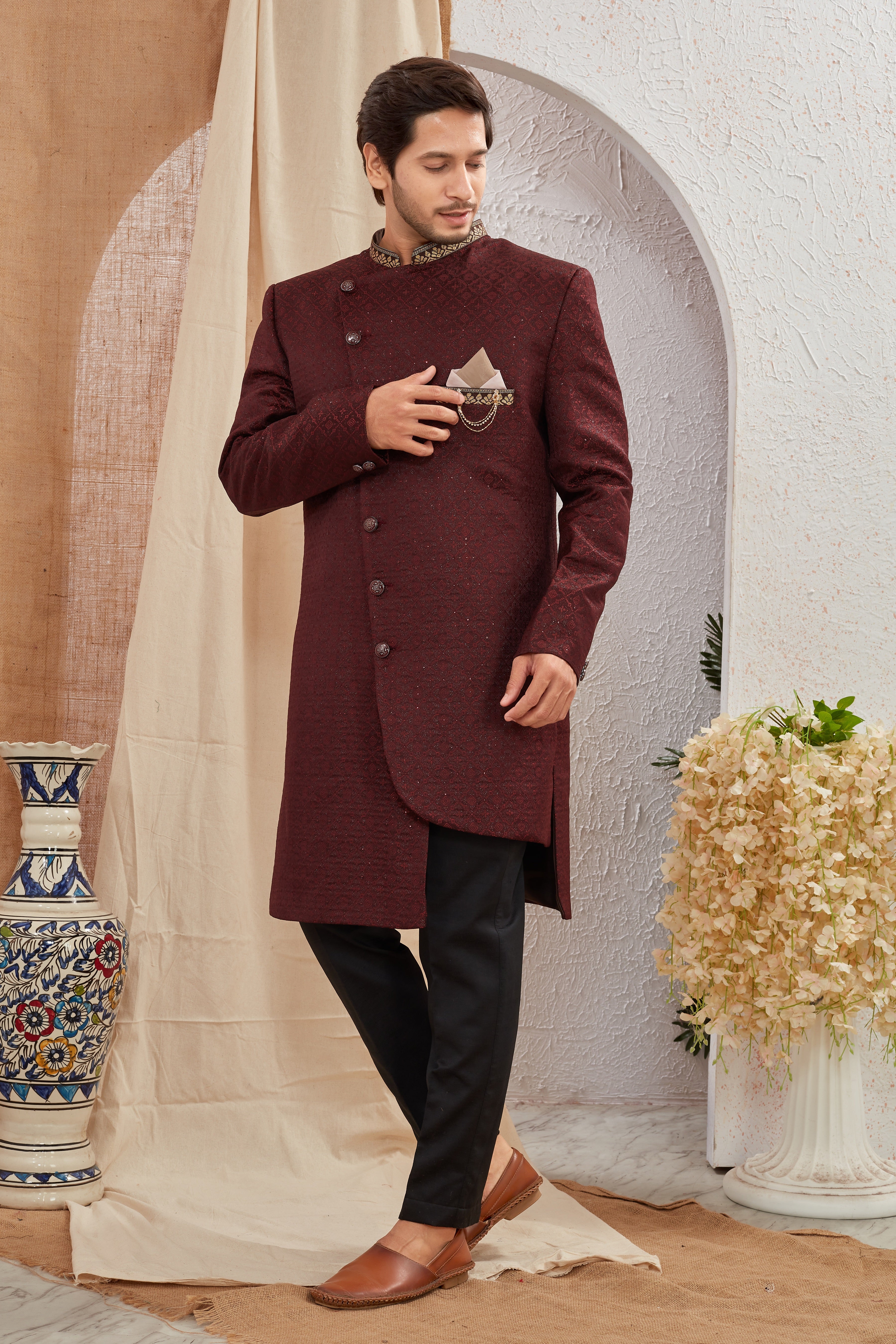 Elevate your ethnic style with our Designer Maroon Asymmetric Sherwani featuring unique diagonal button styling and detailed textured patterns. Paired with crisp Black churidar pants, this ensemble offers a bold and regal look for weddings, receptions, and special occasions.