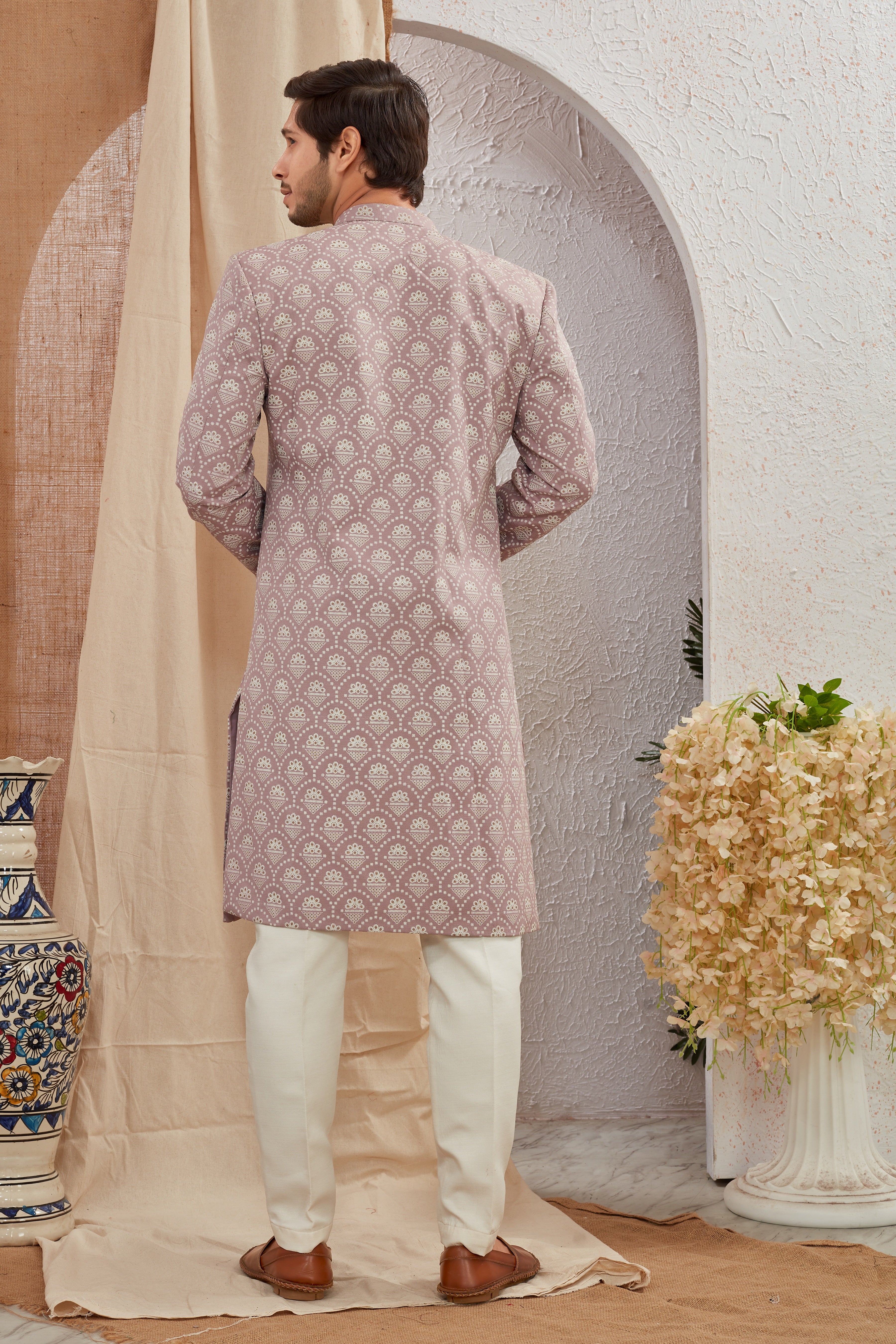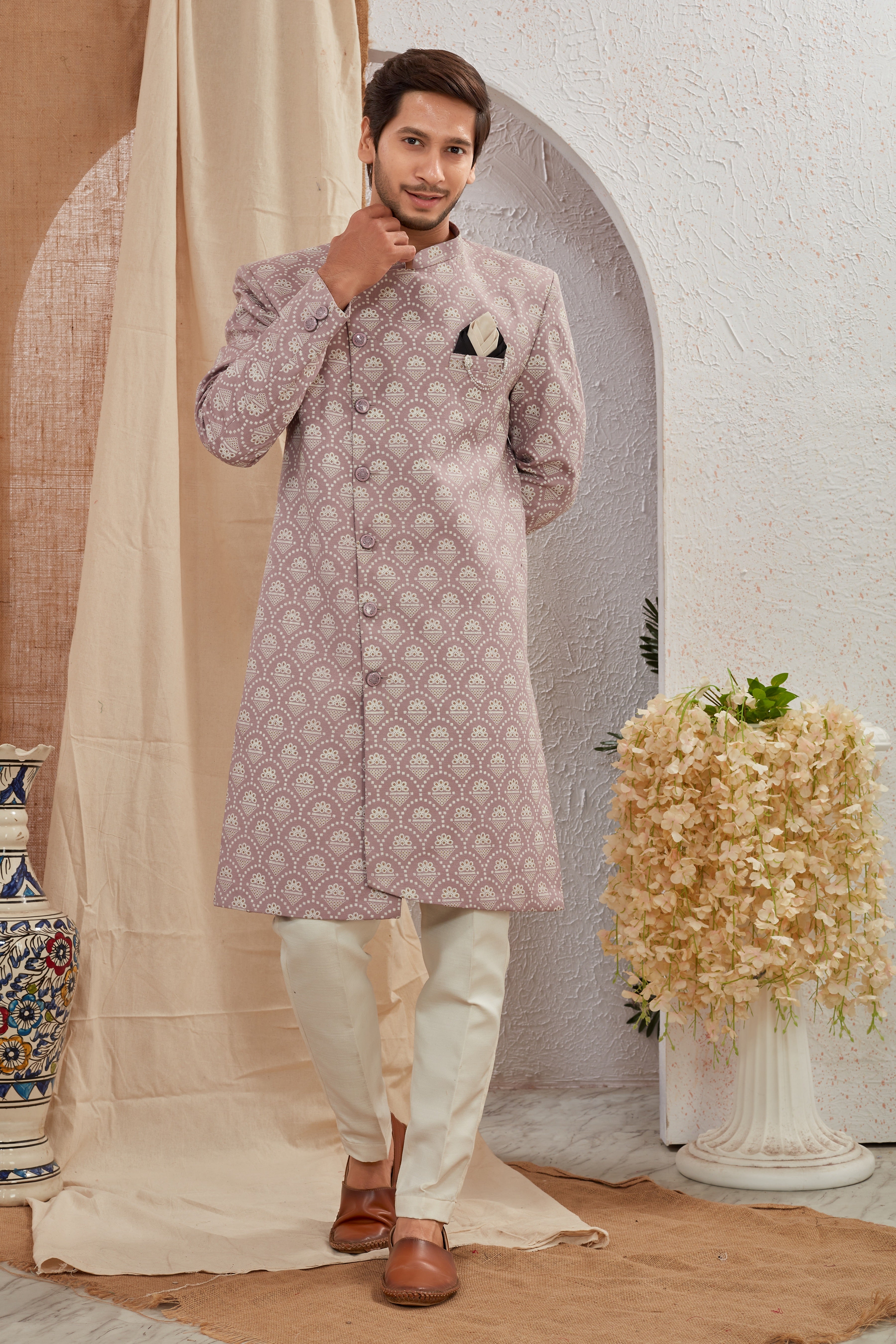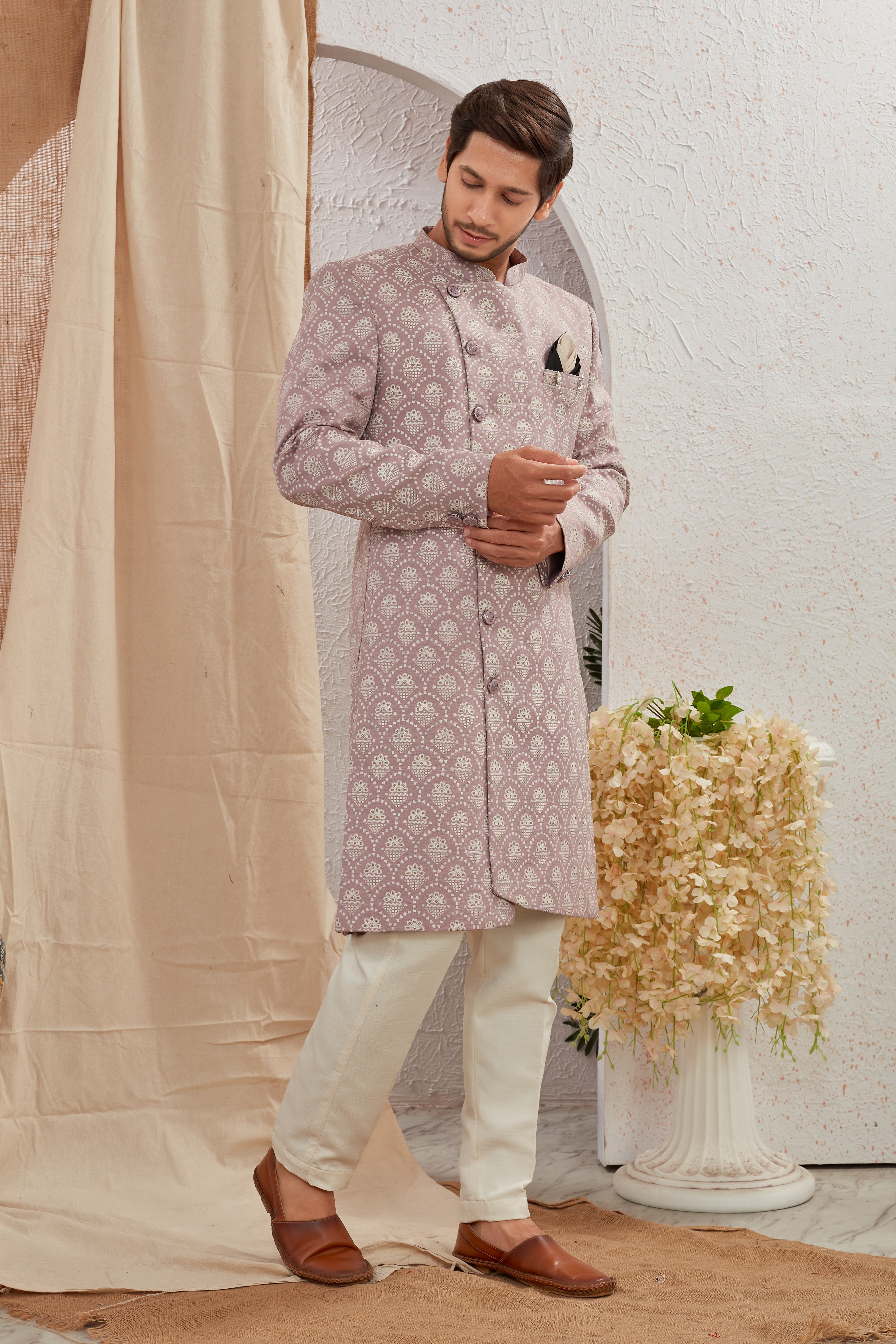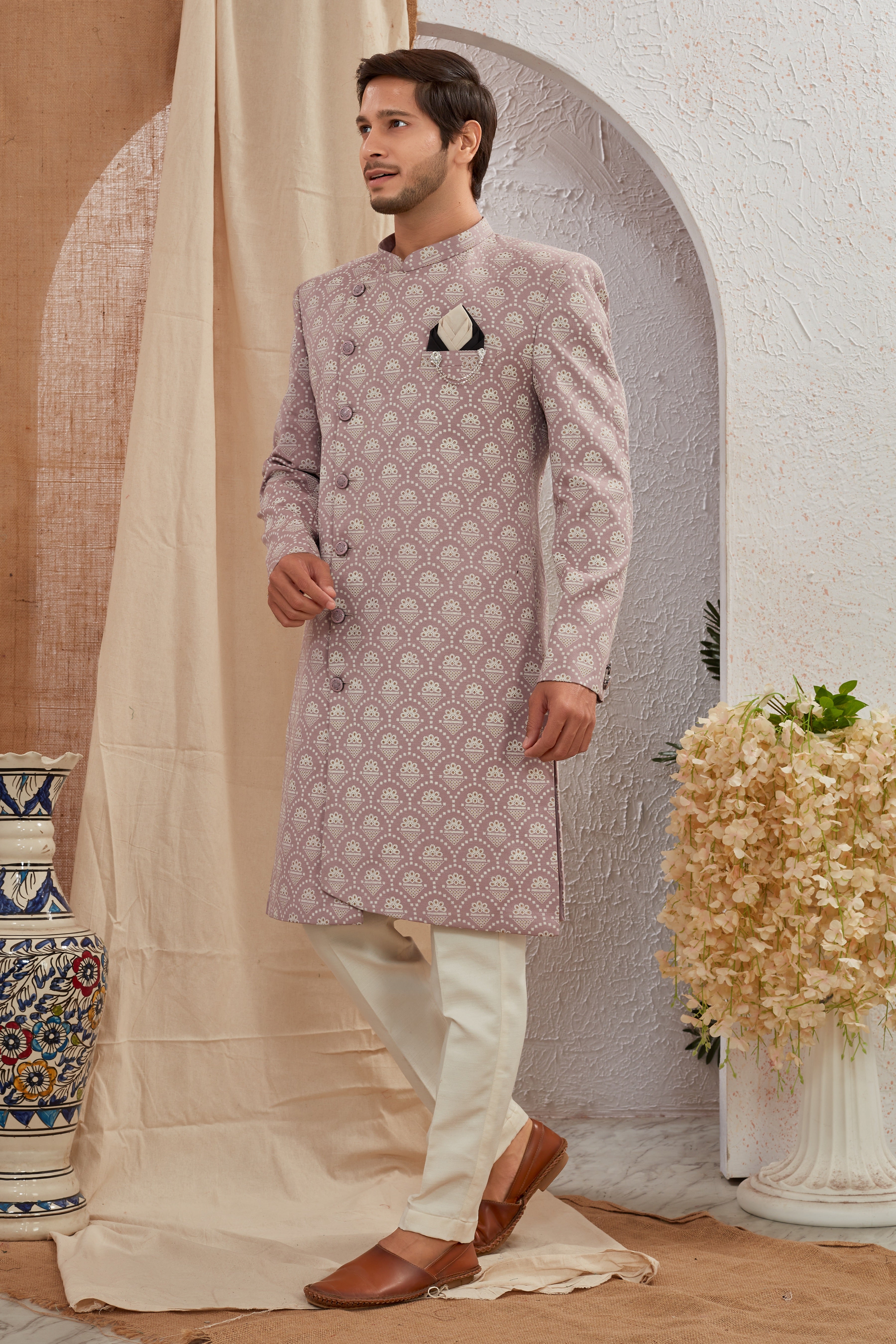Elevate your ethnic style with our Designer Onion Pink Asymmetric Sherwani featuring unique diagonal button styling and detailed textured patterns. Paired with crisp white churidar pants, this ensemble offers a bold and regal look for weddings, receptions, and special occasions.