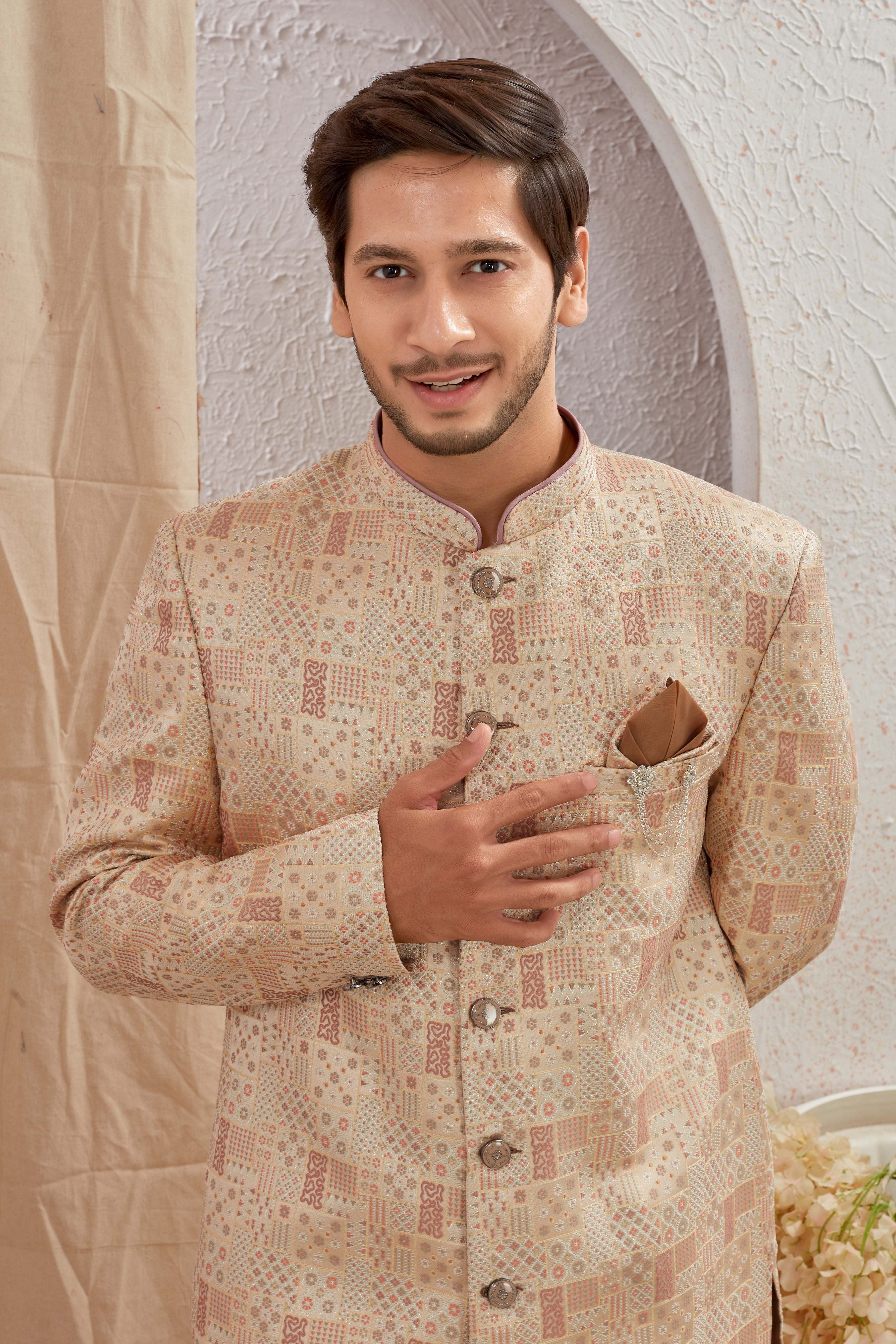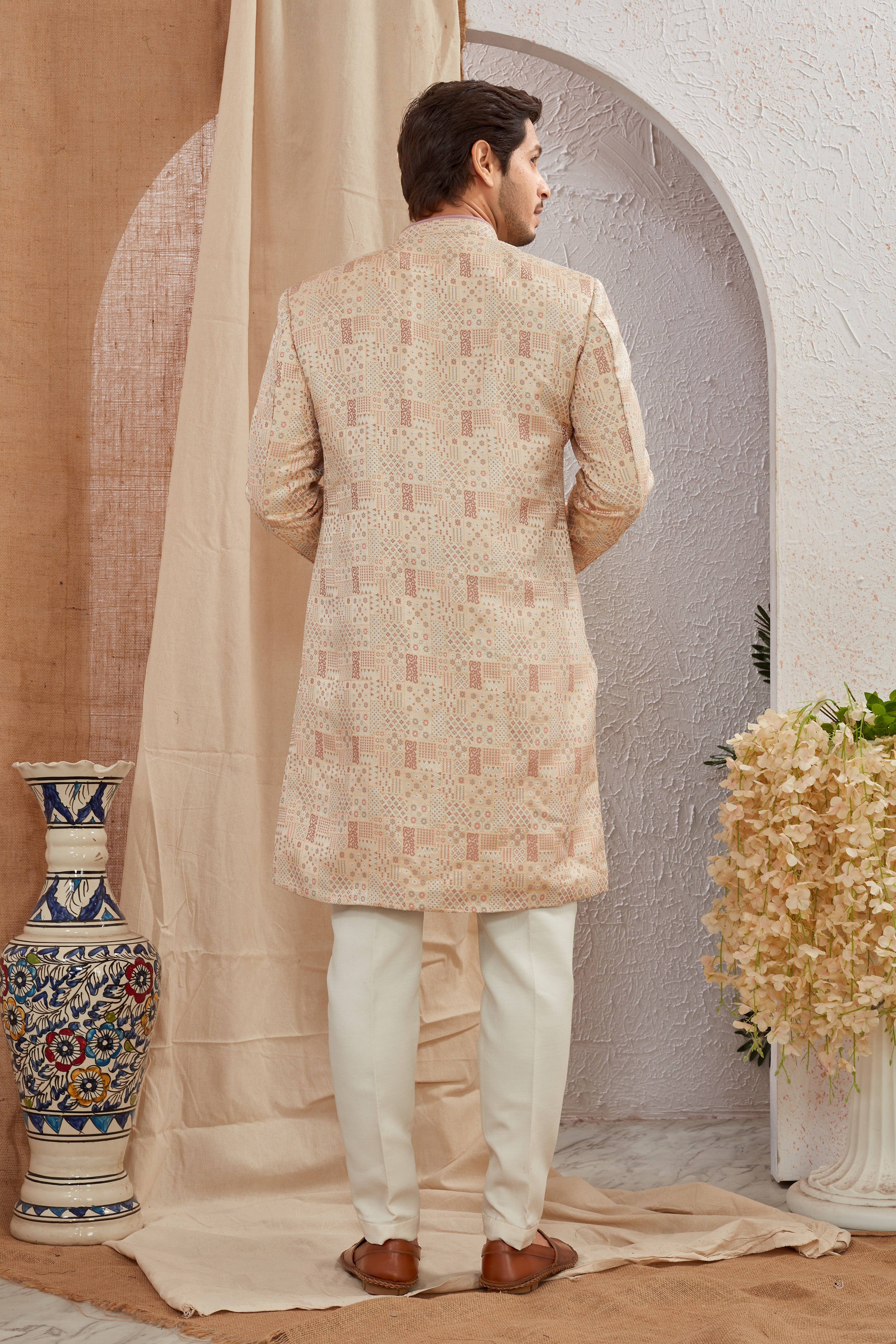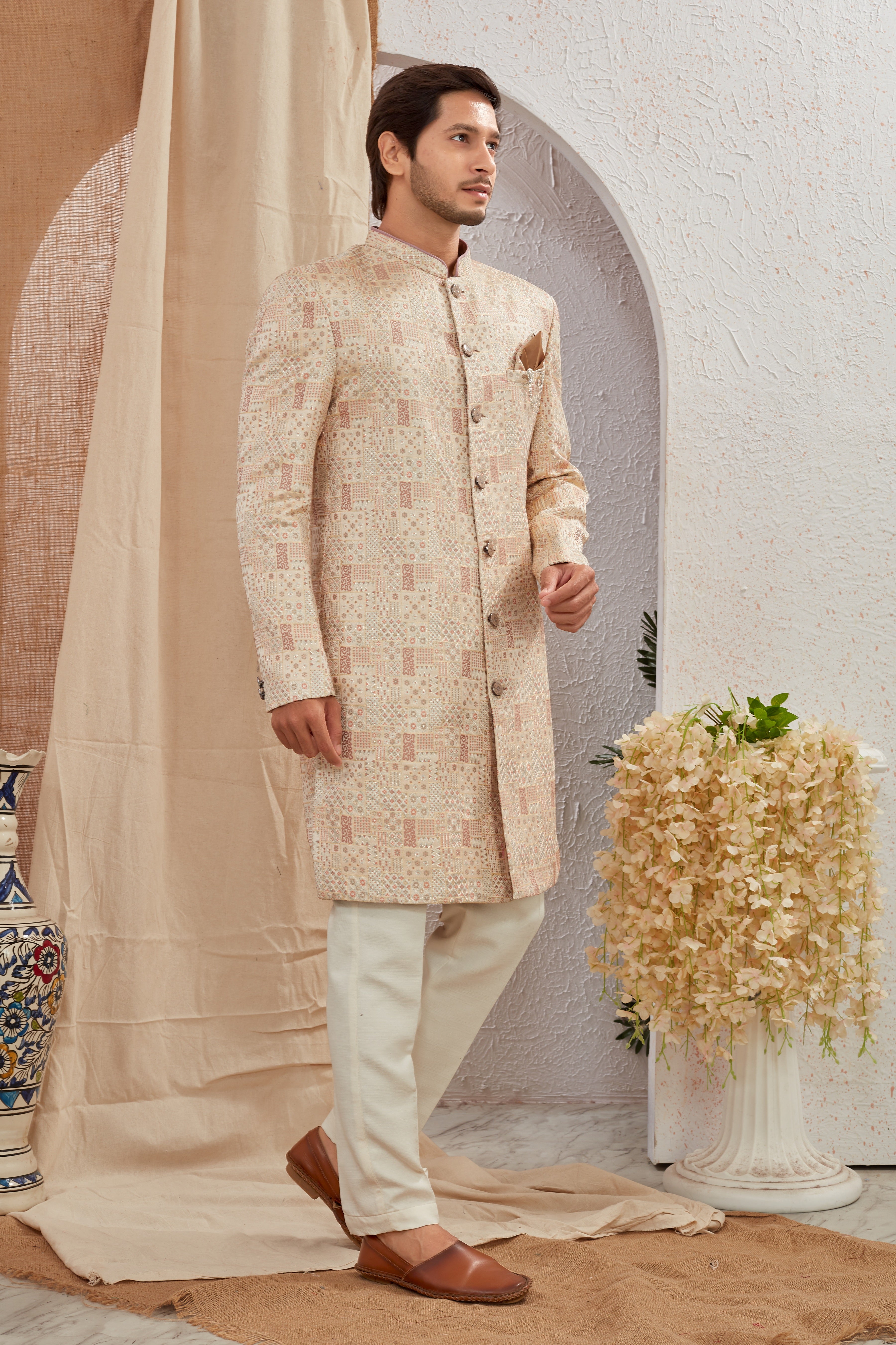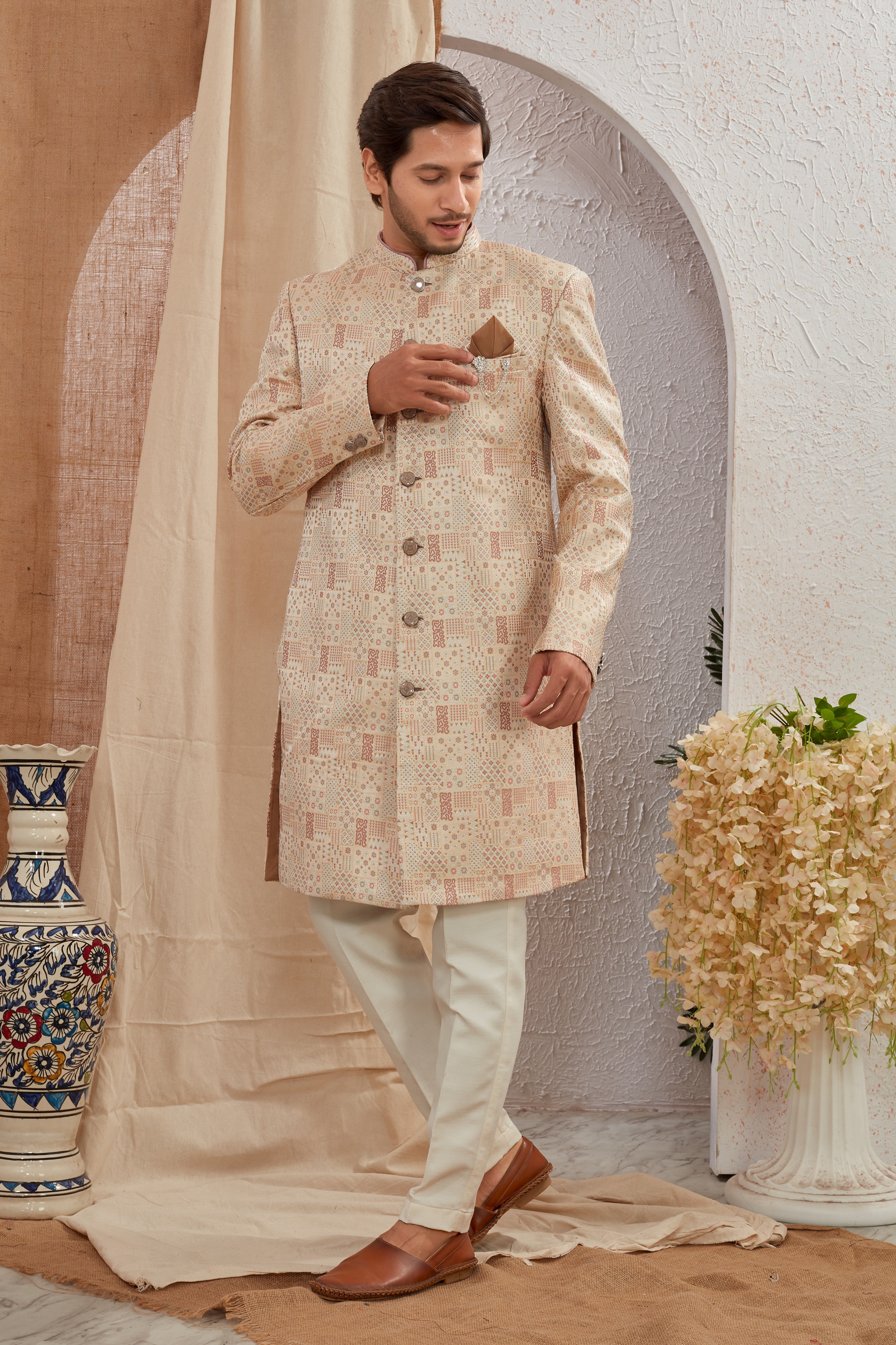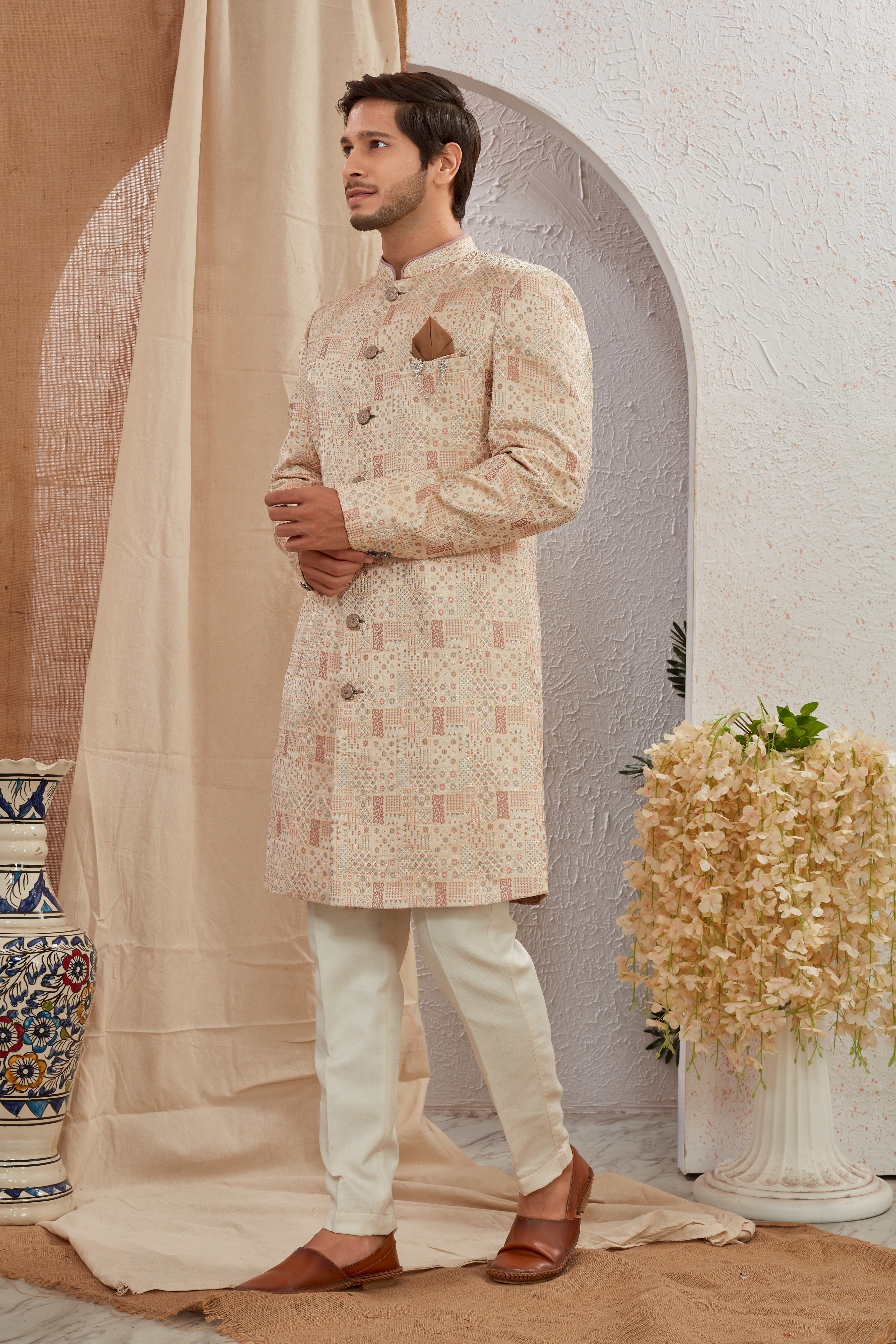 Elevate your ethnic style with our Designer Light Yellow Asymmetric Sherwani featuring unique diagonal button styling and detailed textured patterns. Paired with crisp white churidar pants, this ensemble offers a bold and regal look for weddings, receptions, and special occasions.