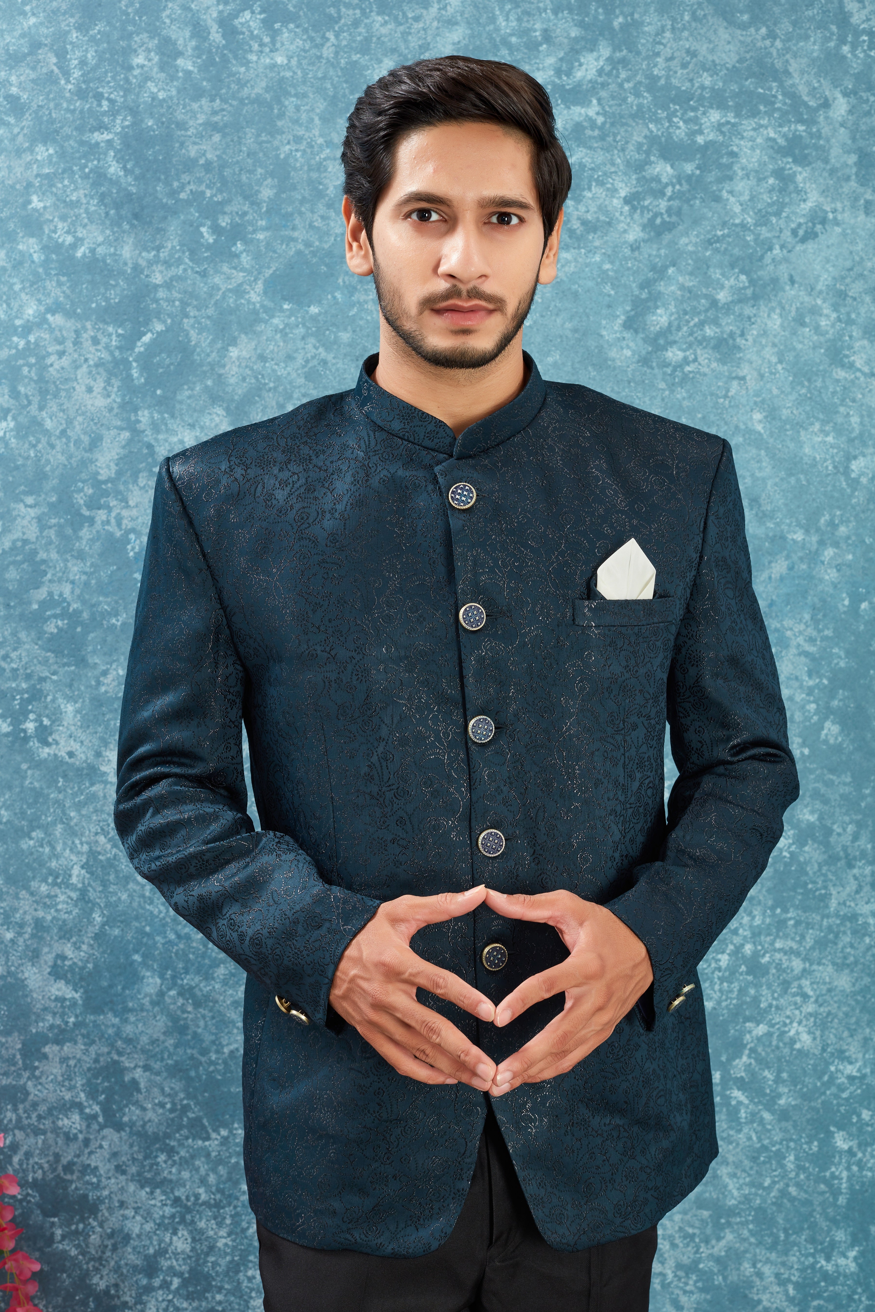 Step into sophistication with this Solid jacquard Indo-Western blazer designed for the modern man who appreciates timeless style. This unique piece features a subtle diamond pattern and a structured silhouette that enhances your presence at any event.