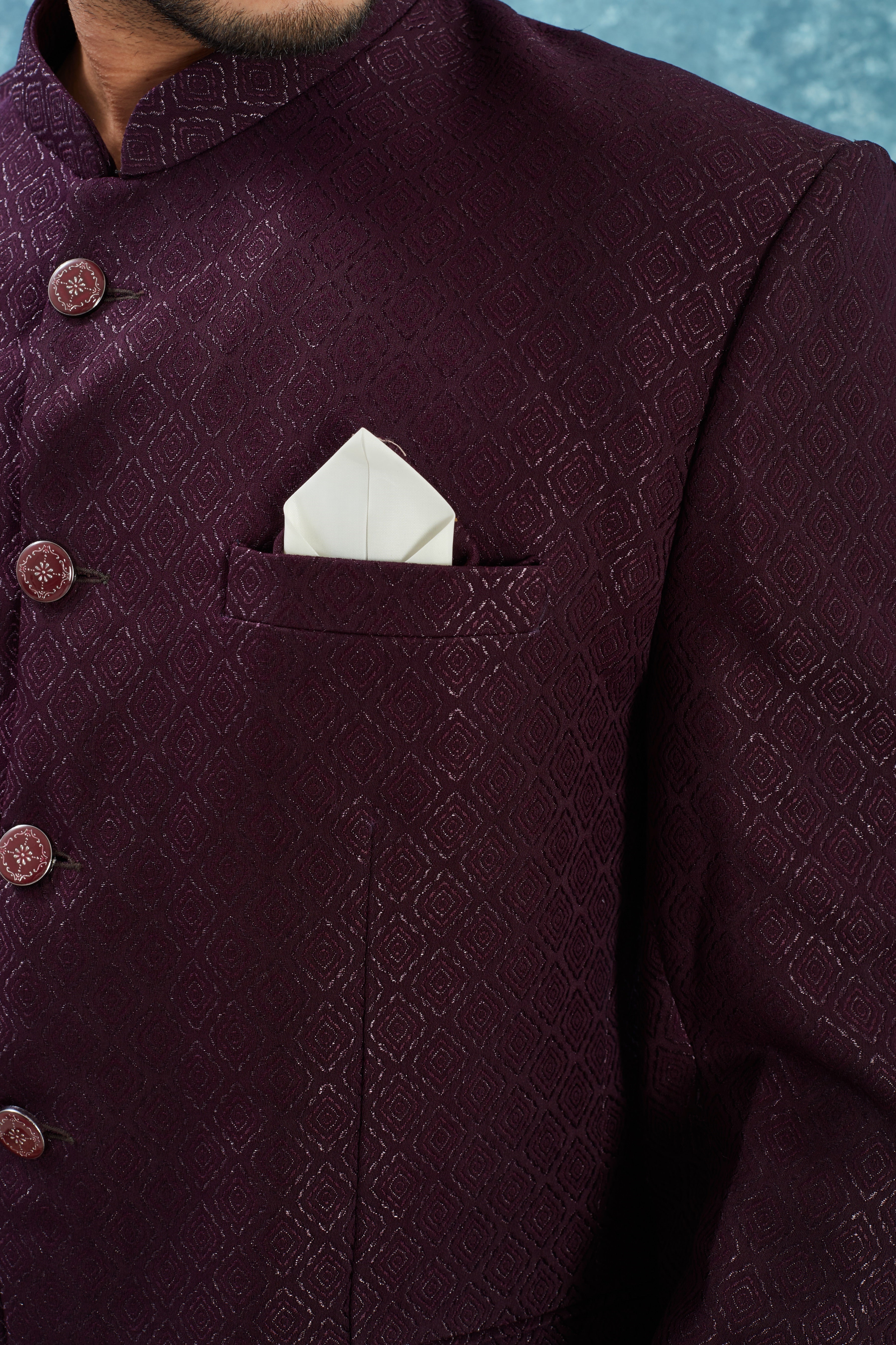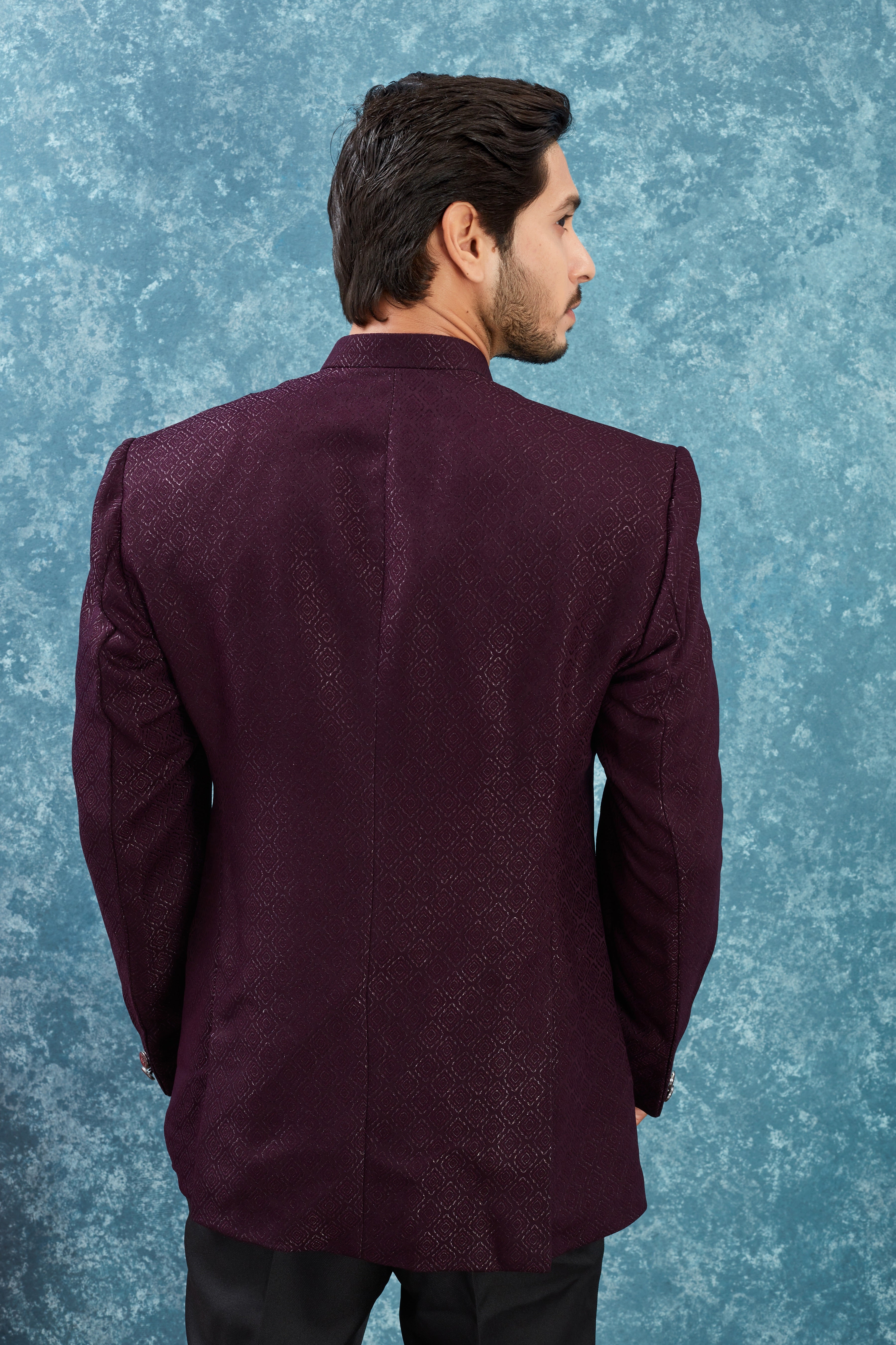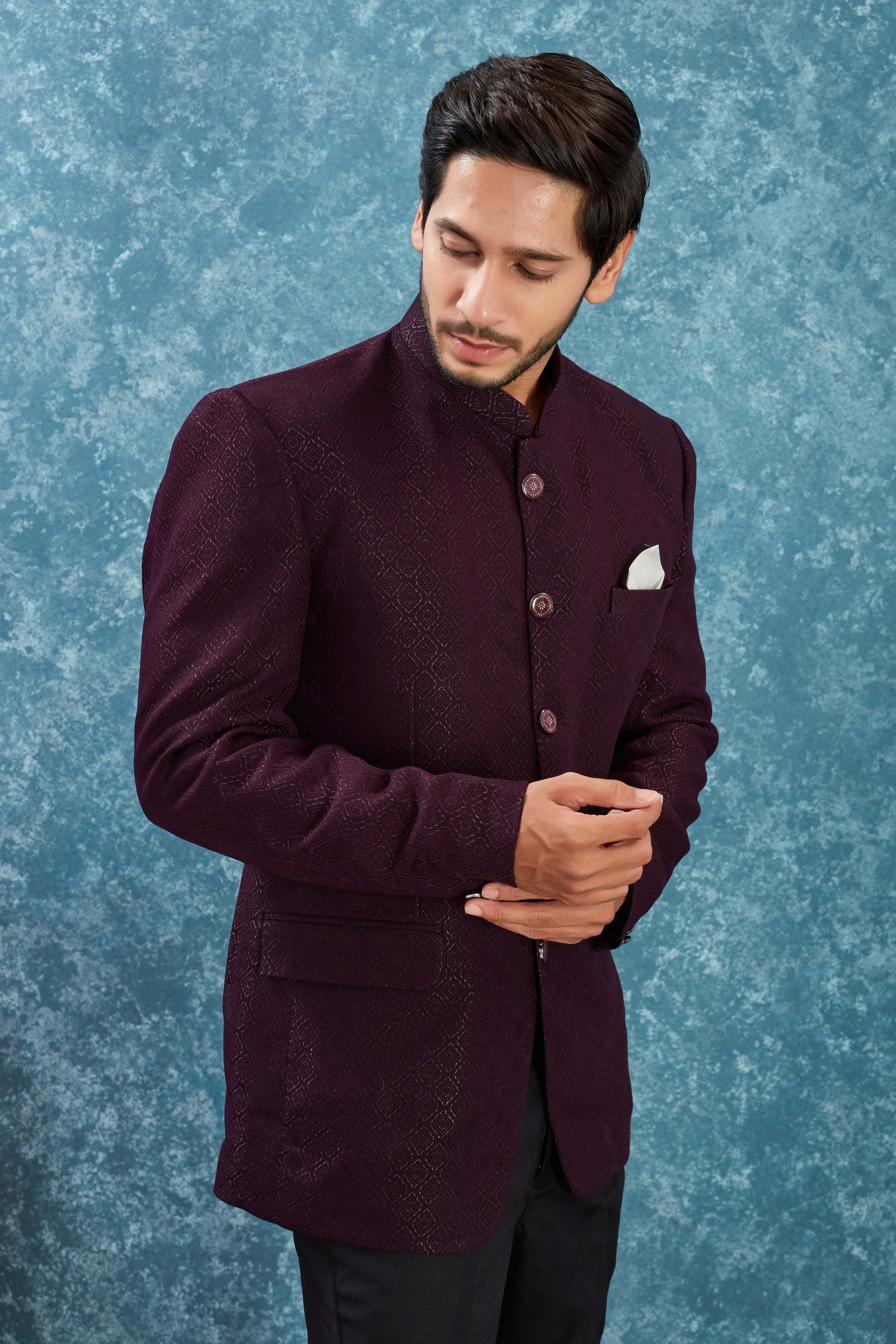 Step into sophistication with this Solid jacquard Indo-Western blazer designed for the modern man who appreciates timeless style. This unique piece features a subtle diamond pattern and a structured silhouette that enhances your presence at any event.