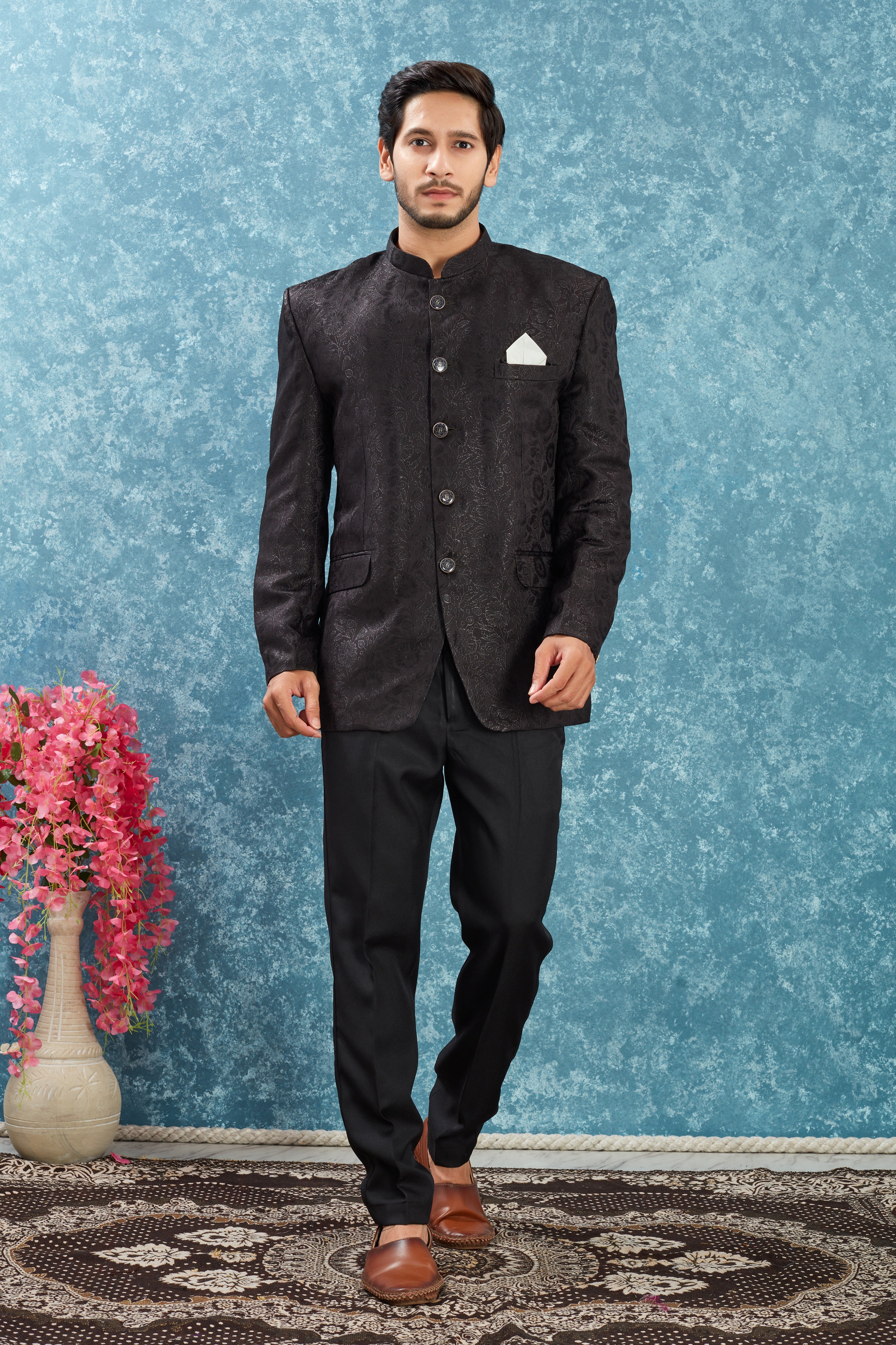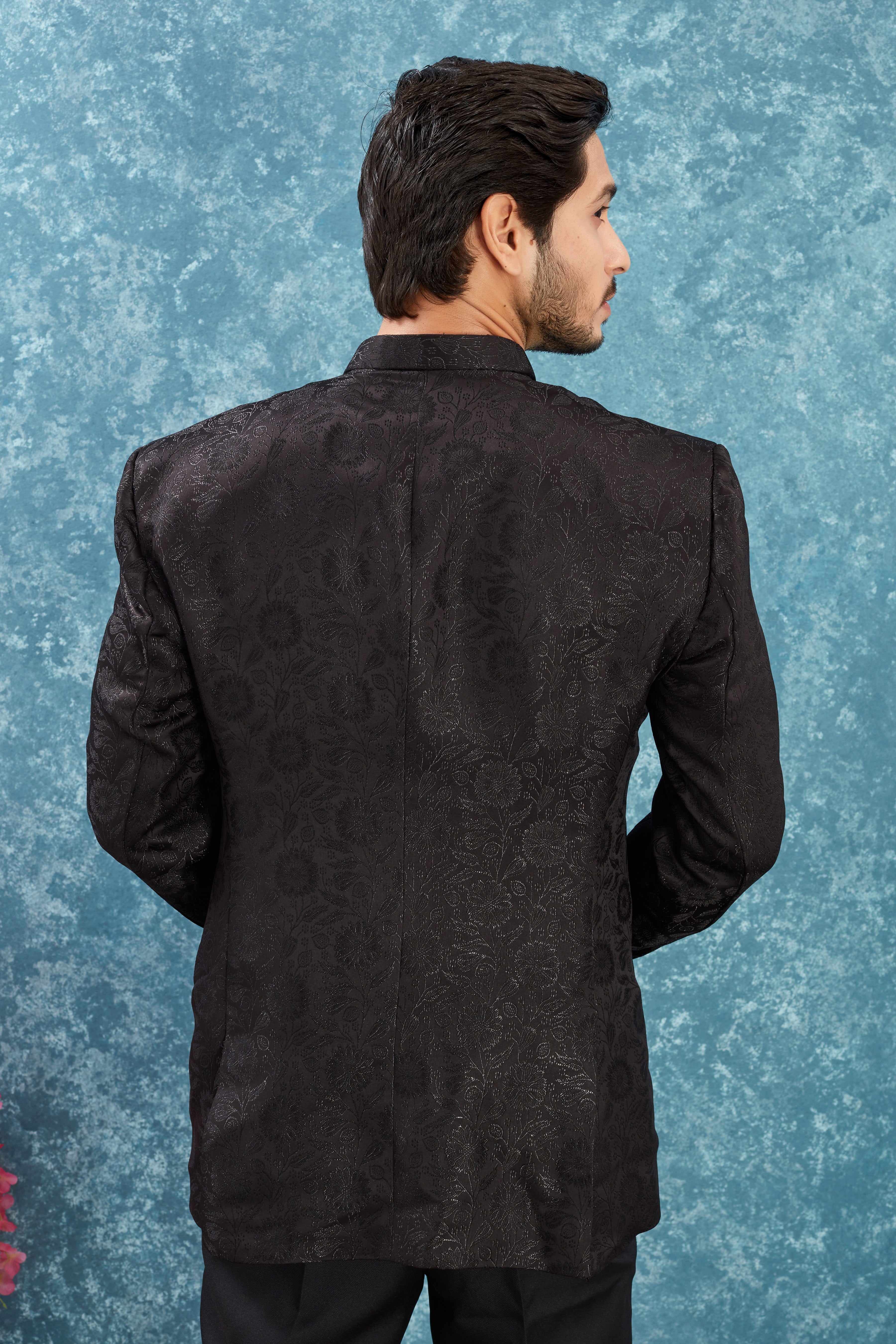 Step into sophistication with this Solid jacquard Indo-Western blazer designed for the modern man who appreciates timeless style. This unique piece features a subtle diamond pattern and a structured silhouette that enhances your presence at any event.