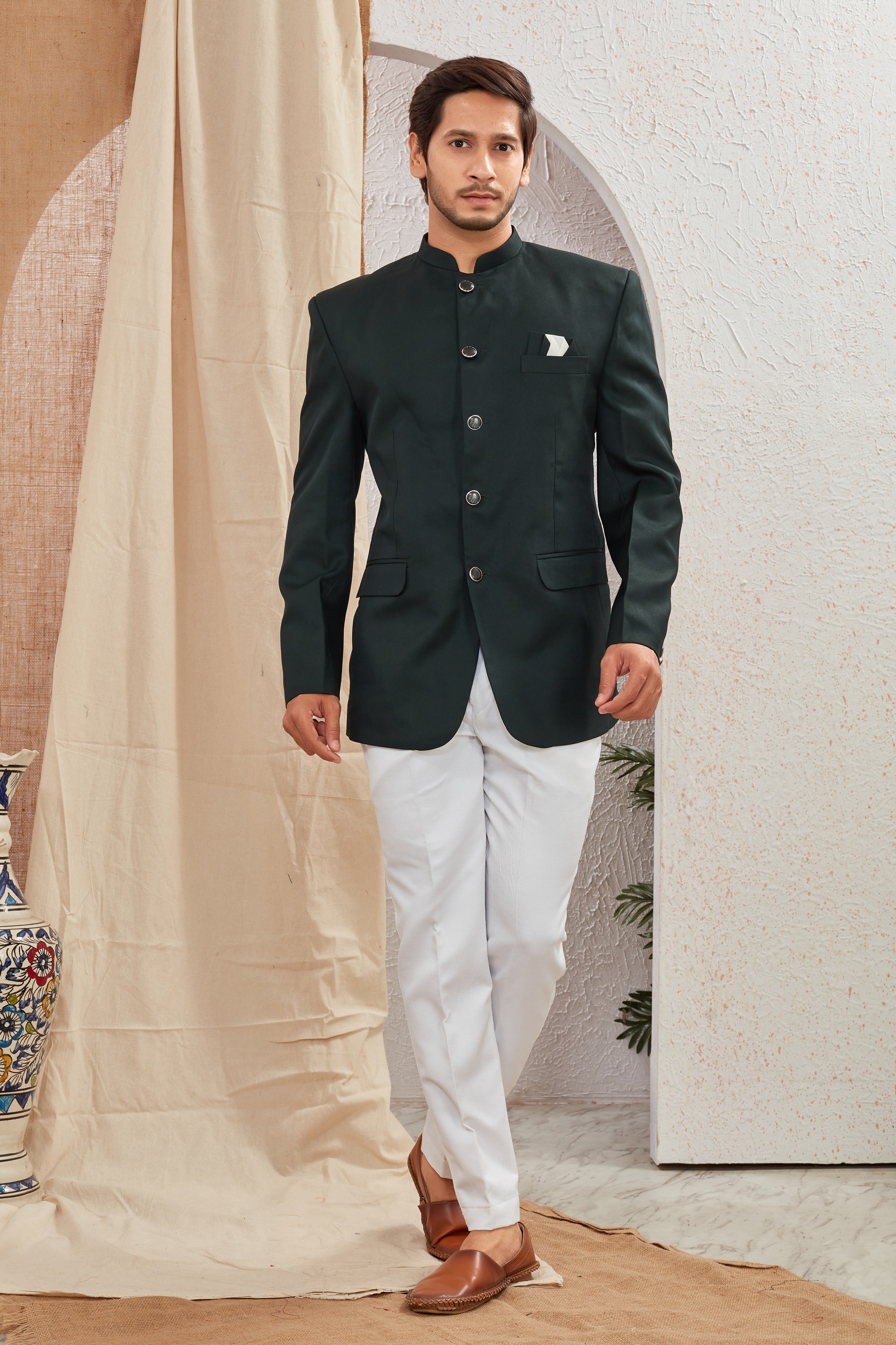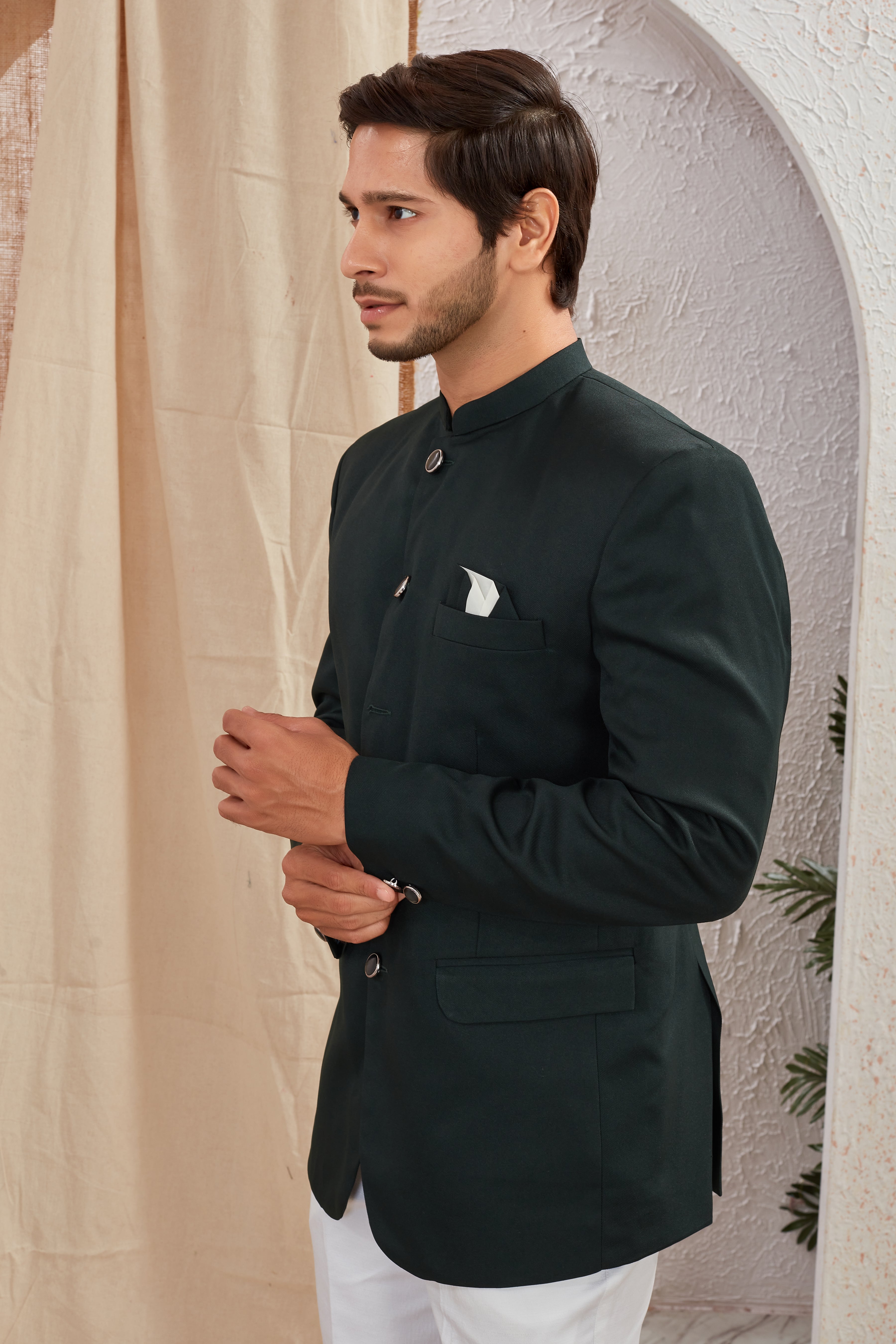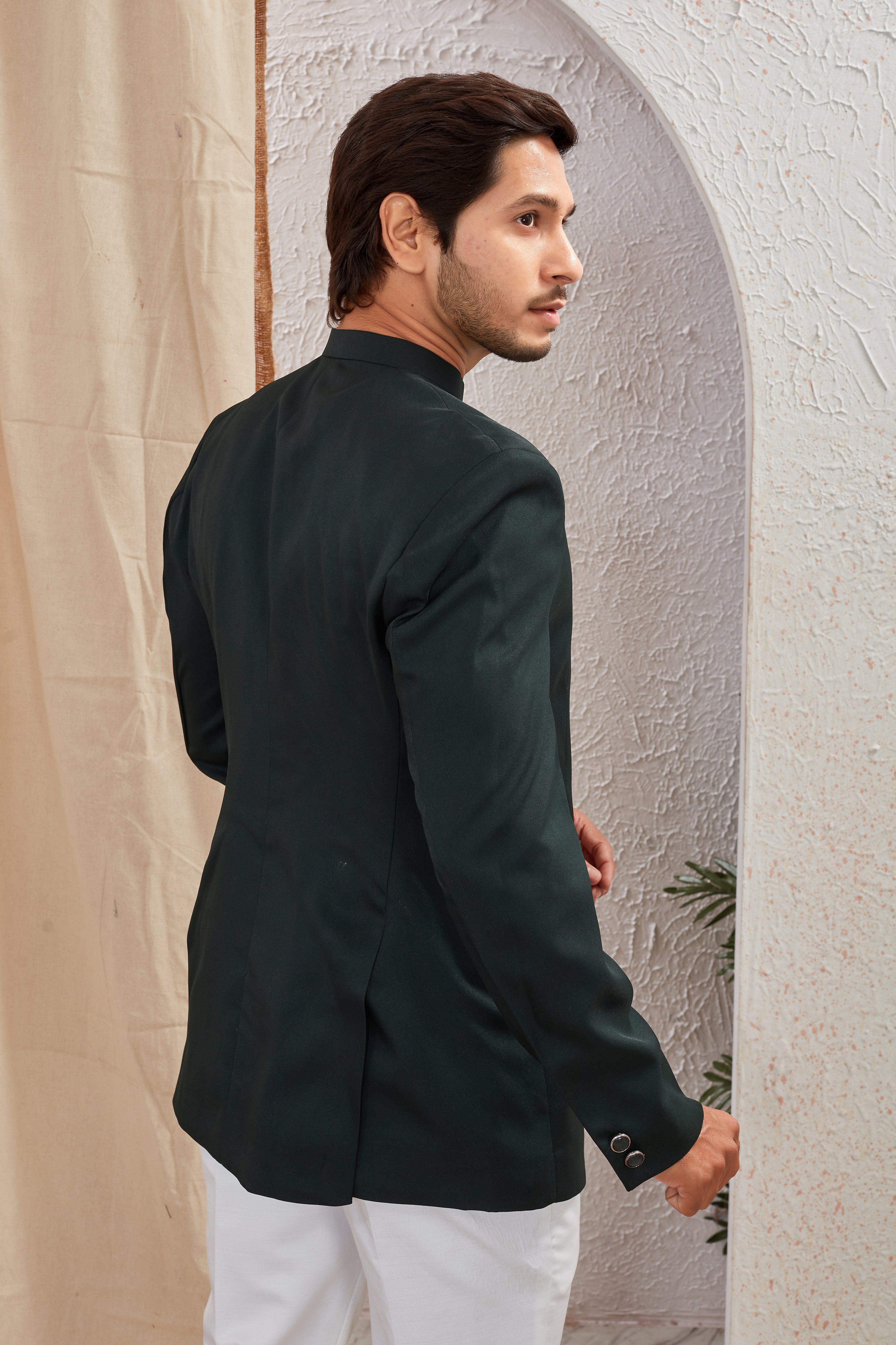 Men's Green Mandarin Collar Bandhgala Blazer – Elegant Formal Wear
