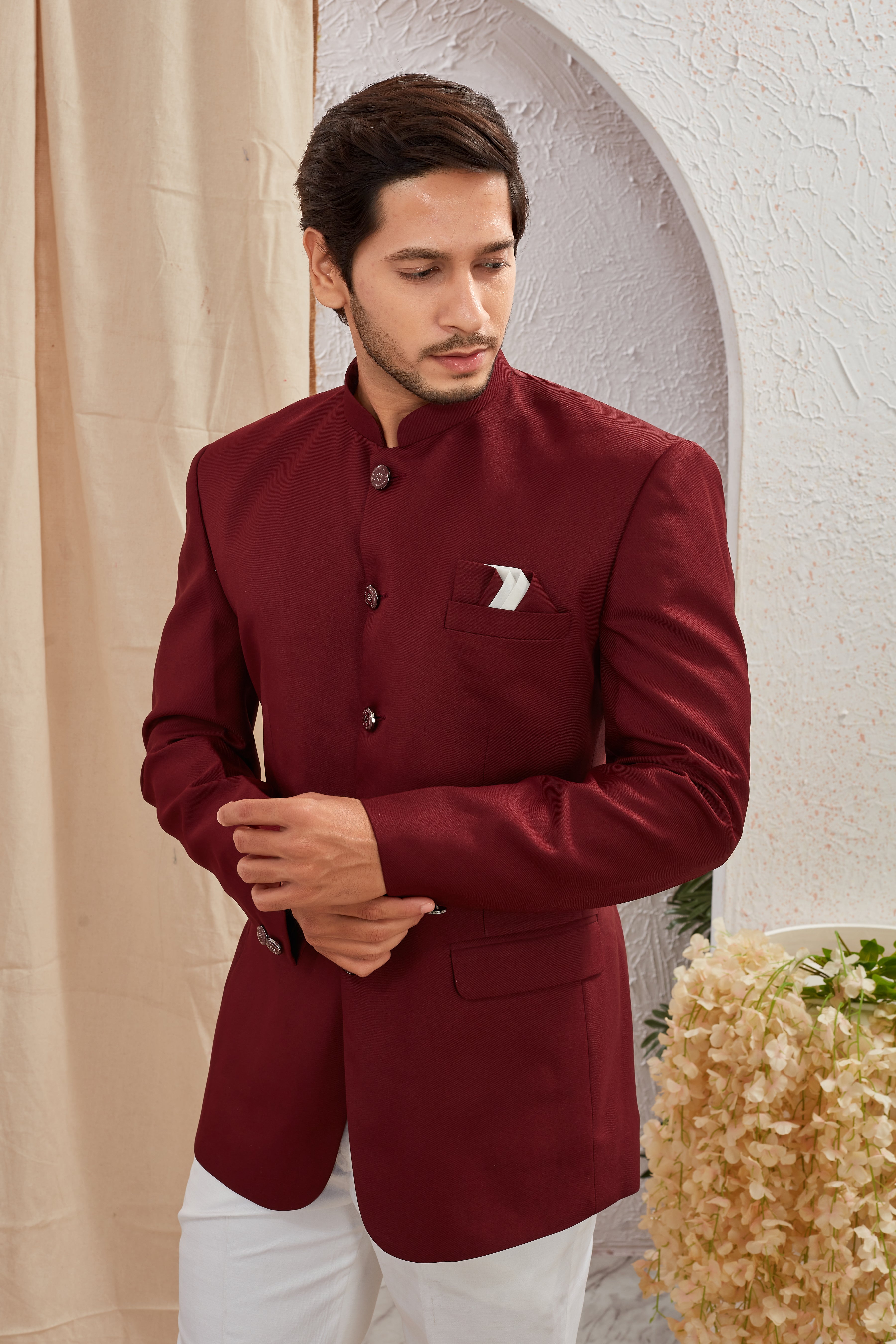Men's Maroon Mandarin Collar Bandhgala Blazer – Elegant Formal Wear