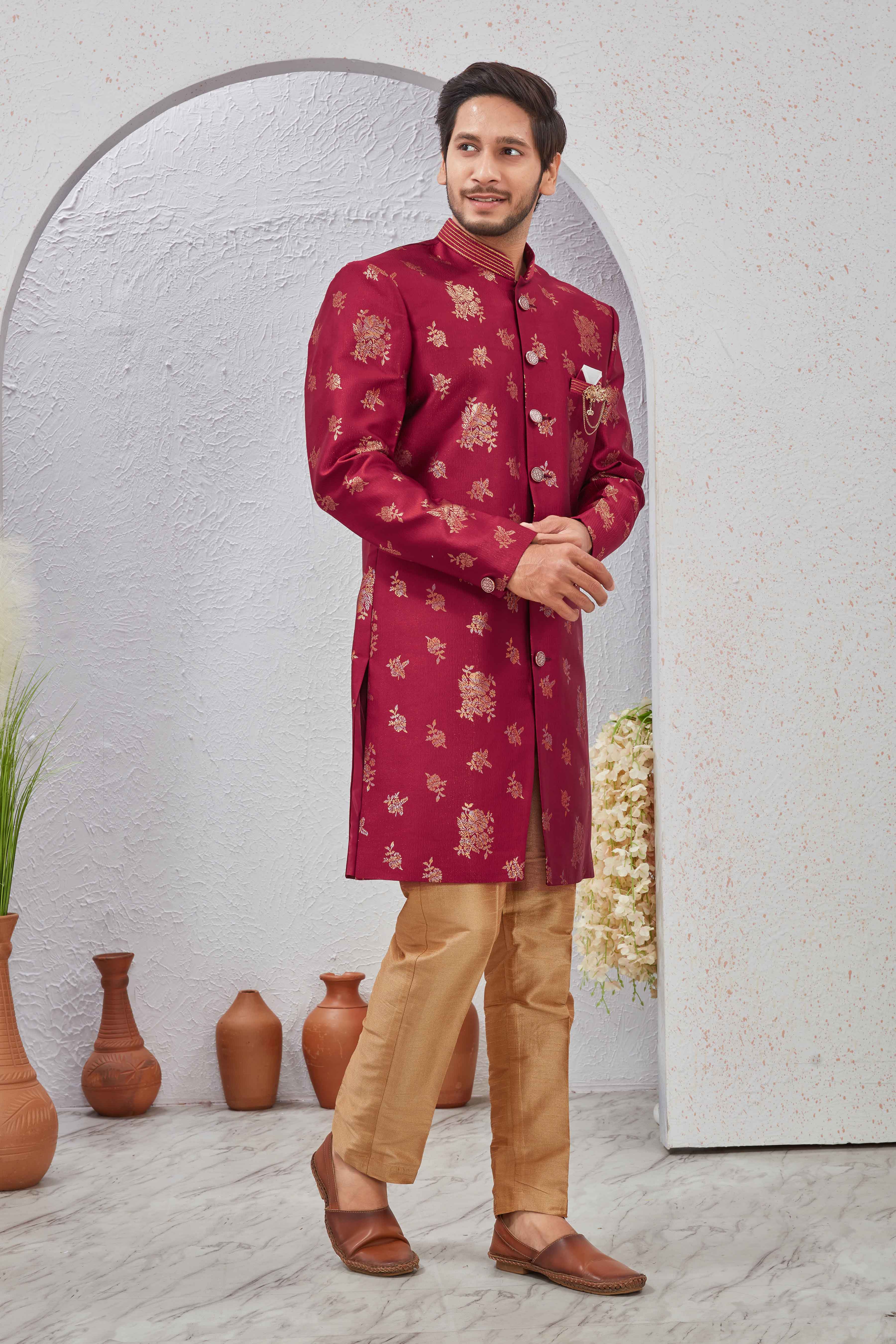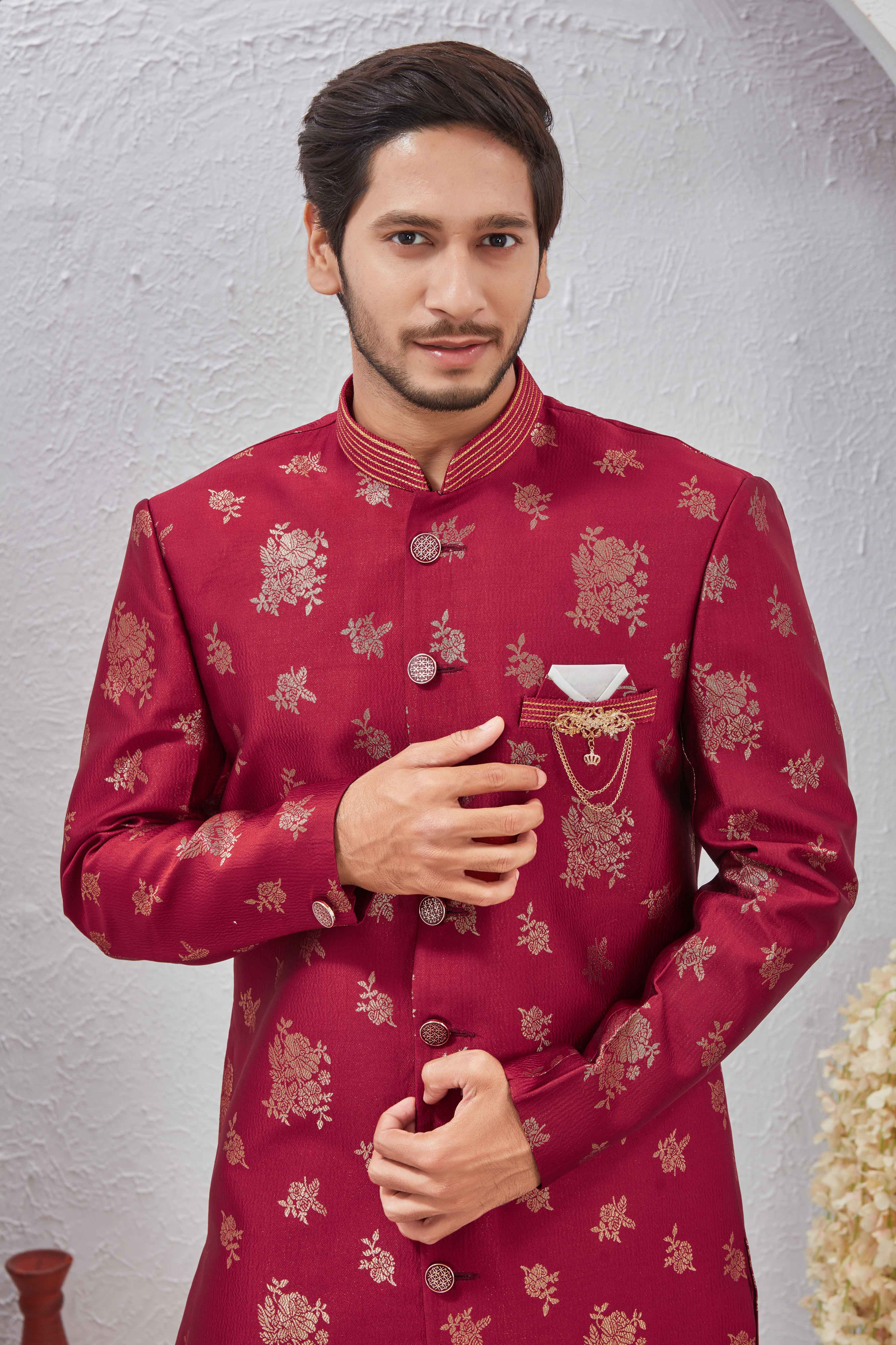 Command attention at your next grand event with our exquisite Regal Maroon & Gold Brocade Indo-Western Sherwani Set. Crafted from rich maroon fabric, this long-length sherwani features intricate golden floral brocade work that exudes opulence. The elegant mandarin collar and button-down front with ornate golden buttons add to its sophisticated charm. A unique brooch detail on the chest elevates its festive appeal. Paired with comfortable and stylish golden art silk dhoti pants, this ensemble is perfect for weddings, sangeet ceremonies, festive gatherings, or any occasion where you want to make a lasting impression.