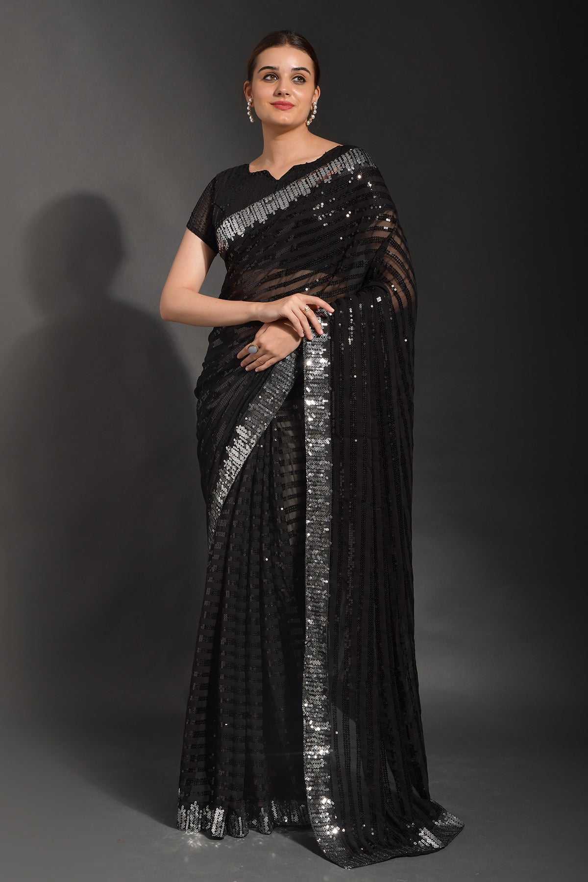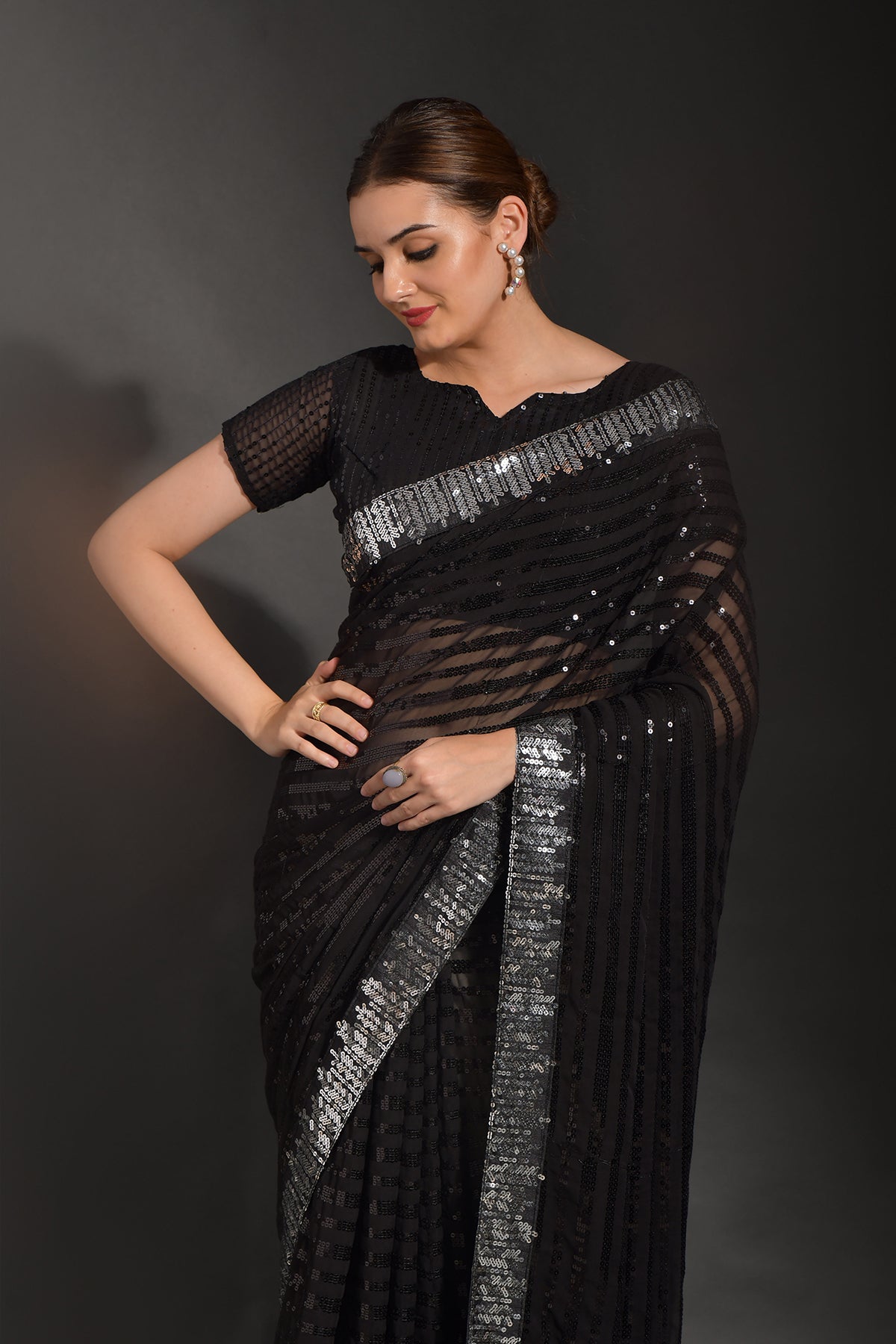 Make an unforgettable impression with this ultra-chic black sequin saree that exudes sophistication and charm. The saree features horizontal shimmering sequins that catch the light with every move, while the silver embellished border adds just the right touch of luxury.