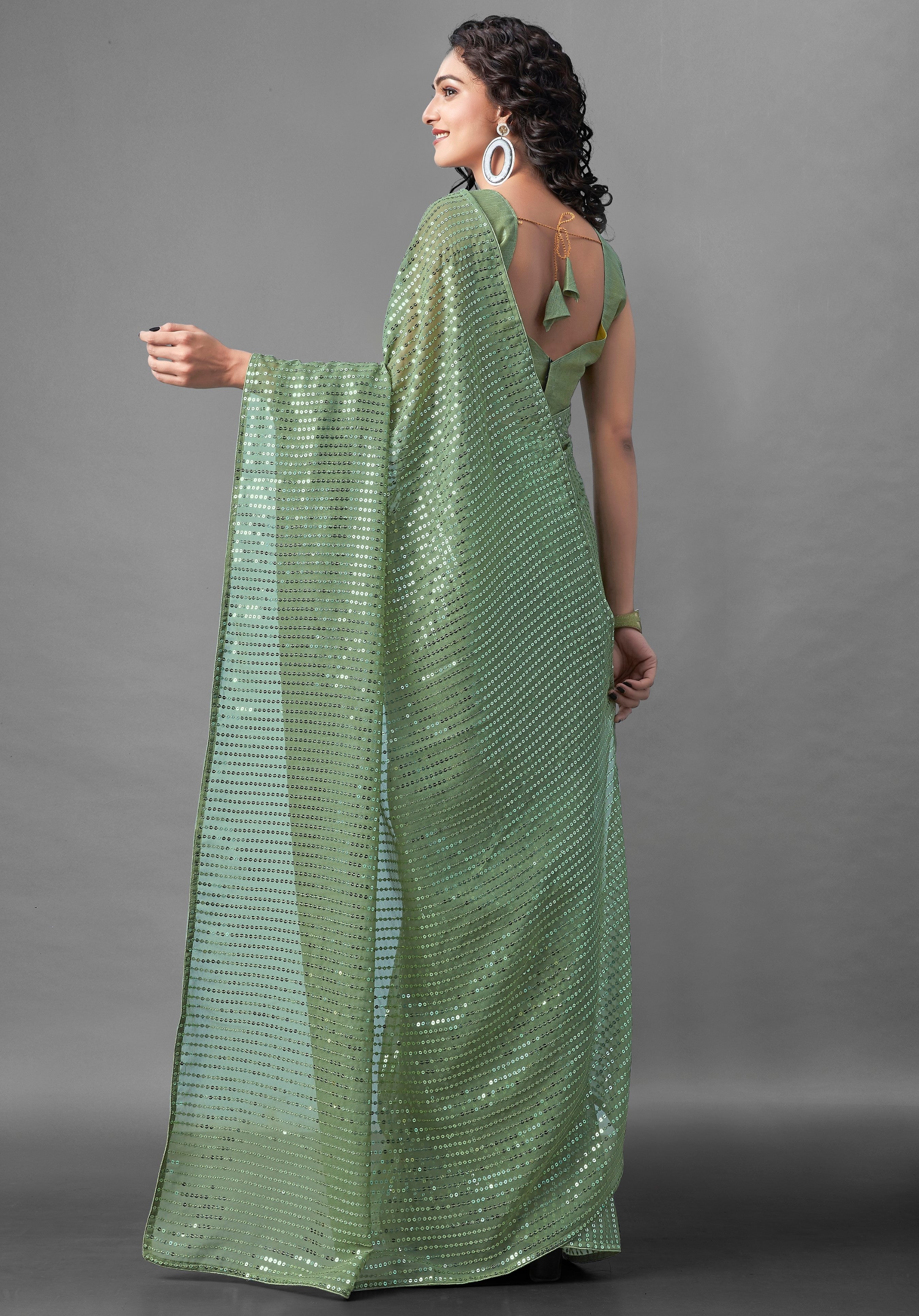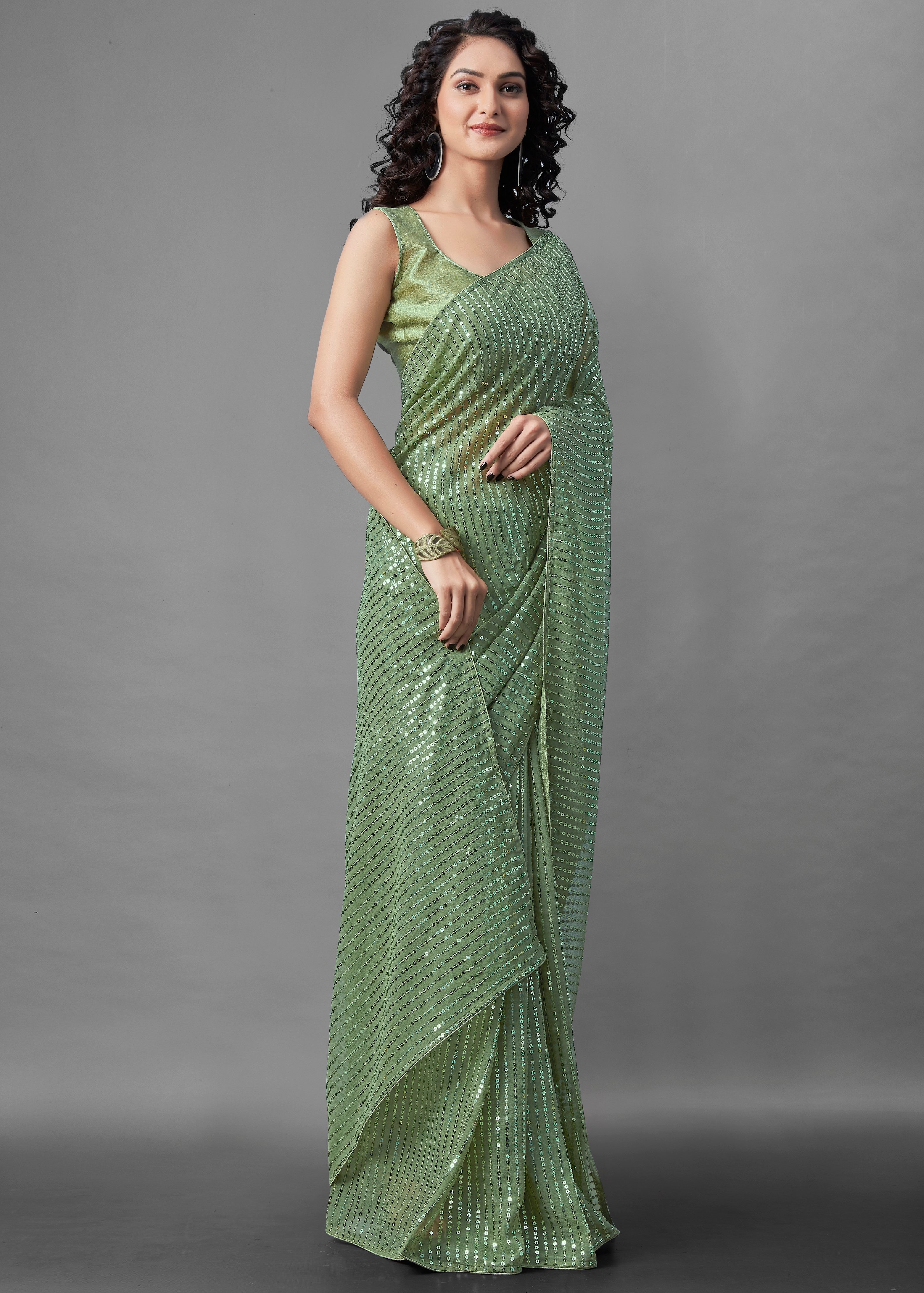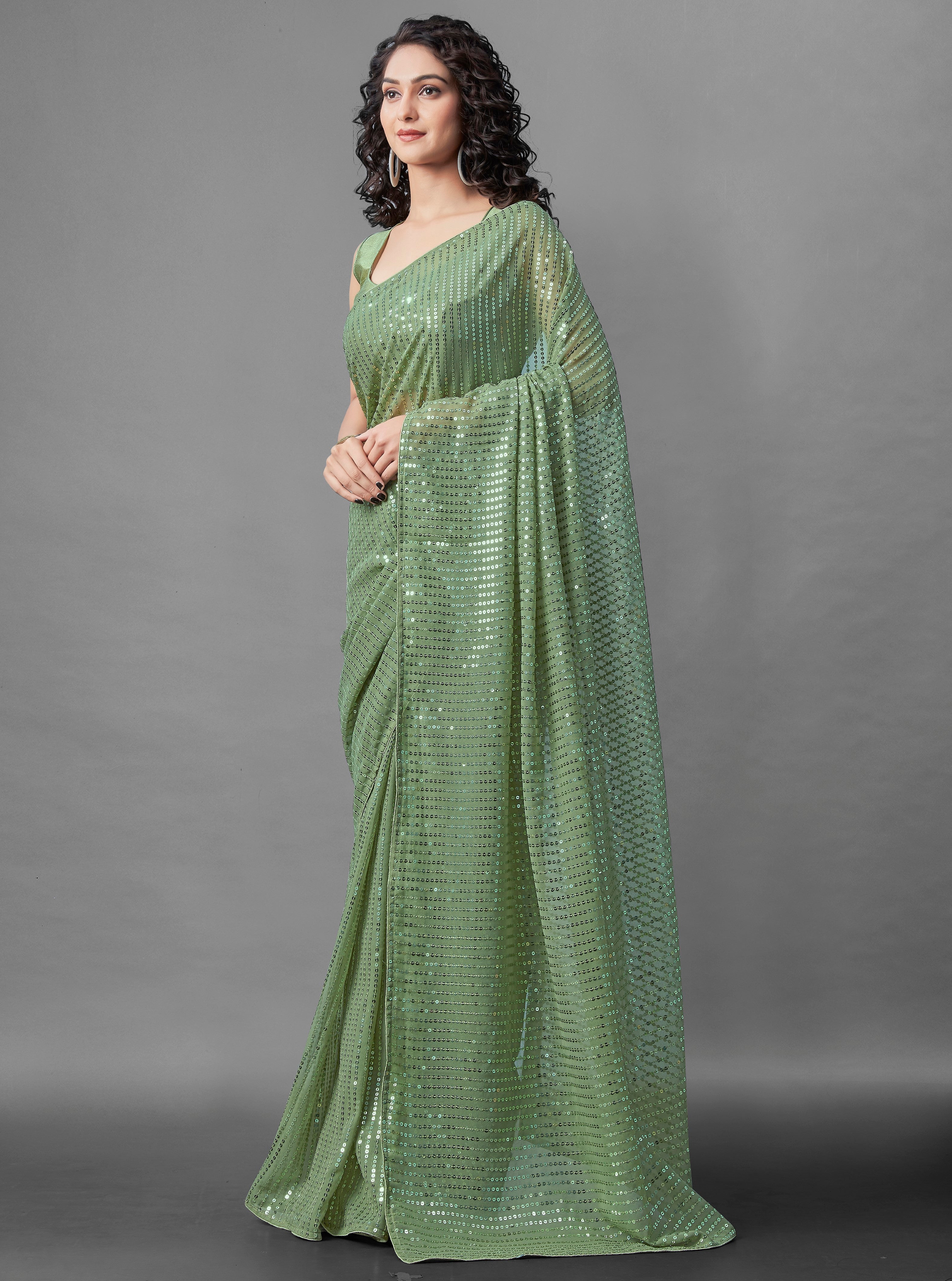 Midnight Noir Pista Green Sequin Georgette Saree For Women