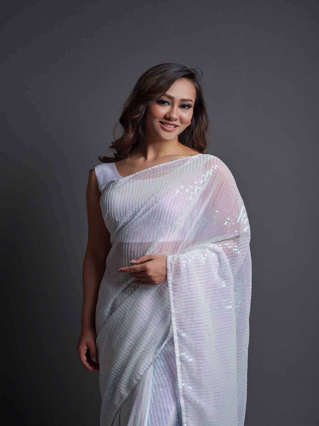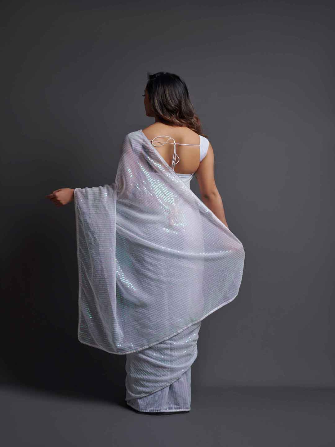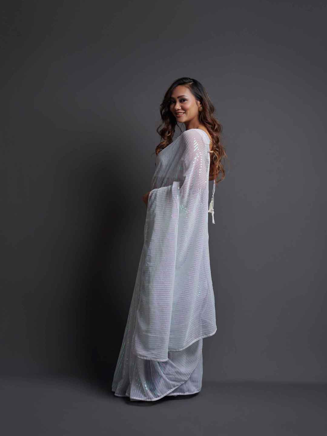 Elevate your evening look with this ultra-chic Midnight Noir Sequin Saree, showcasing sleek vertical shimmer stripes on a soft Georgette fabric. The sequin lines create a stunning silhouette, while the subtle sparkle makes it perfect for high-glam occasions.