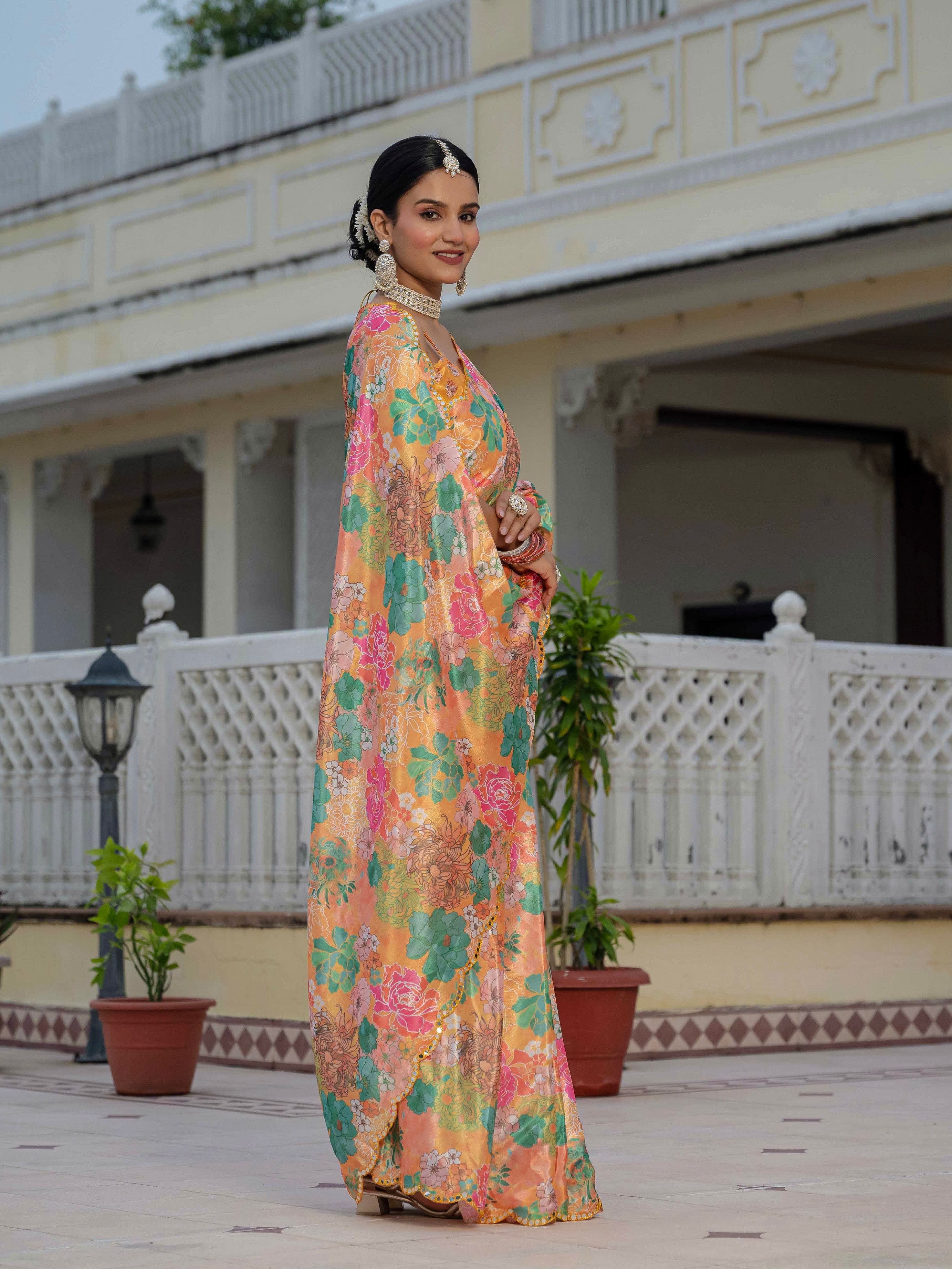 Step into effortless elegance with this beautifully crafted Mastard Yellow floral printed Ready To Wear saree. Designed for modern women who love tradition without the hassle, this pre-stitched saree offers a flawless drape in minutes. Adorned with vibrant floral motifs and finished with a delicate scalloped embellished border, the saree exudes regal charm. The lightweight, flowy fabric ensures comfort while maintaining a graceful silhouette, making it ideal for weddings, festive occasions, and special celebrations. Just slip it on, zip it up, and you’re ready to shine.
