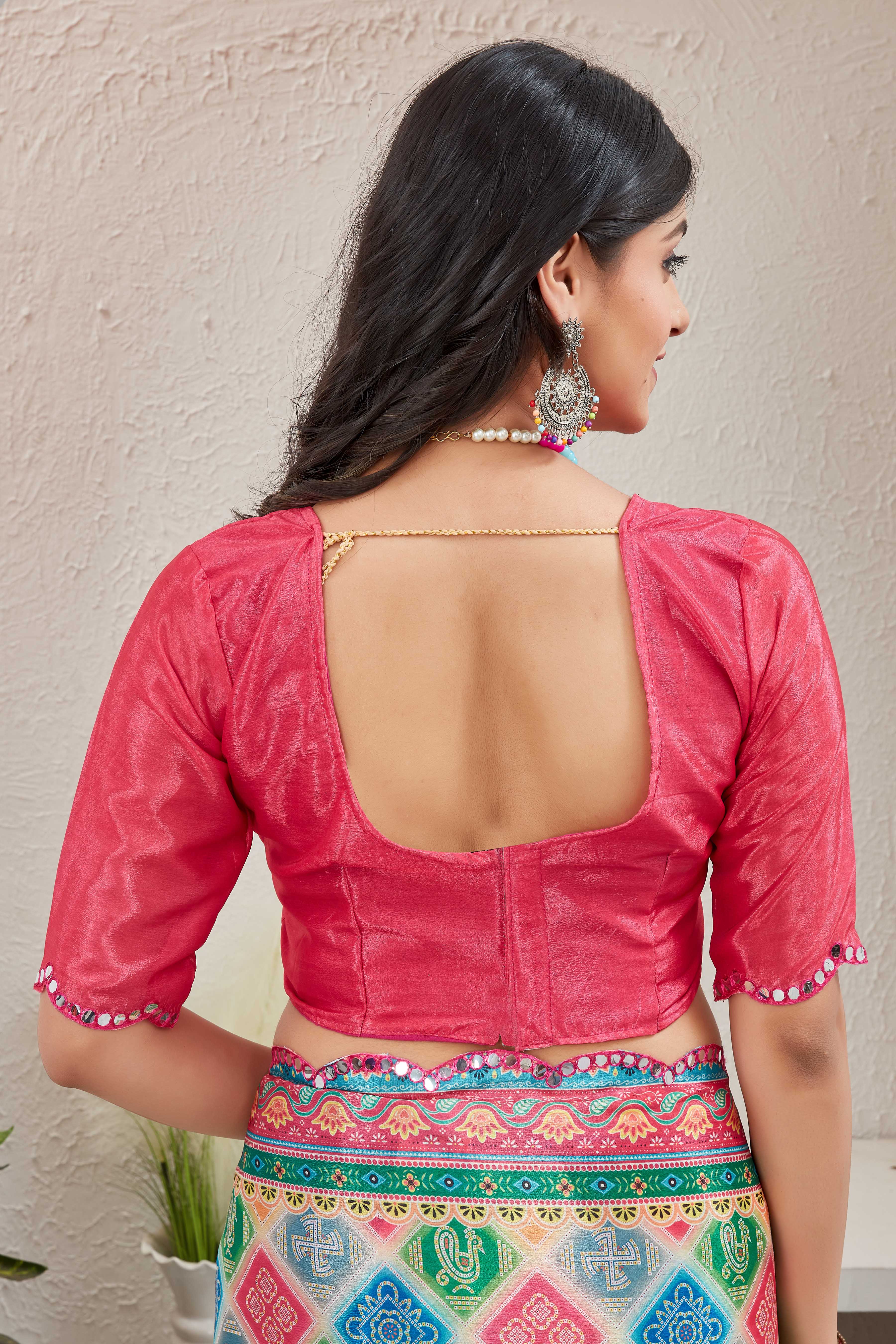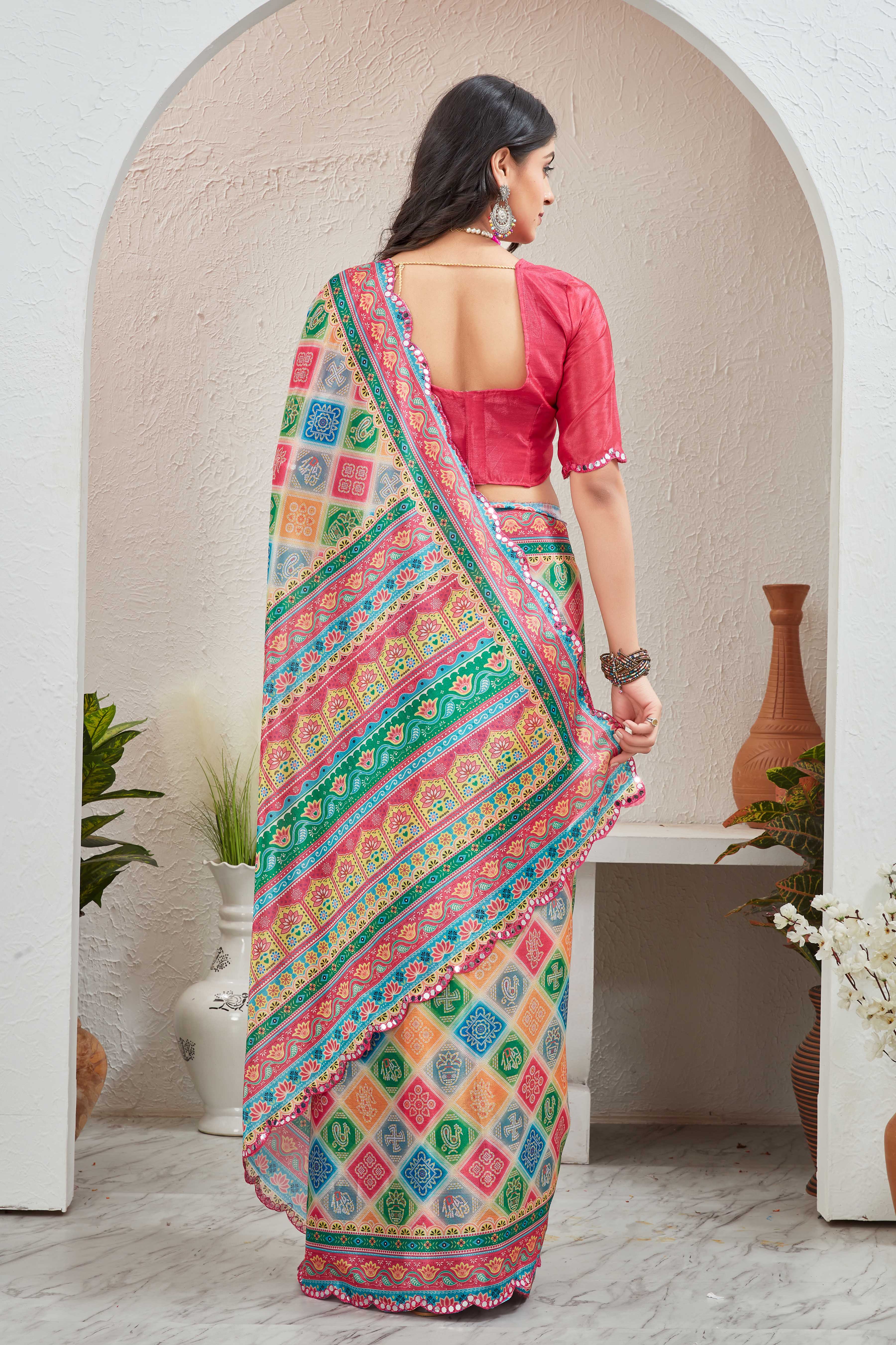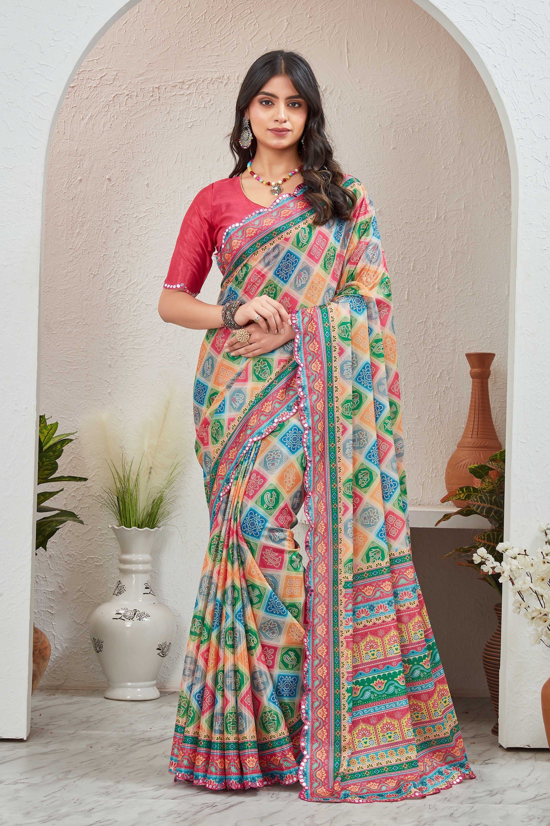 Add a splash of color to your wardrobe with this eye-catching multicolor saree featuring traditional block prints in a playful palette. The saree showcases a beautiful combination of patterns and a brightly printed border, paired with a solid red blouse that adds a striking contrast.