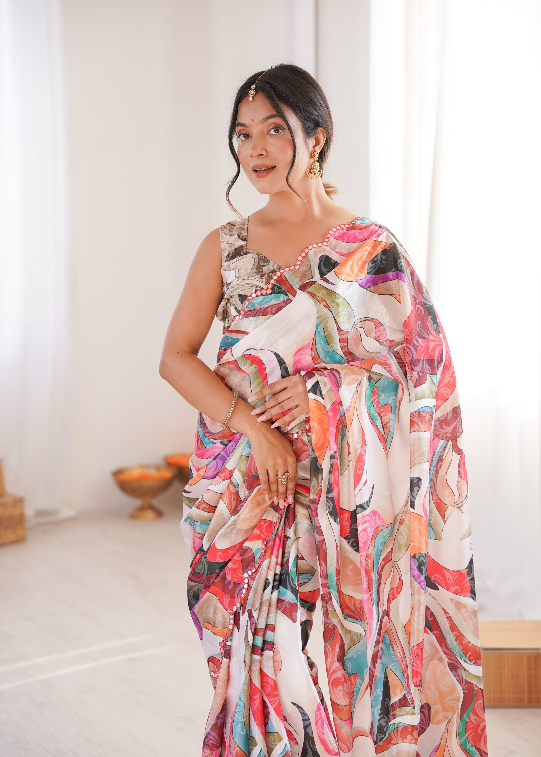 Elevate your ethnic wardrobe with this elegant MultiColor printed saree, designed to blend tradition with effortless grace. Crafted from a lightweight, flowy fabric, this saree features an all-over pattern in warm hues, beautifully complemented by a subtle sequin-embellished border. Perfect for festive occasions, daytime celebrations, weddings, or intimate gatherings, it drapes gracefully and offers all-day comfort with timeless appeal. Style it with statement earrings and a matching blouse to complete the look.
