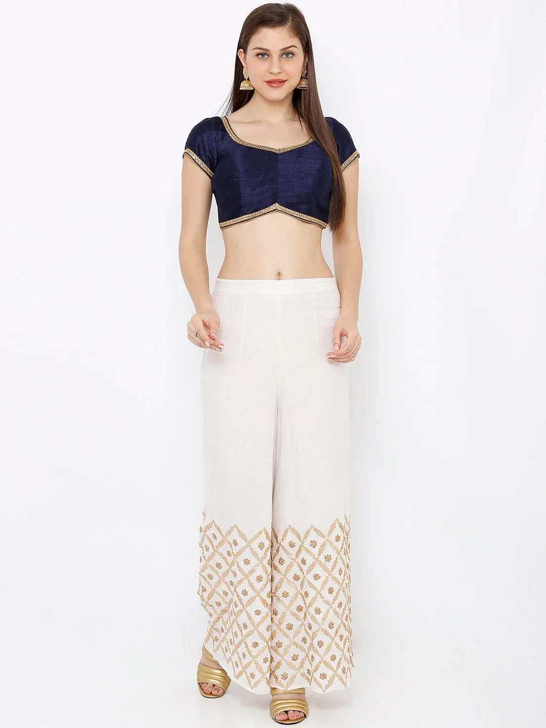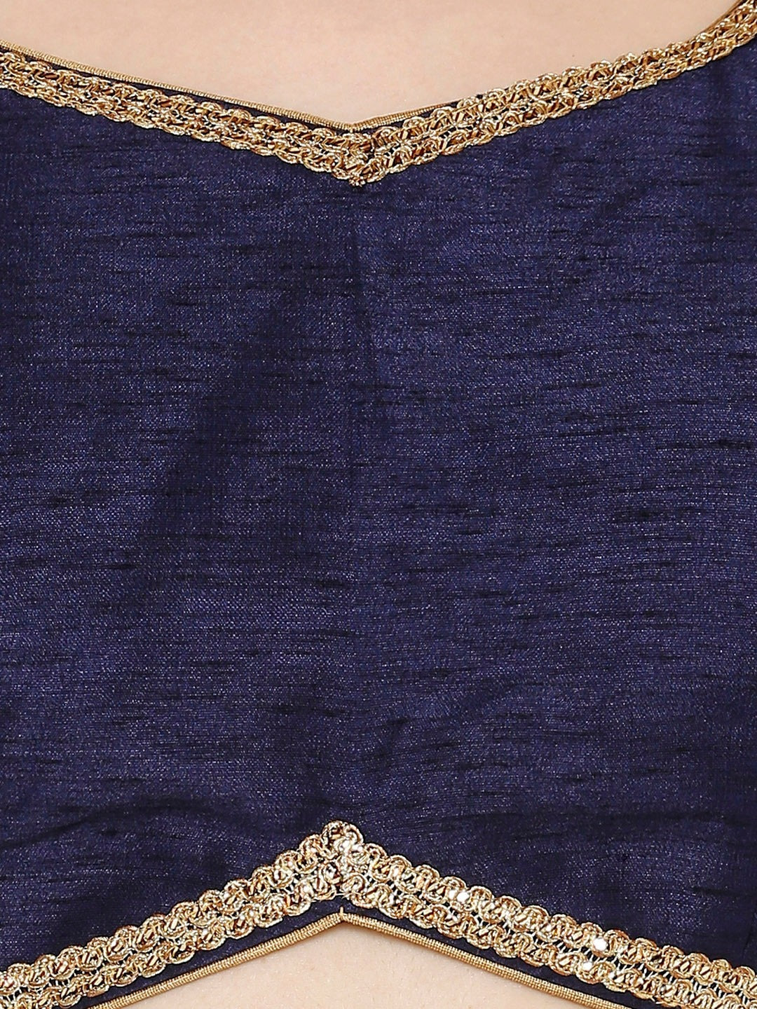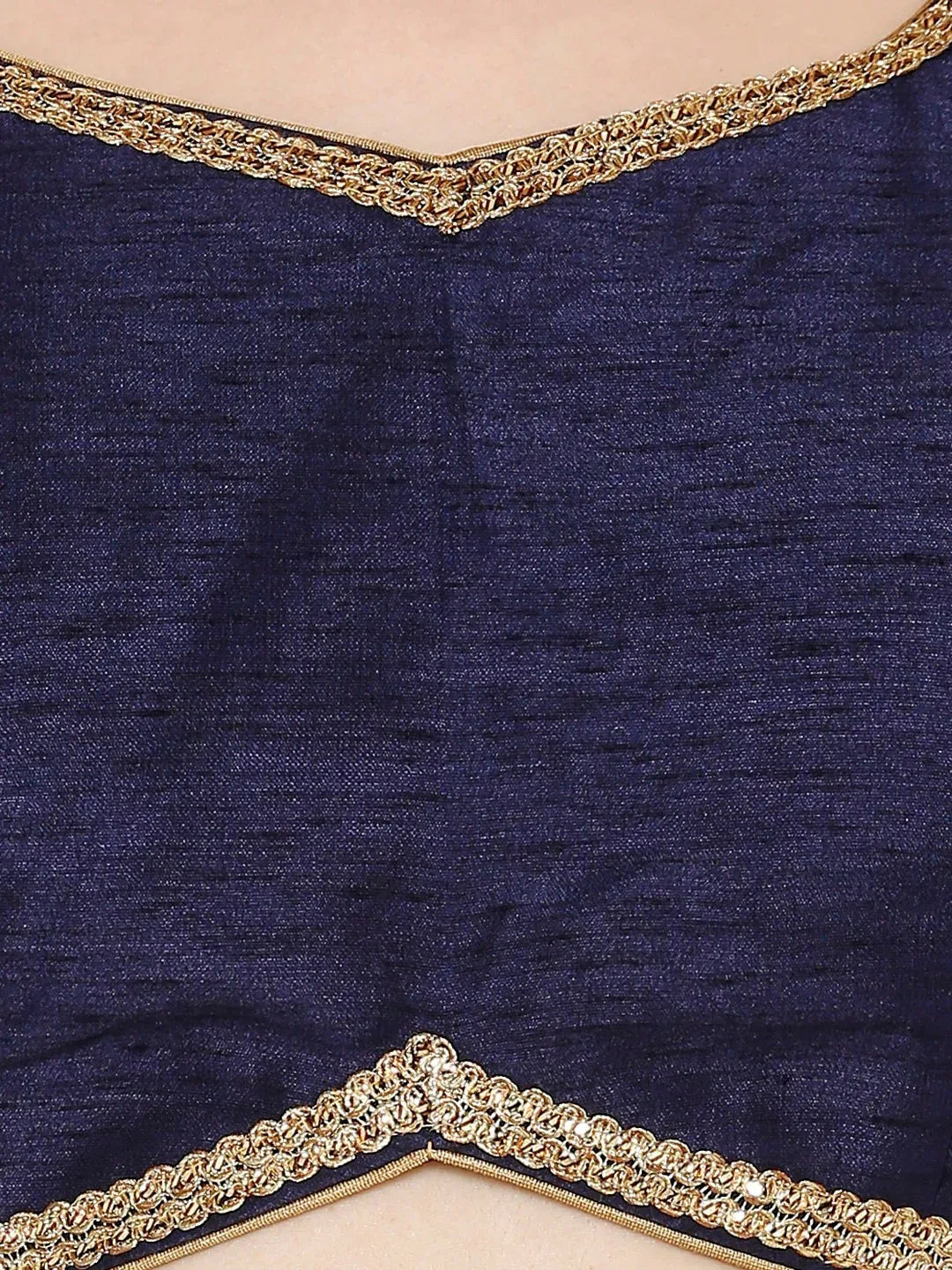 Elevate your ethnic look with this elegant Navy Blue blouse finished with delicate gold edging. The soft, lightly lustrous fabric and flattering V-neckline pair beautifully with sarees and lehengas for weddings, receptions, and festive occasions.