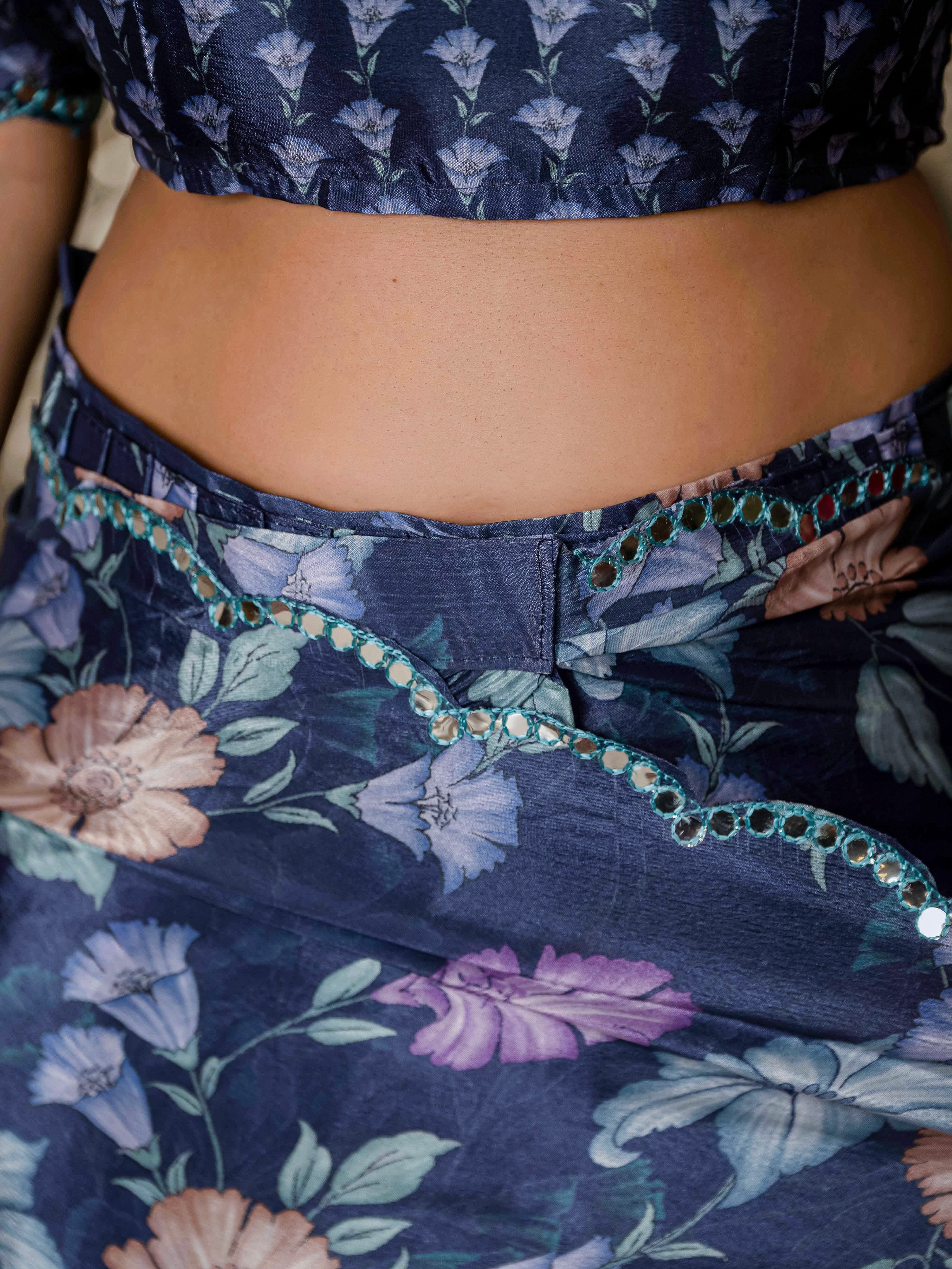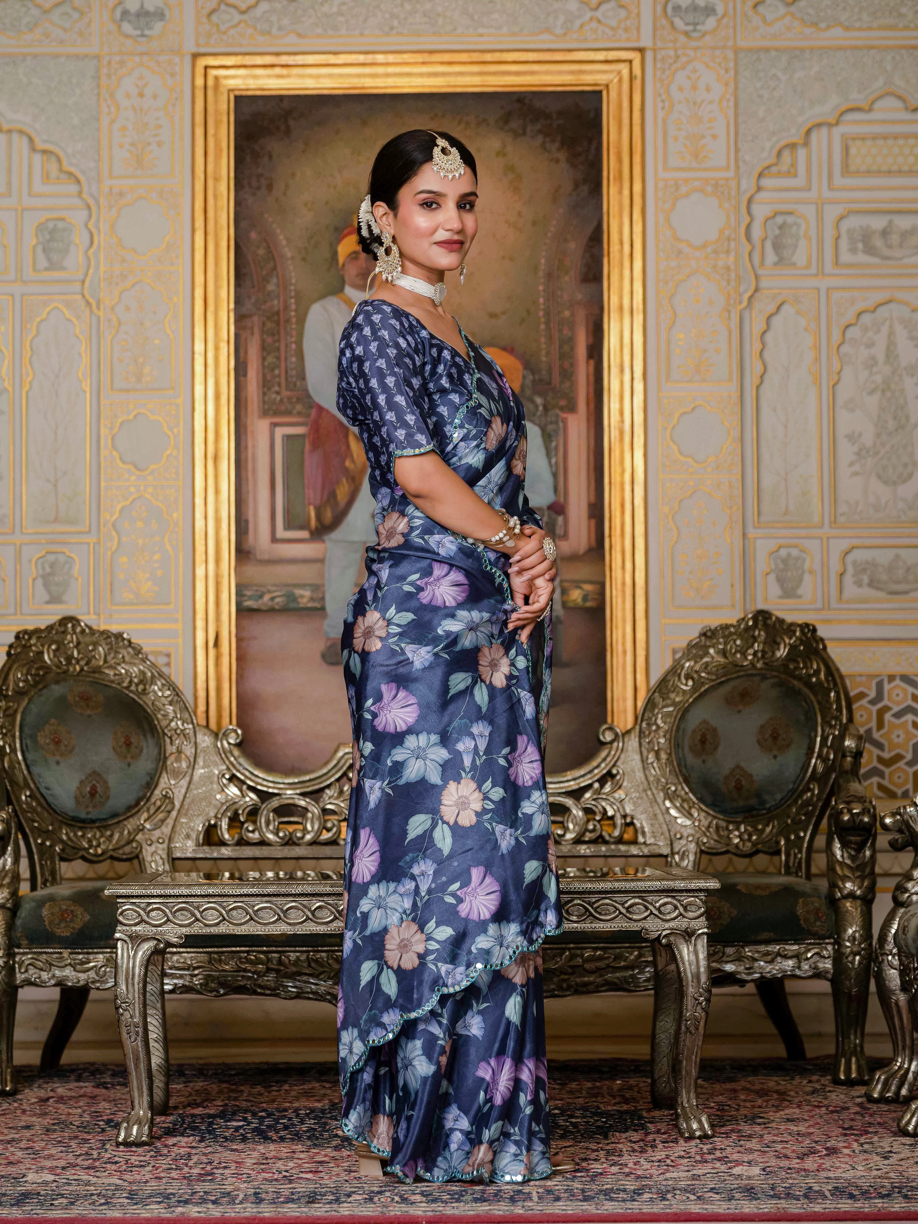Step into effortless elegance with this beautifully crafted Navy Blue & Multi floral printed Ready To Wear saree. Designed for modern women who love tradition without the hassle, this pre-stitched saree offers a flawless drape in minutes. Adorned with vibrant floral motifs and finished with a delicate scalloped embellished border, the saree exudes regal charm. The lightweight, flowy fabric ensures comfort while maintaining a graceful silhouette, making it ideal for weddings, festive occasions, and special celebrations. Just slip it on, zip it up, and you’re ready to shine.