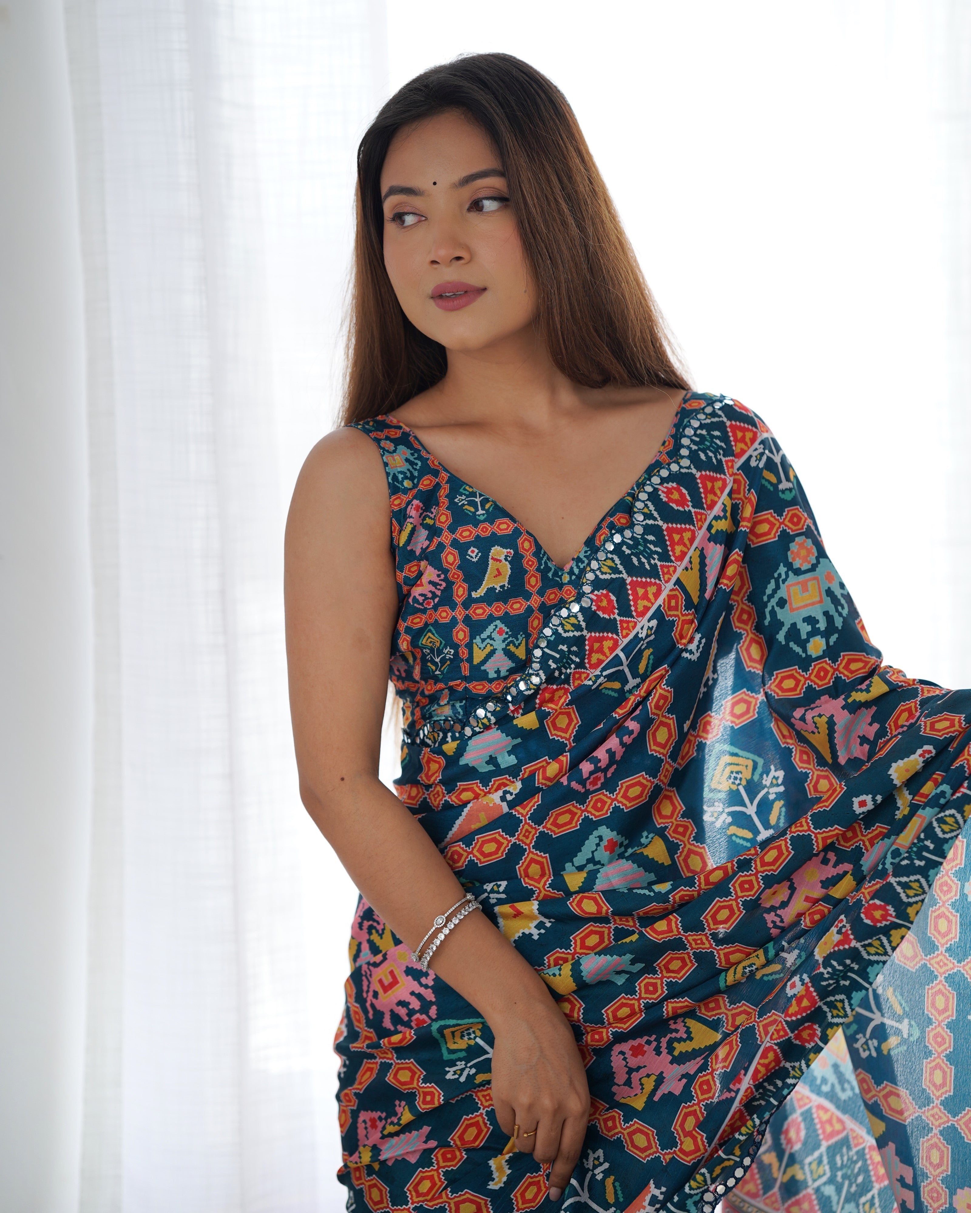 Turn heads with this vibrant Navy Blue Multicolor ethnic print saree, crafted from lightweight, breathable crepe fabric that gracefully drapes and flatters all body types.