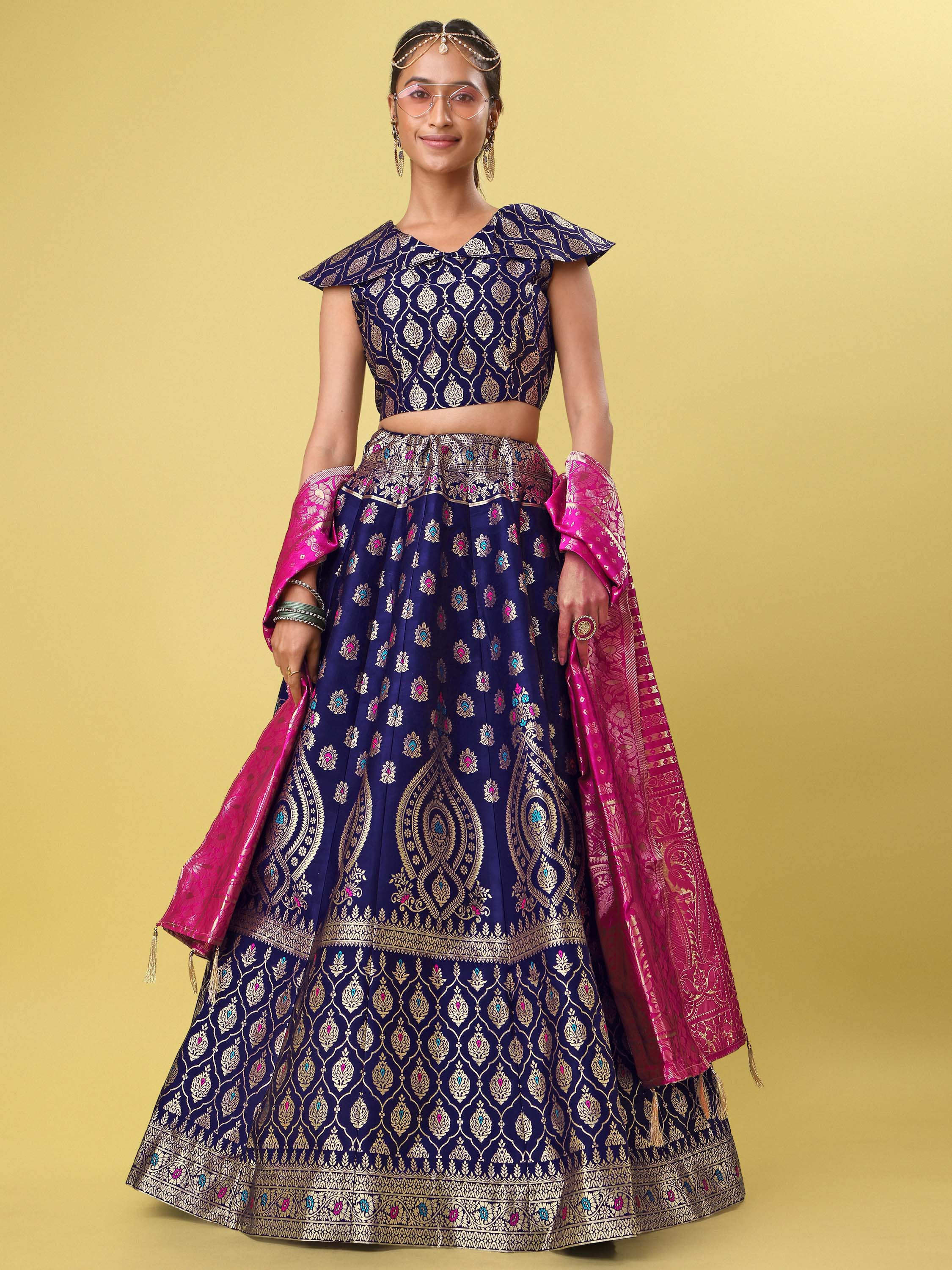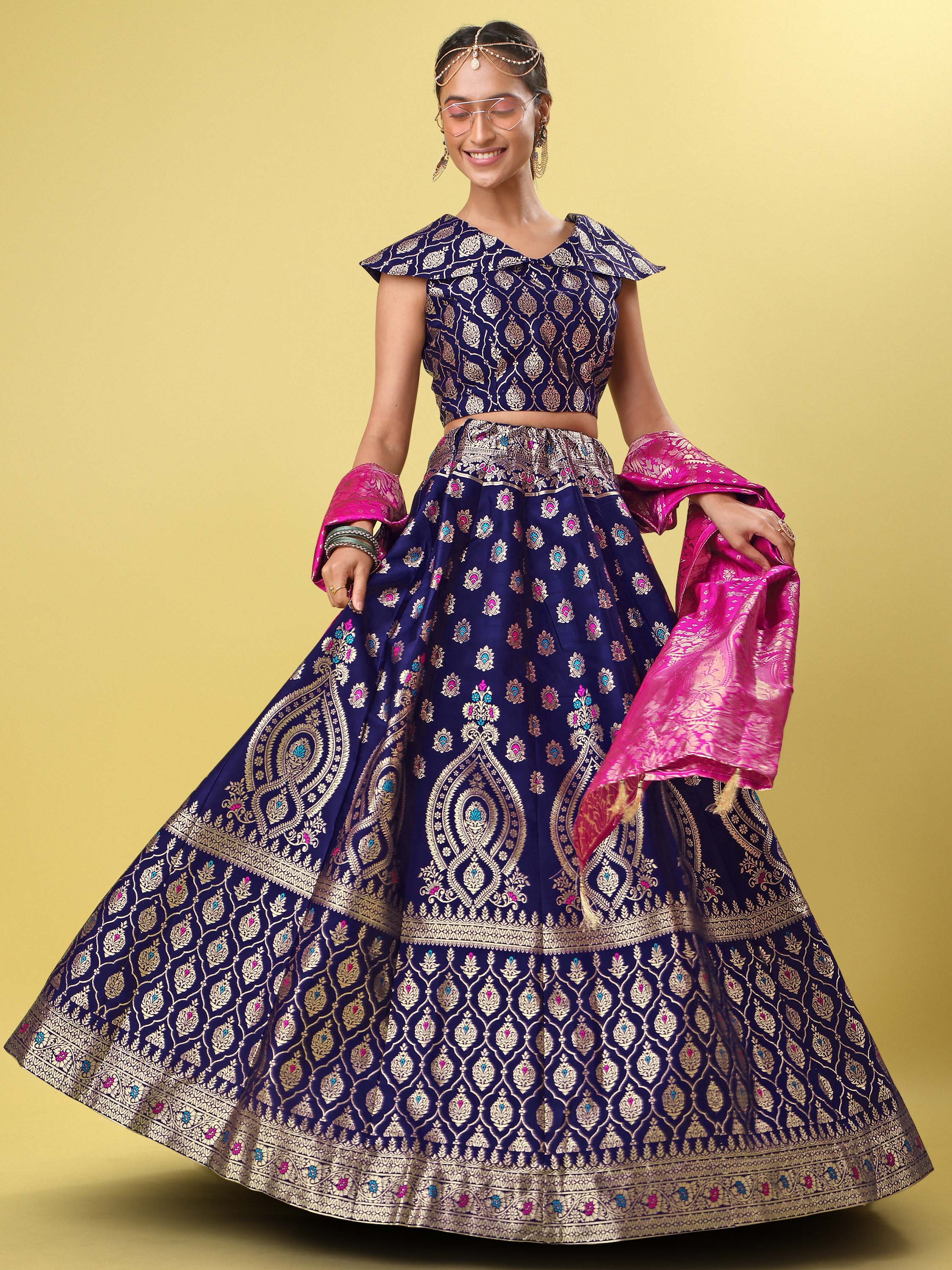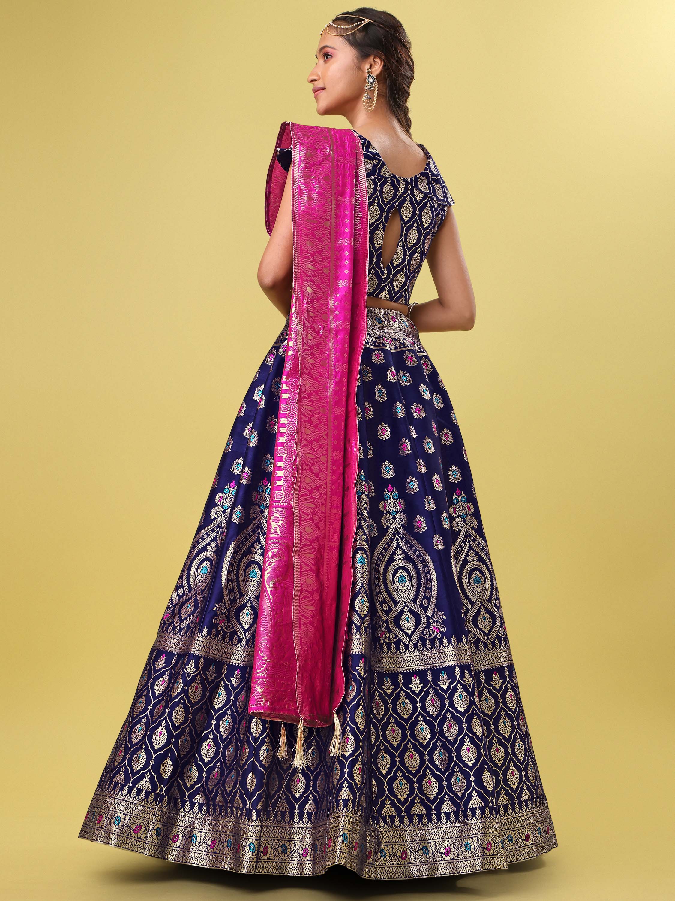 Make a statement at weddings and festive celebrations with this exquisite Navy Blue Banarasi Silk Lehenga Set. Crafted with intricate gold zari motifs and highlighted by rich Pink accents, this ensemble blends timeless tradition with contemporary elegance.The lehenga features elaborate woven patterns along the hem, paired with a structured sleeveless blouse for a refined silhouette. A contrasting Pink dupatta with gold detailing completes the look, adding a regal touch perfect for grand occasions.