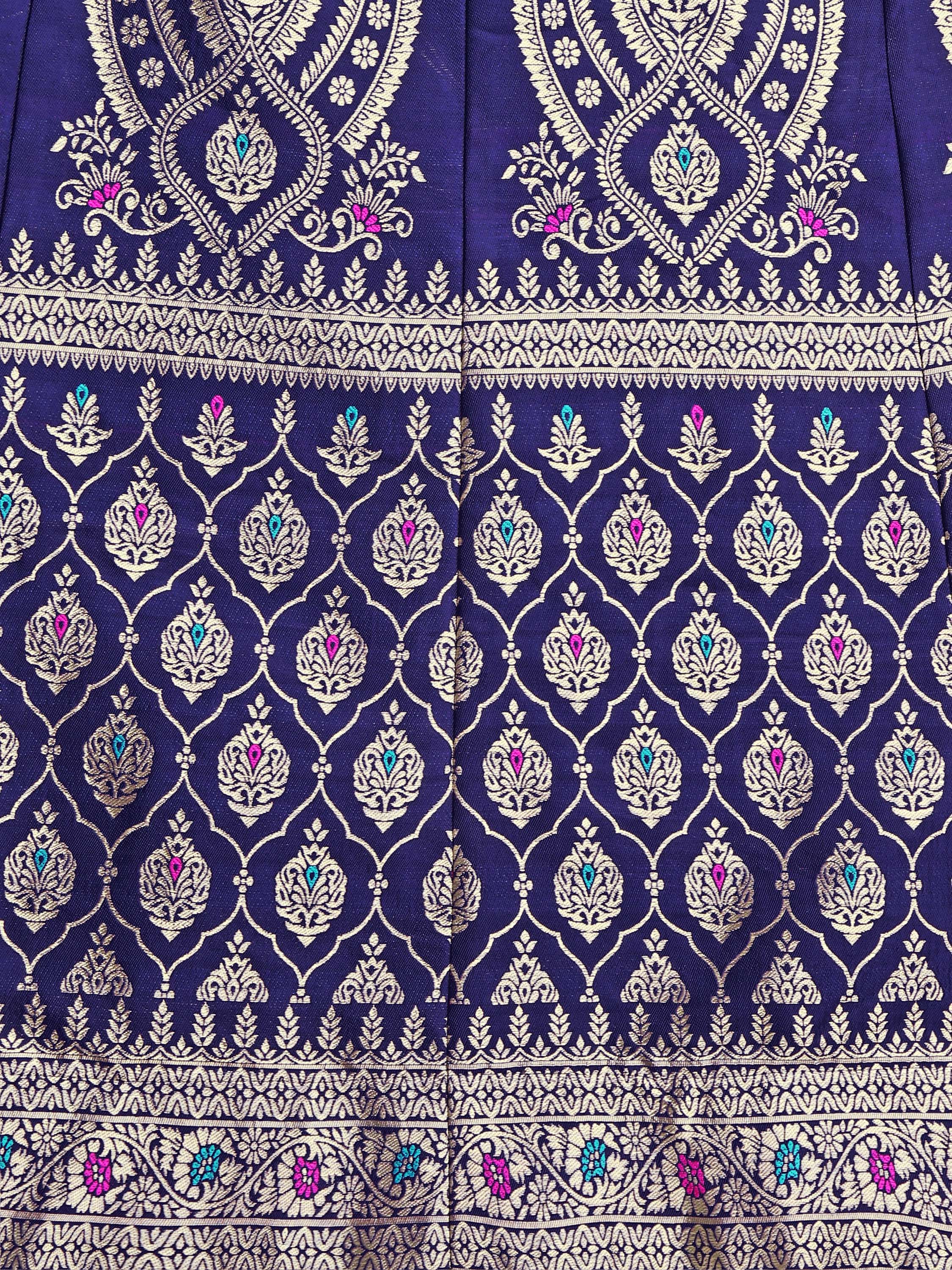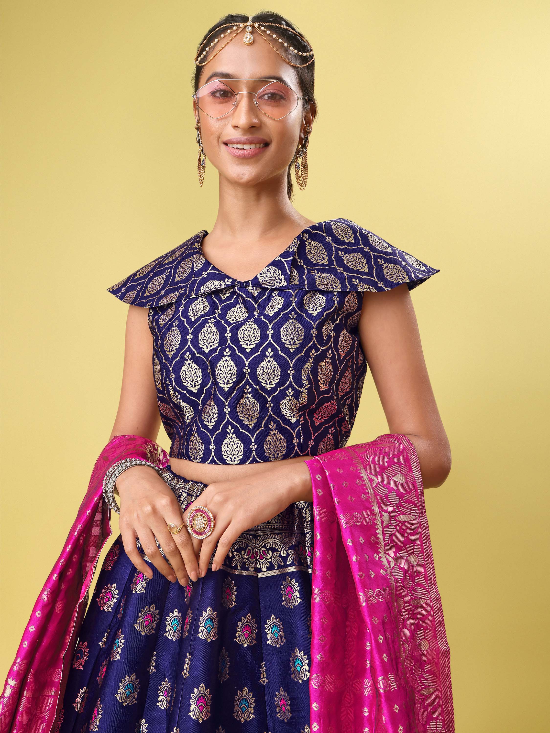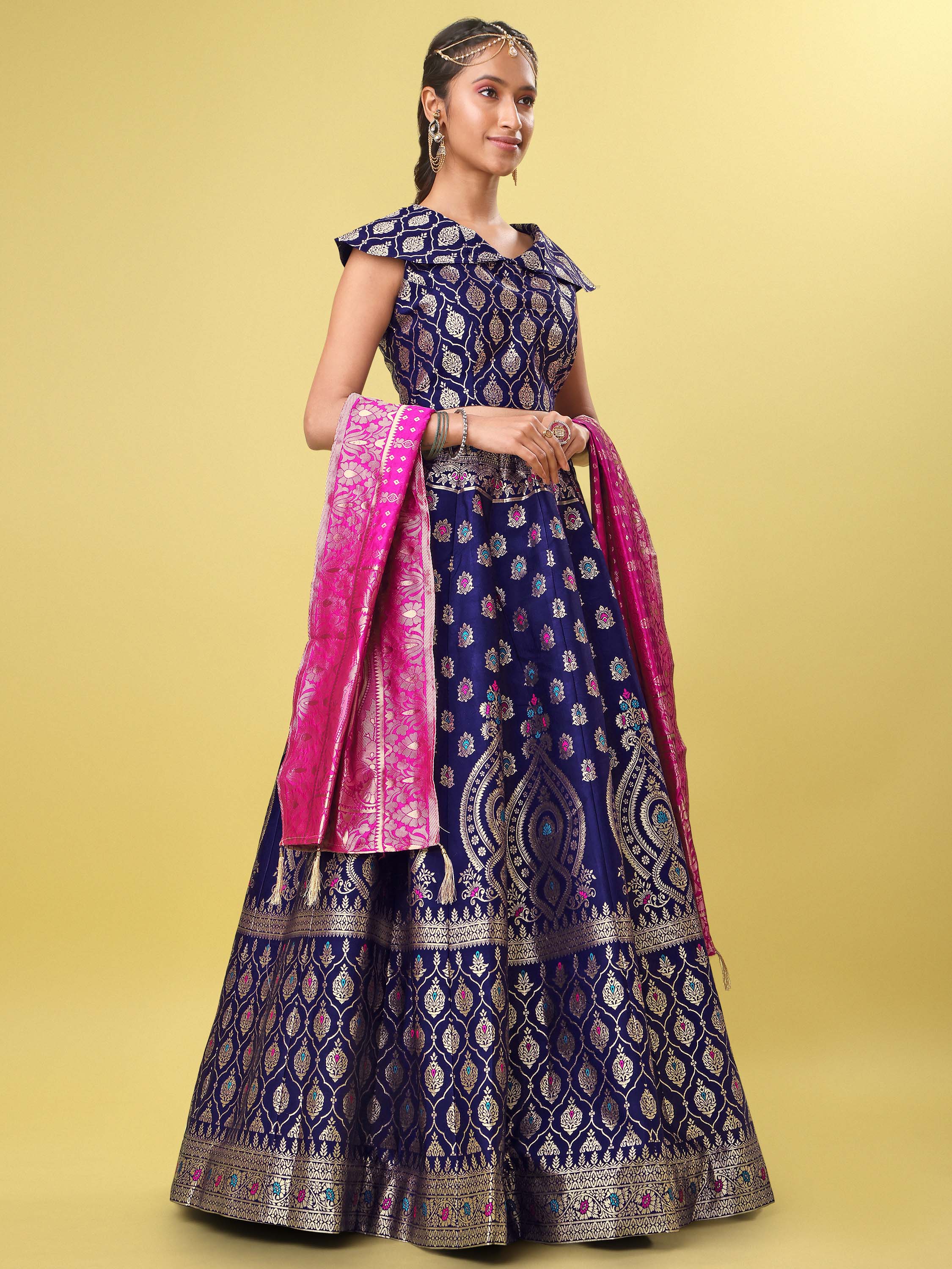Make a statement at weddings and festive celebrations with this exquisite Navy Blue Banarasi Silk Lehenga Set. Crafted with intricate gold zari motifs and highlighted by rich Pink accents, this ensemble blends timeless tradition with contemporary elegance.The lehenga features elaborate woven patterns along the hem, paired with a structured sleeveless blouse for a refined silhouette. A contrasting Pink dupatta with gold detailing completes the look, adding a regal touch perfect for grand occasions.