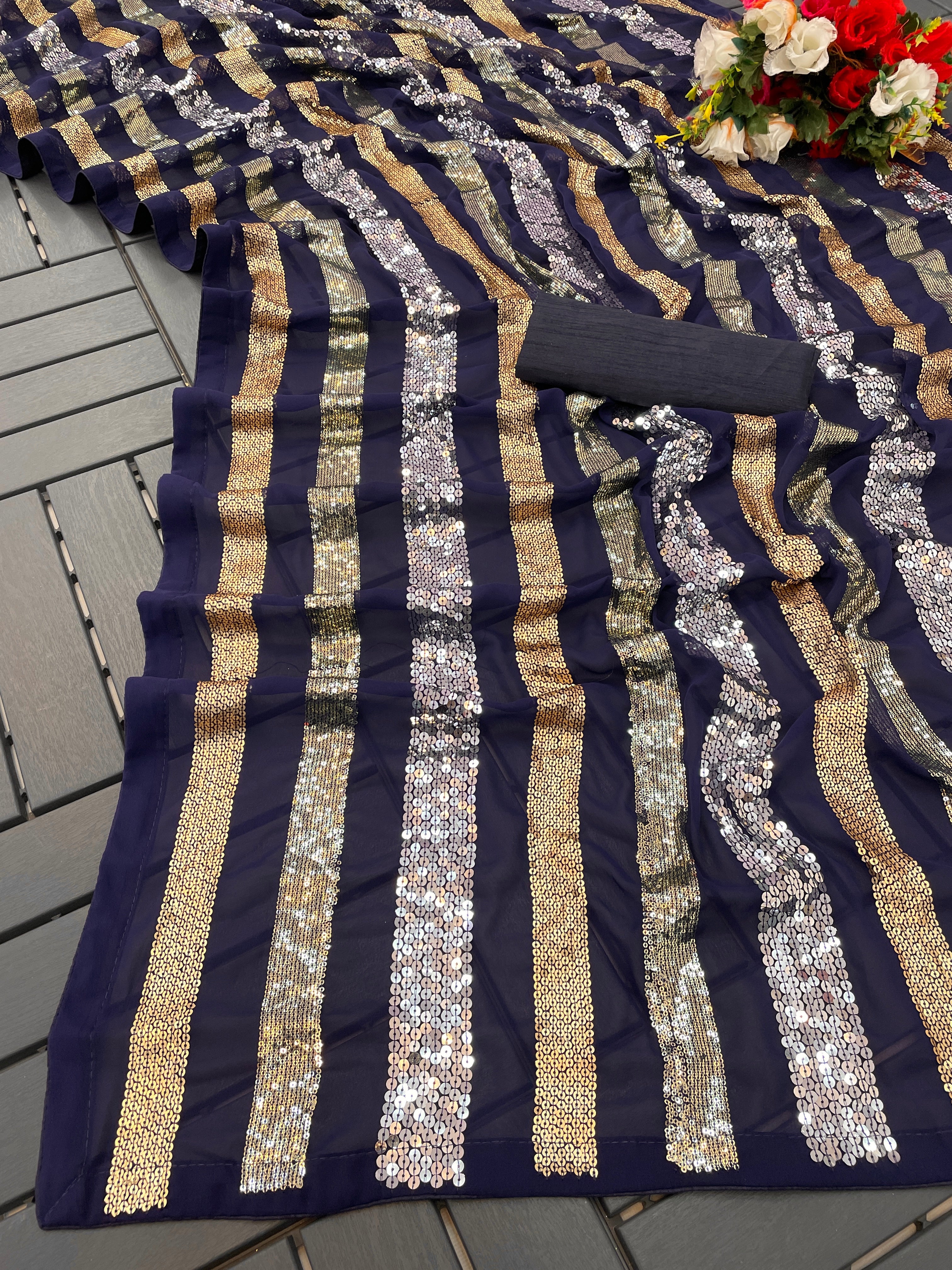 Unleash your inner diva with our Navy Blue Sequin Striped Saree. This enchanting saree showcases a delicate Georgette fabric adorned with bold sequin stripes in hues of silver, gold, and metallic olive, creating a striking and glamorous look.