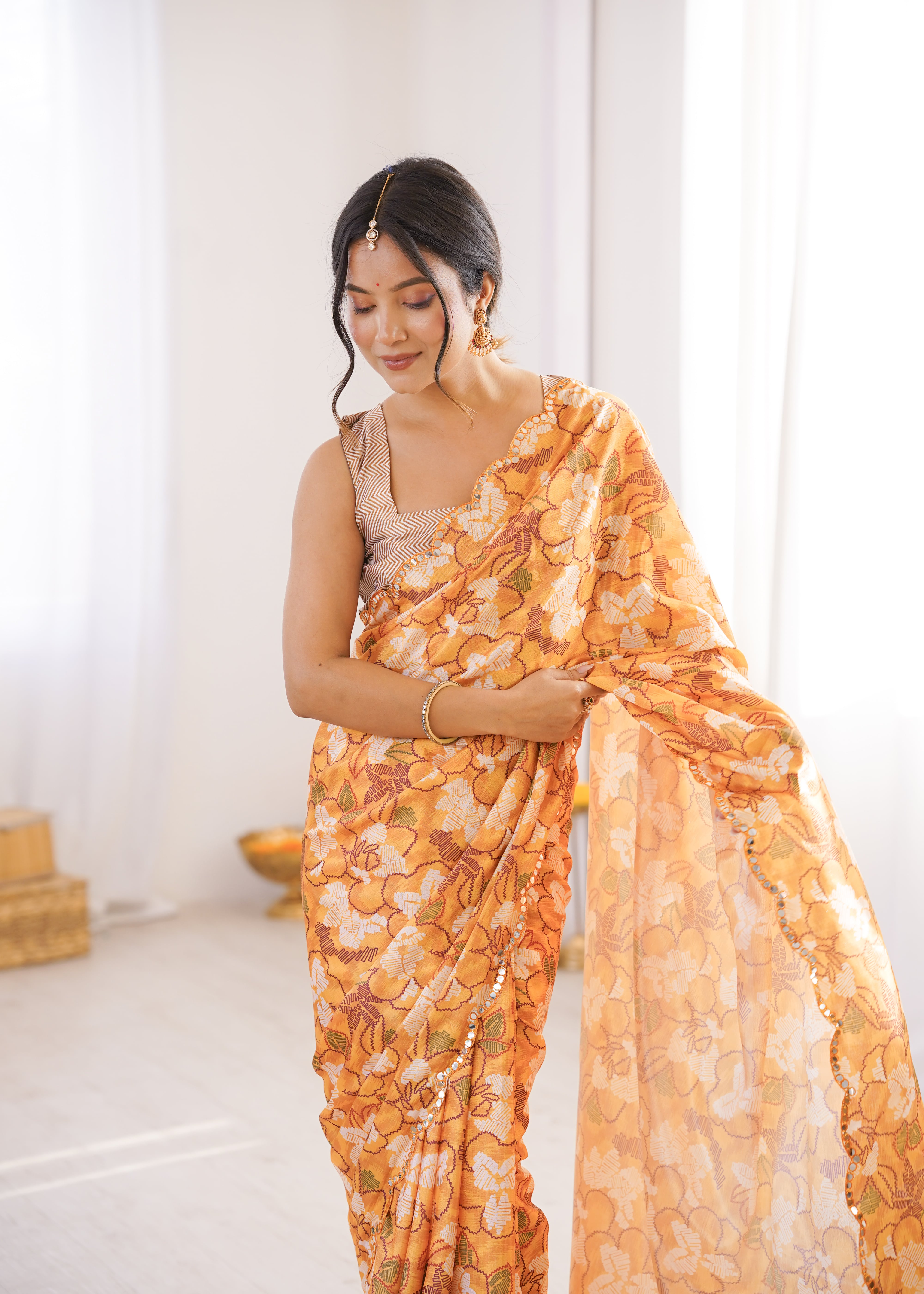 Elevate your ethnic wardrobe with this elegant orange floral printed saree, designed to blend tradition with effortless grace. Crafted from a lightweight, flowy fabric, this saree features an all-over floral pattern in warm hues, beautifully complemented by a subtle sequin-embellished border. Perfect for festive occasions, daytime celebrations, weddings, or intimate gatherings, it drapes gracefully and offers all-day comfort with timeless appeal. Style it with statement earrings and a matching blouse to complete the look.