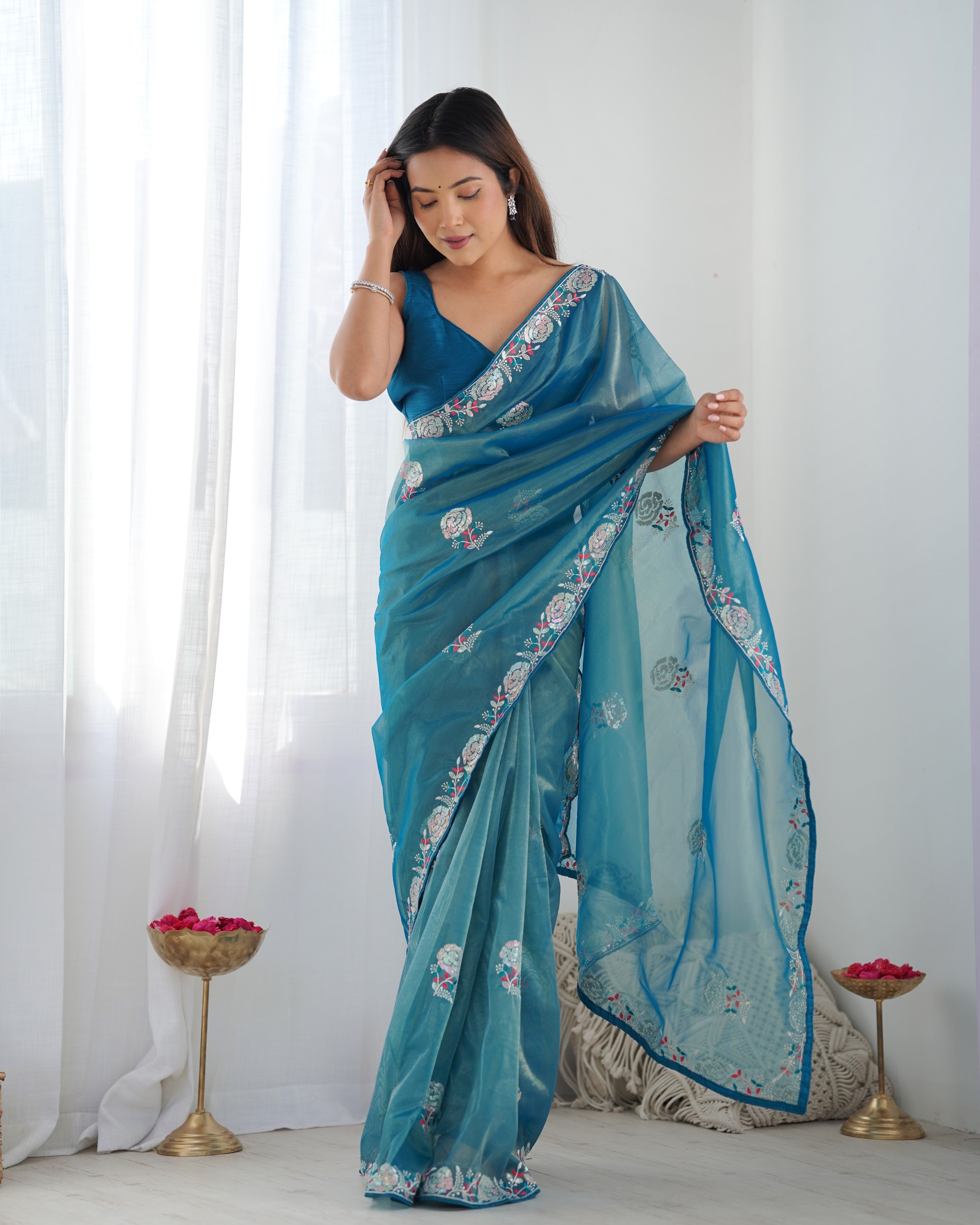 Step into elegance with this graceful petrol blue organza saree, featuring intricate floral embroidery along the border and scattered motifs throughout. The bold yet sophisticated shade of blue exudes confidence while maintaining traditional charm.