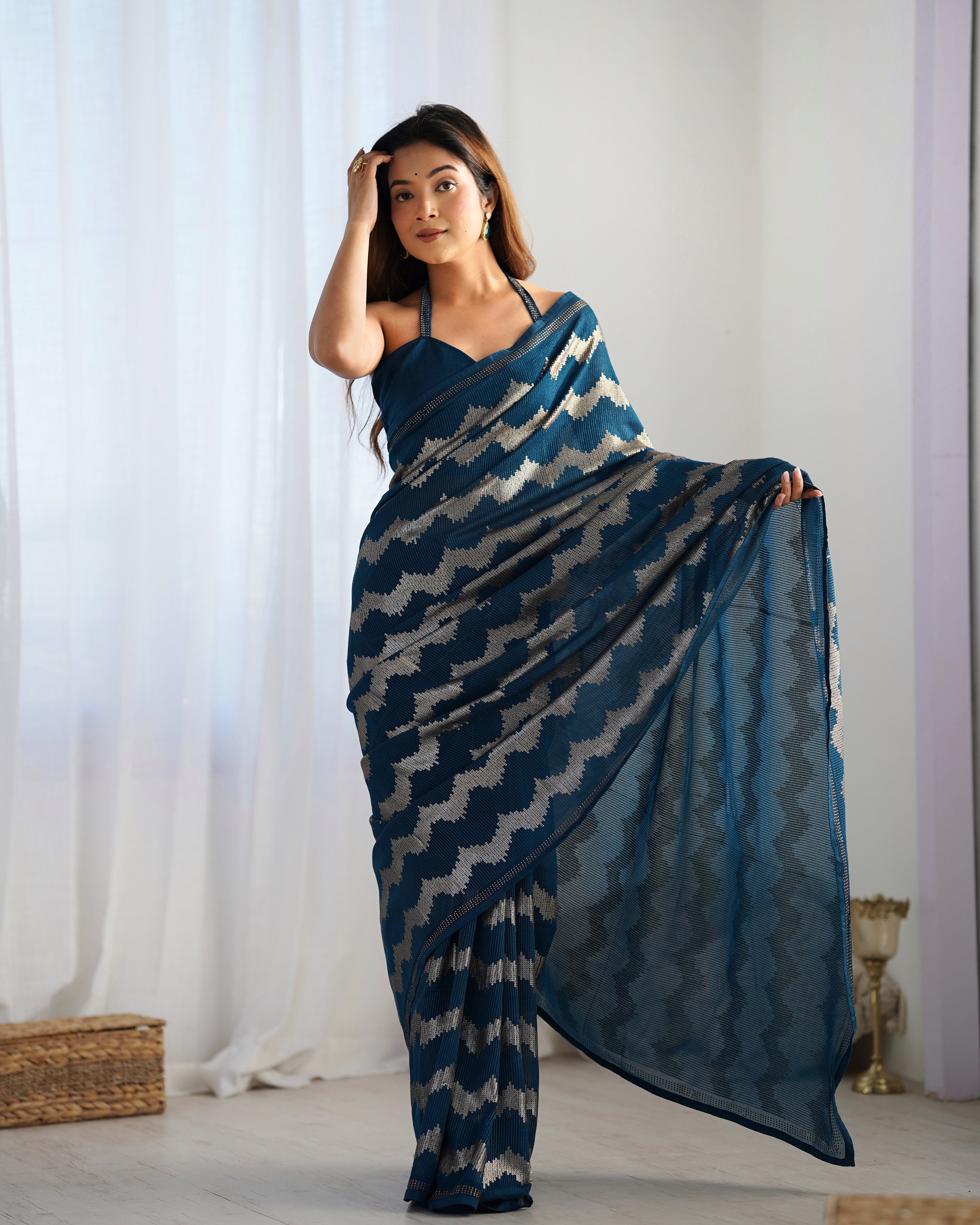 Petrol Blue Pleated Georgette Saree with Metallic Zigzag Weave Contemporary Partywear