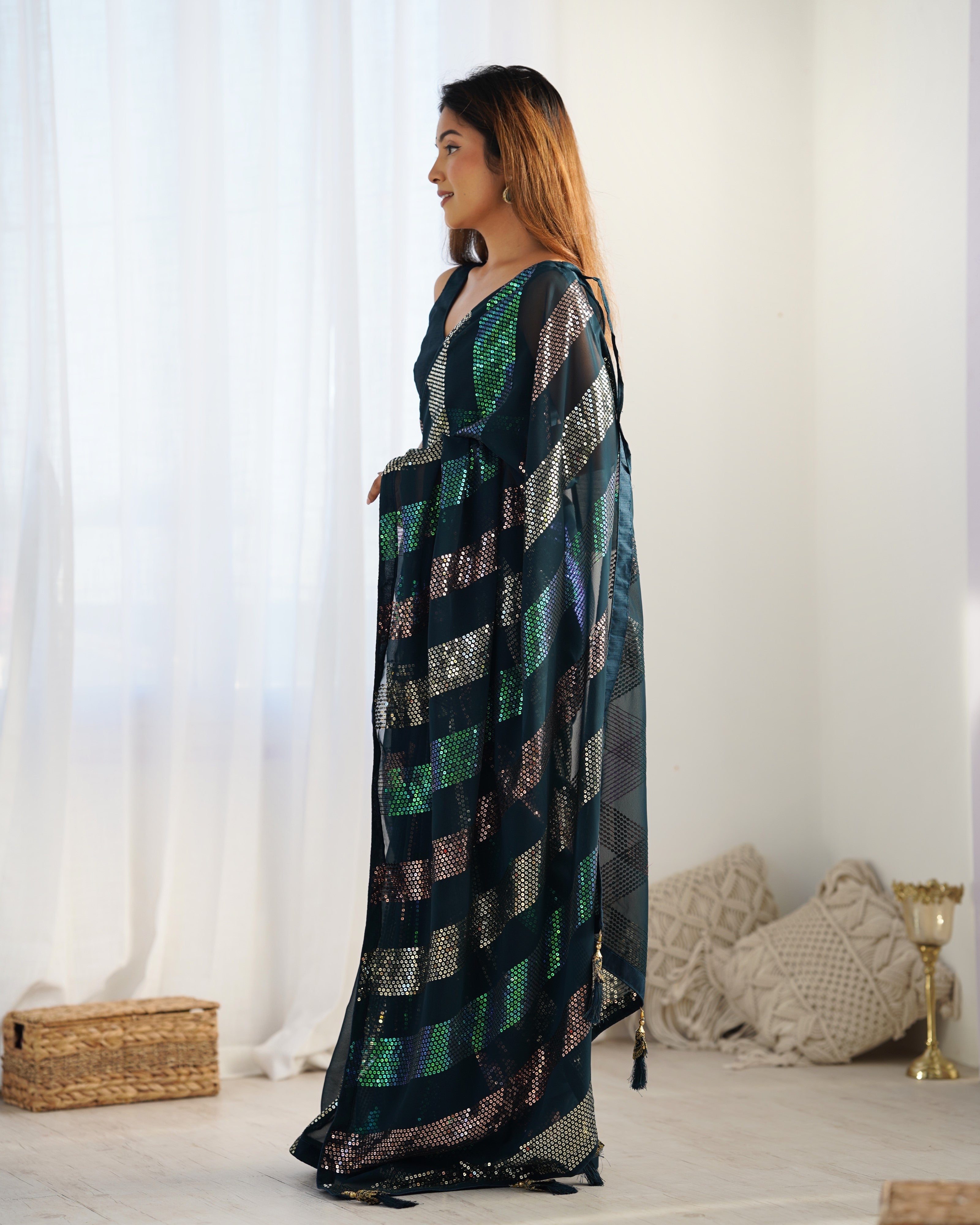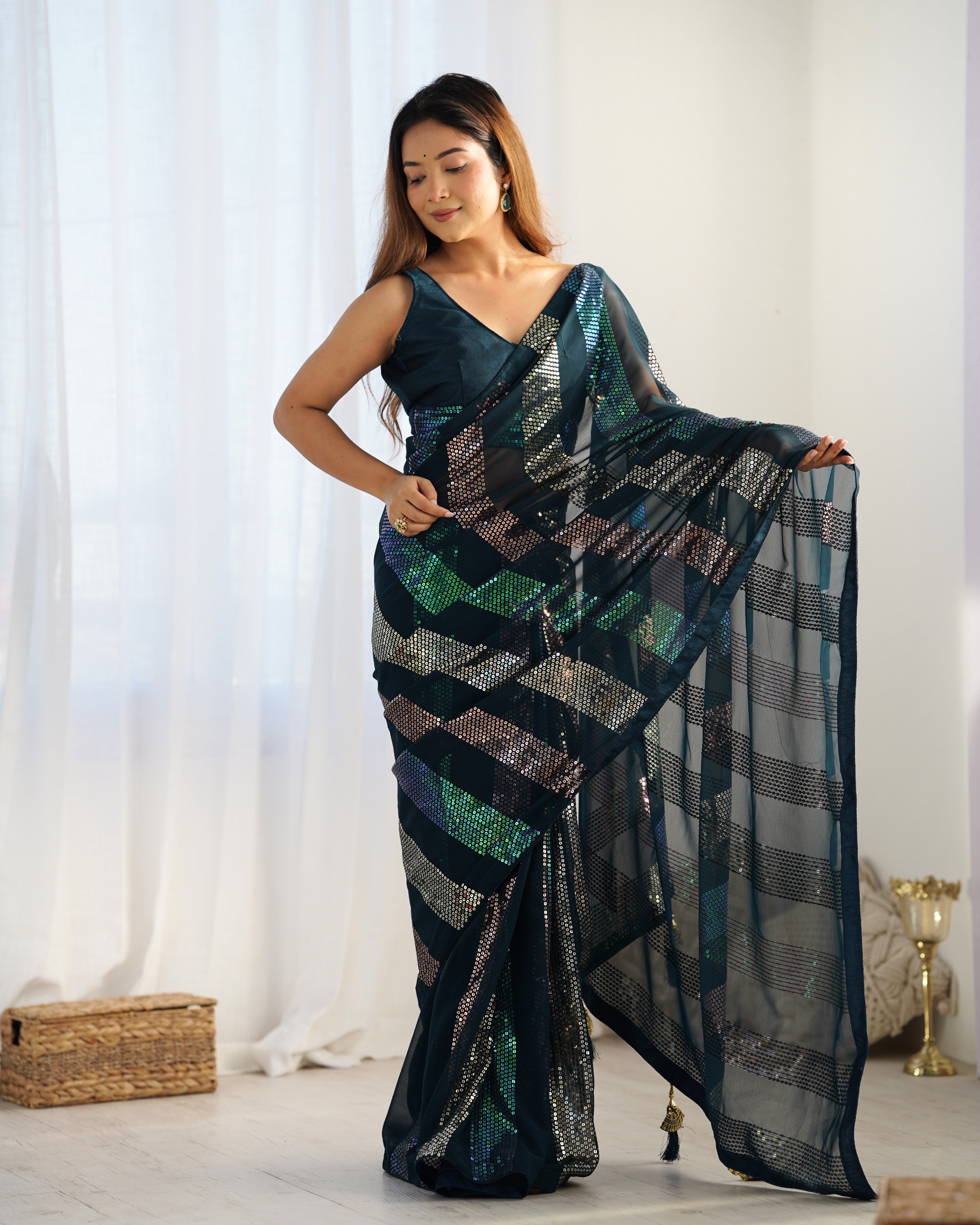 Unveil a bold and refined style with our Petrol Blue Sequin Saree. Crafted in soft net fabric, this saree features geometric striped sequin work in dazzling multicolor holographic accents that radiate grace and glamour.