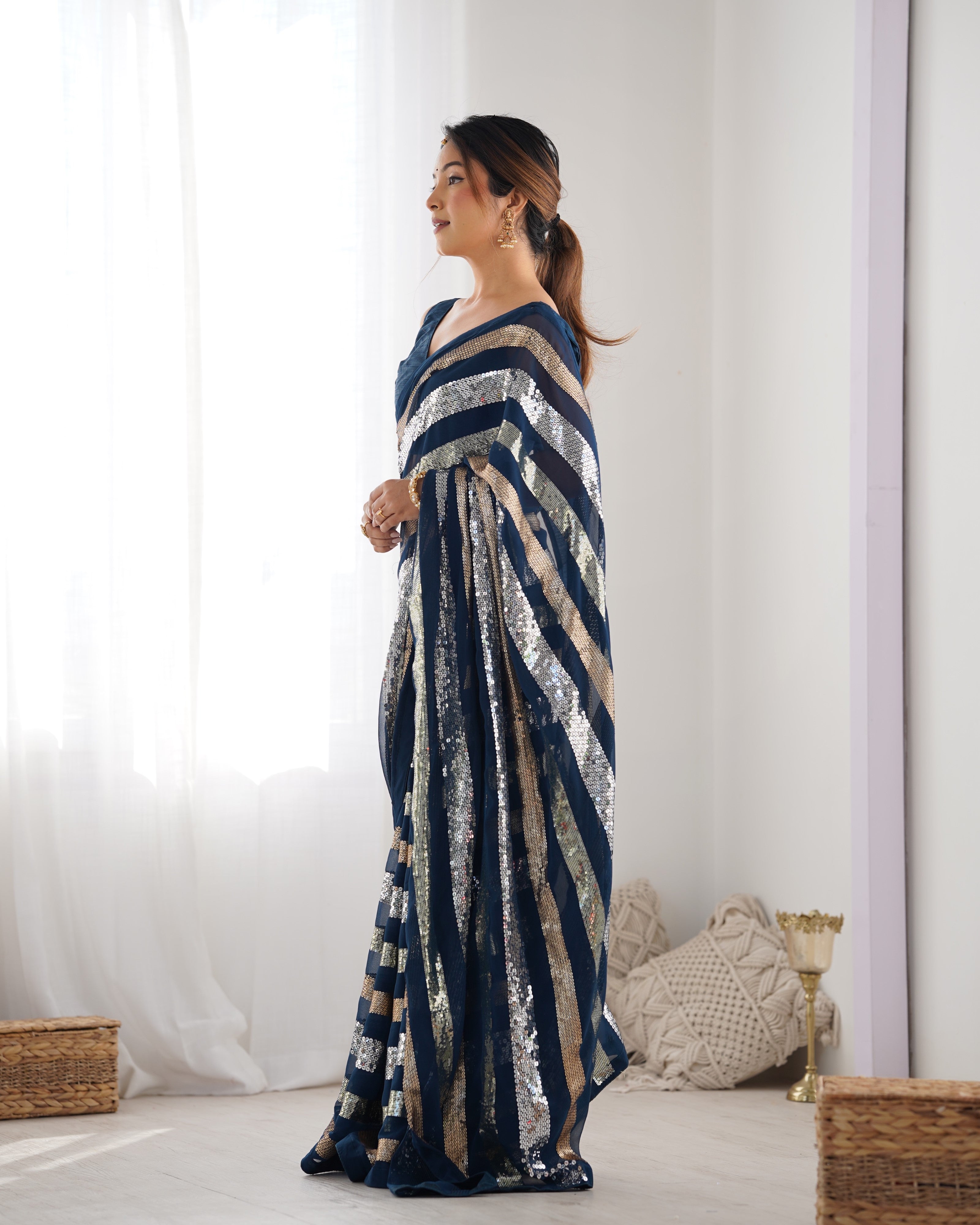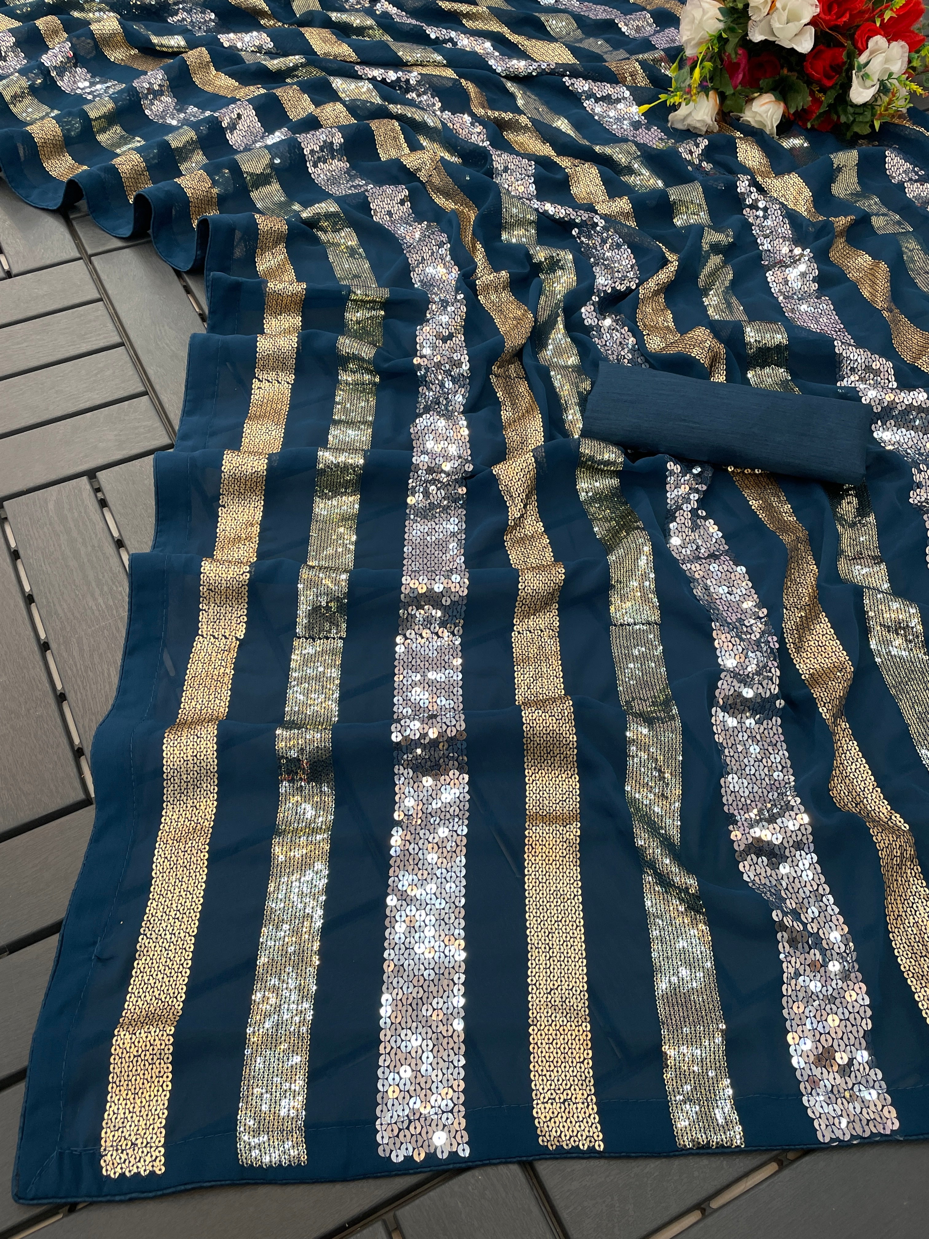 Drape yourself in luxury with our Petrol Blue Sequin Striped Saree. Crafted in a lightweight Georgette fabric, this saree features metallic stripes in silver, gold, and olive shimmer, perfectly arranged to enhance your silhouette and add a touch of drama.