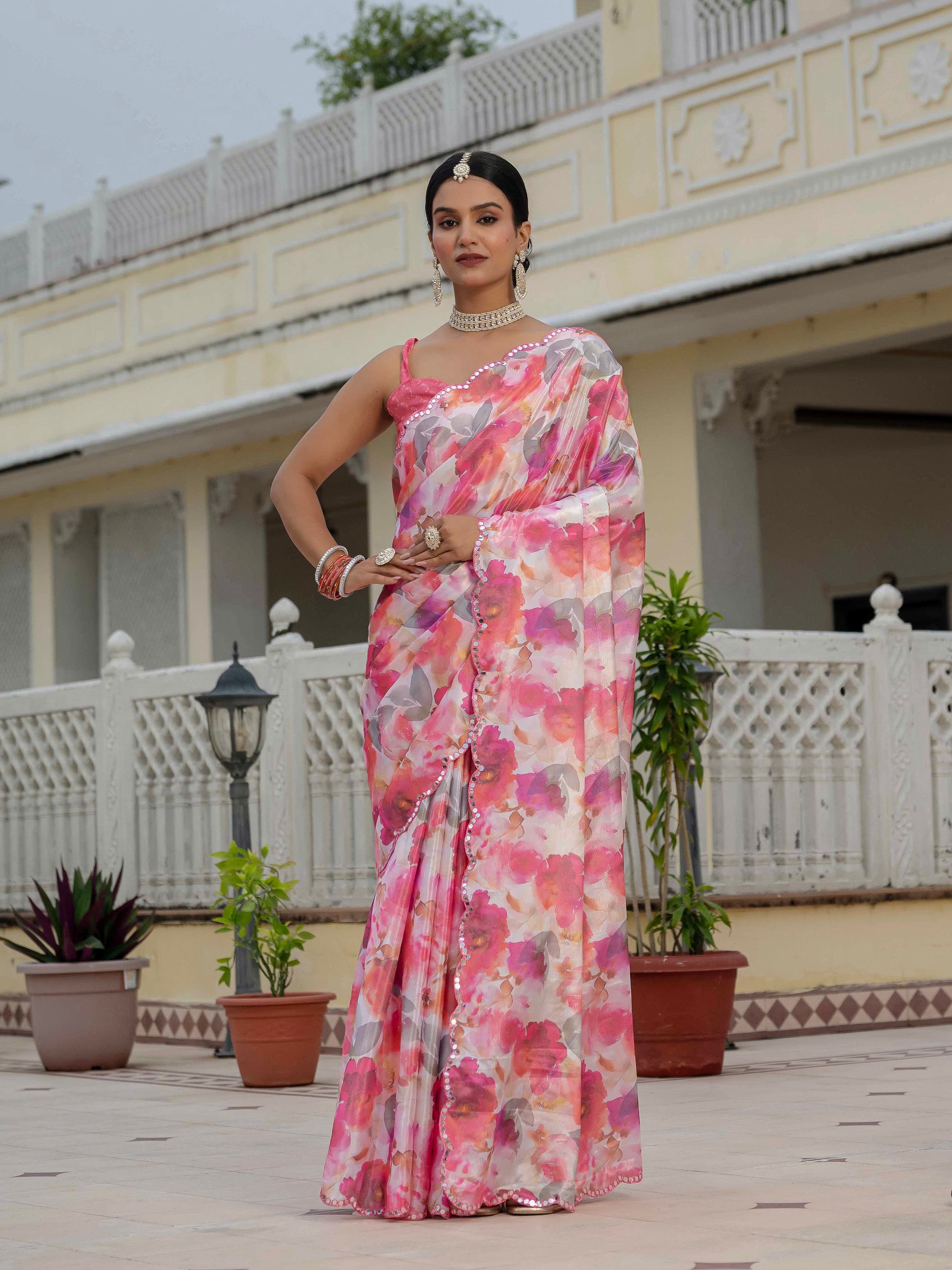 Step into effortless elegance with this beautifully crafted Pink & Multi floral printed Ready To Wear saree. Designed for modern women who love tradition without the hassle, this pre-stitched saree offers a flawless drape in minutes. Adorned with vibrant floral motifs and finished with a delicate scalloped embellished border, the saree exudes regal charm. The lightweight, flowy fabric ensures comfort while maintaining a graceful silhouette, making it ideal for weddings, festive occasions, and special celebrations. Just slip it on, zip it up, and you’re ready to shine.