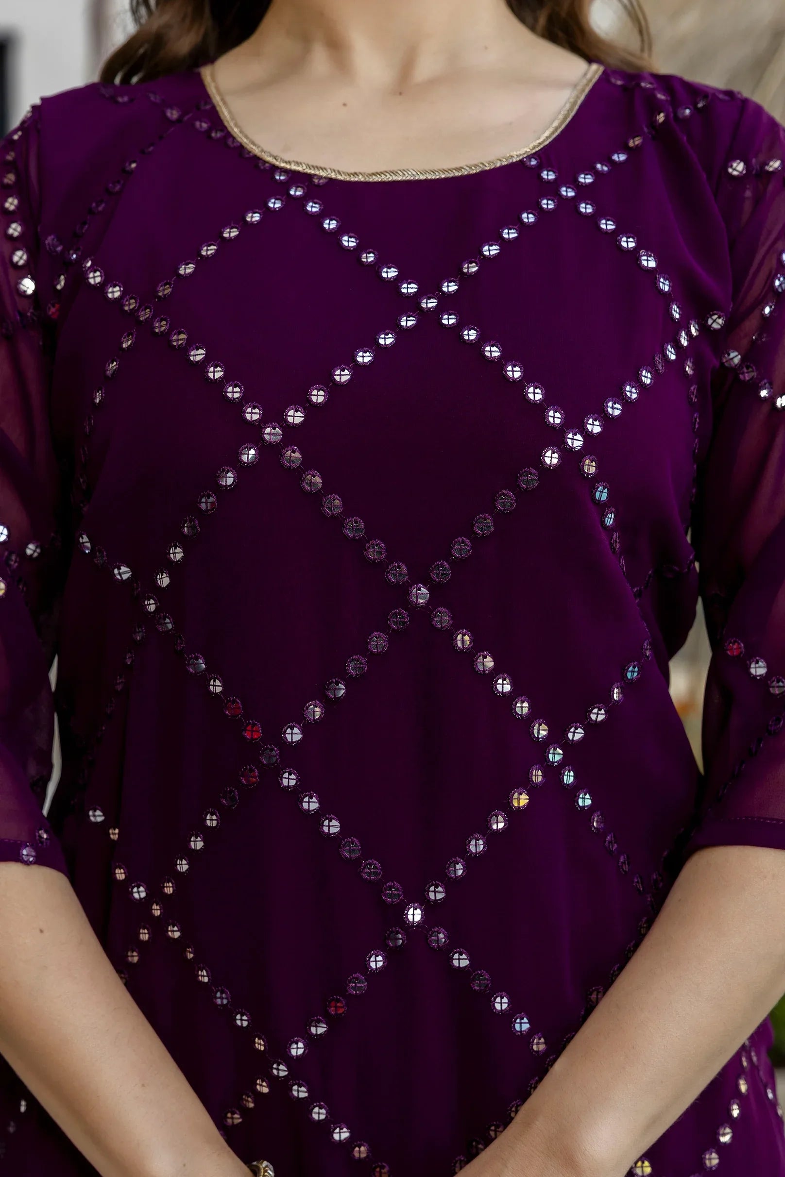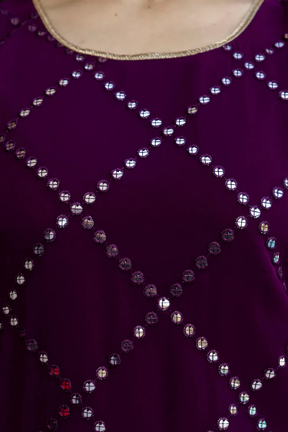 Elevate your festive wardrobe with this elegant plum purple kurta set, crafted to blend traditional charm with modern sophistication. The kurta features delicate all-over embellishments arranged in a diamond pattern, adding subtle sparkle and texture. Paired with a flowy matching bottom and a lightweight chiffon dupatta adorned with a graceful gold lace border, this ensemble is perfect for festive occasions, celebrations, and evening gatherings.