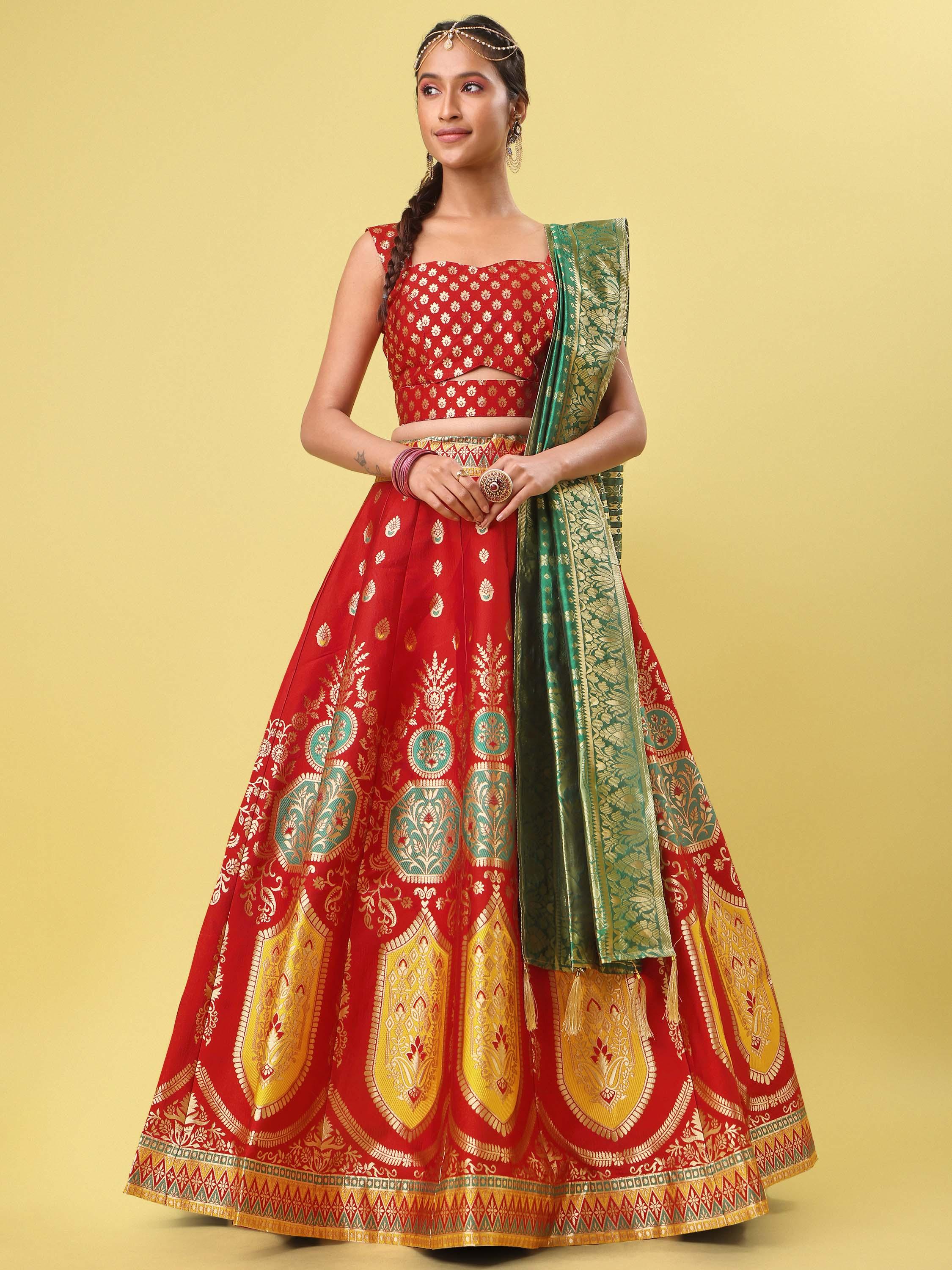 Make a statement at weddings and festive celebrations with this exquisite Red Banarasi Silk Lehenga Set. Crafted with intricate gold zari motifs and highlighted by rich Green accents, this ensemble blends timeless tradition with contemporary elegance.The lehenga features elaborate woven patterns along the hem, paired with a structured sleeveless blouse for a refined silhouette. A contrasting Green dupatta with gold detailing completes the look, adding a regal touch perfect for grand occasions.