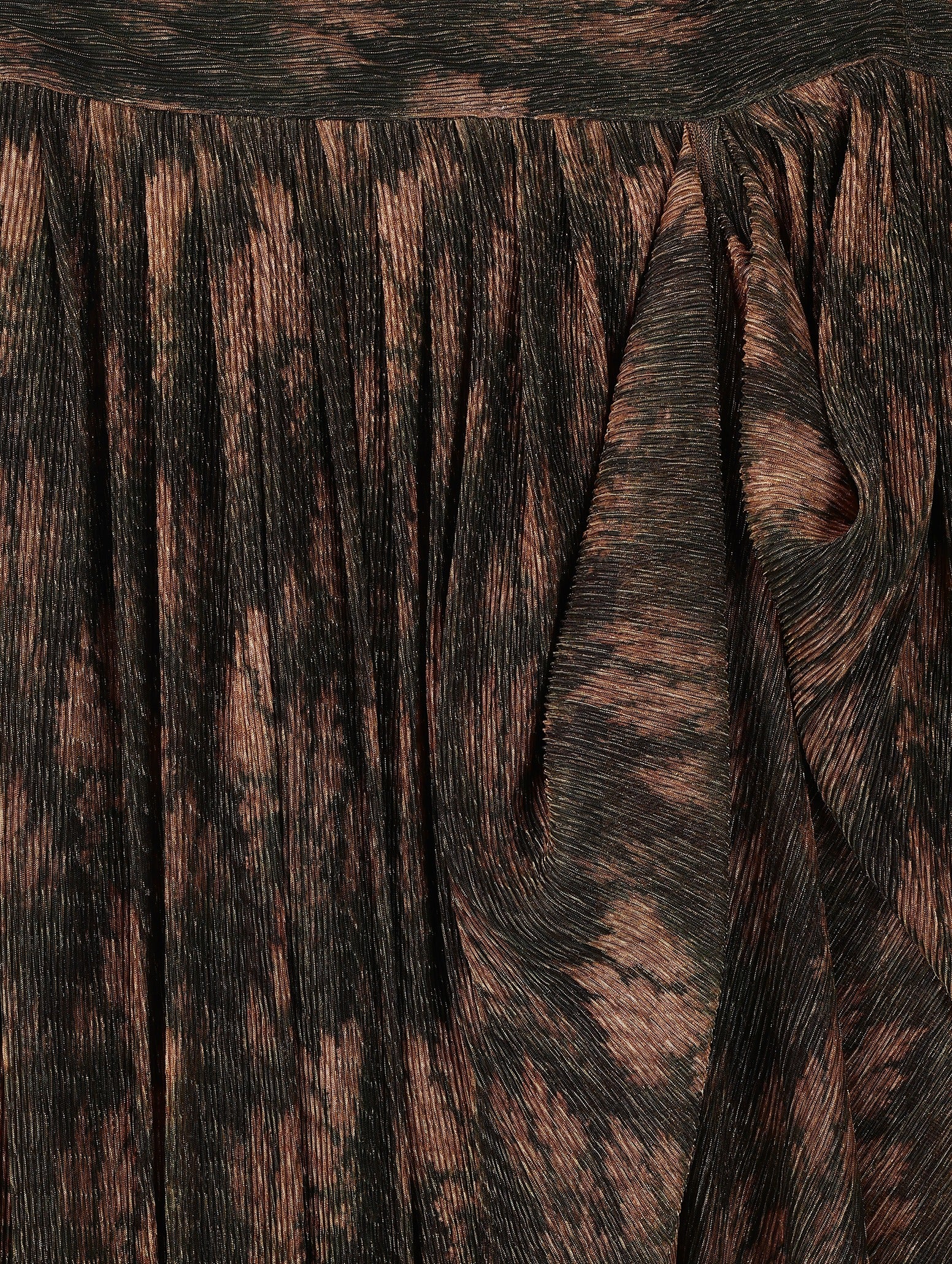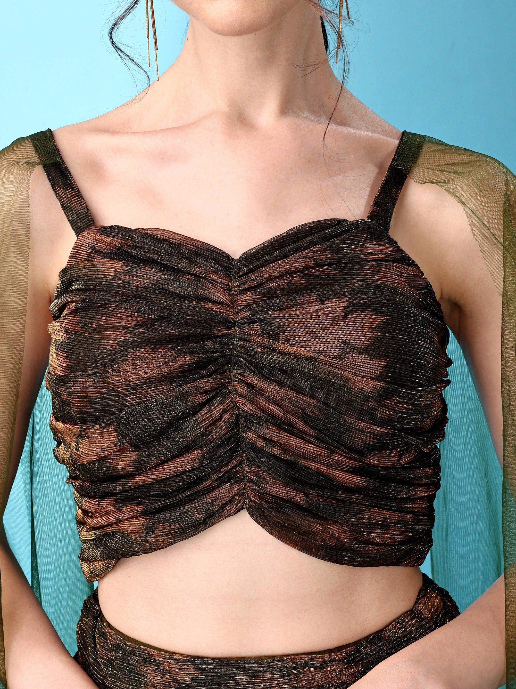 Step into contemporary elegance with our Rihana Olive Green Skirt Set. This fashion-forward ensemble blends traditional drapes with modern silhouettes. The ruched crop top features a gathered front and delicate straps, paired beautifully with a flowy, printed skirt and sheer net cape sleeves for a dramatic flair.