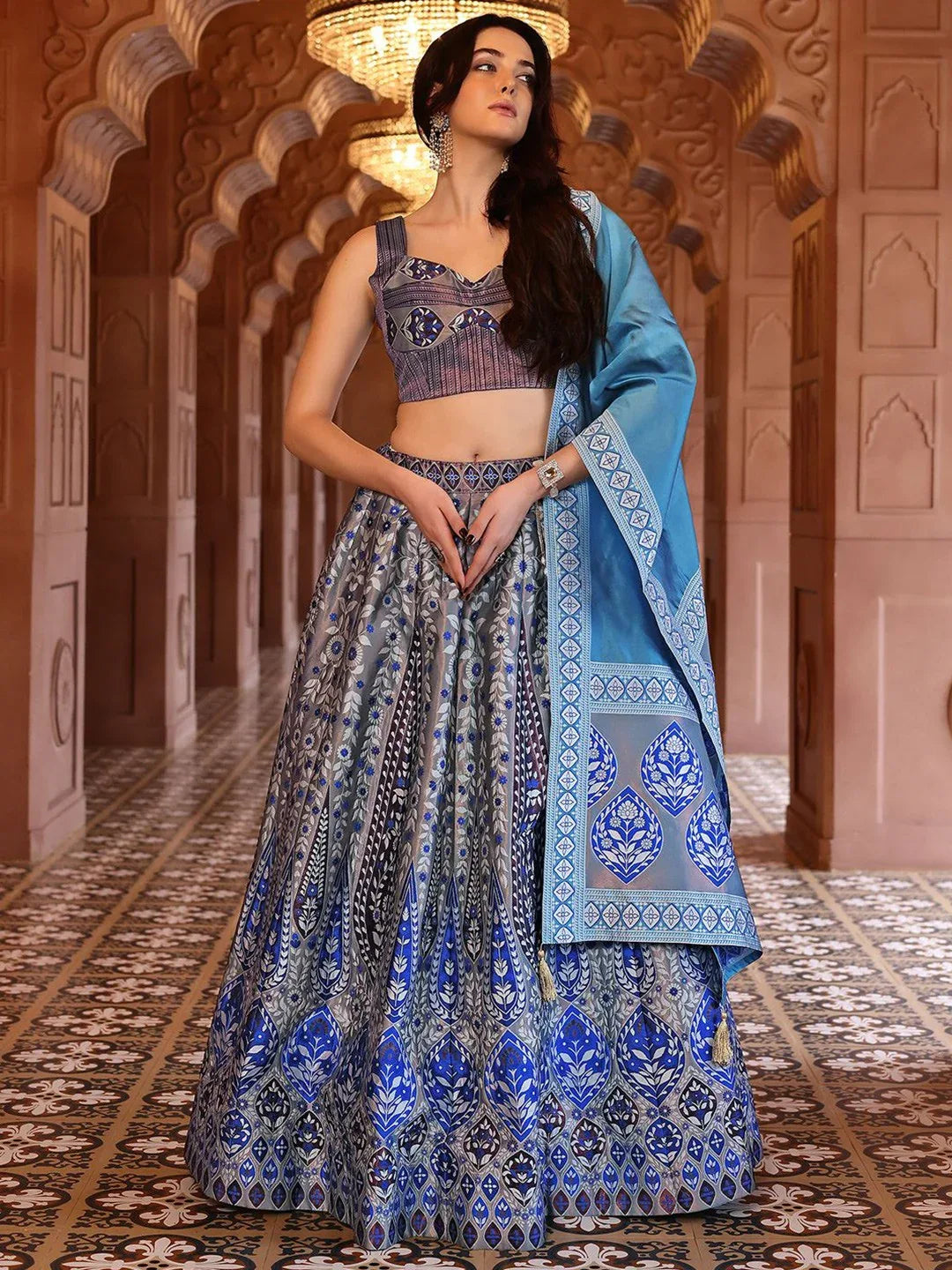 Turn heads at every celebration with the Royal Azure Ethnic Printed Lehenga Set. This beautifully designed ensemble features rich blue tones complemented by monochrome and grey undertones. The intricately patterned lehenga skirt is paired with a tailored blouse boasting bold geometric embroidery and structured shoulders. A matching dupatta in sky blue with traditional border detailing completes this regal look.