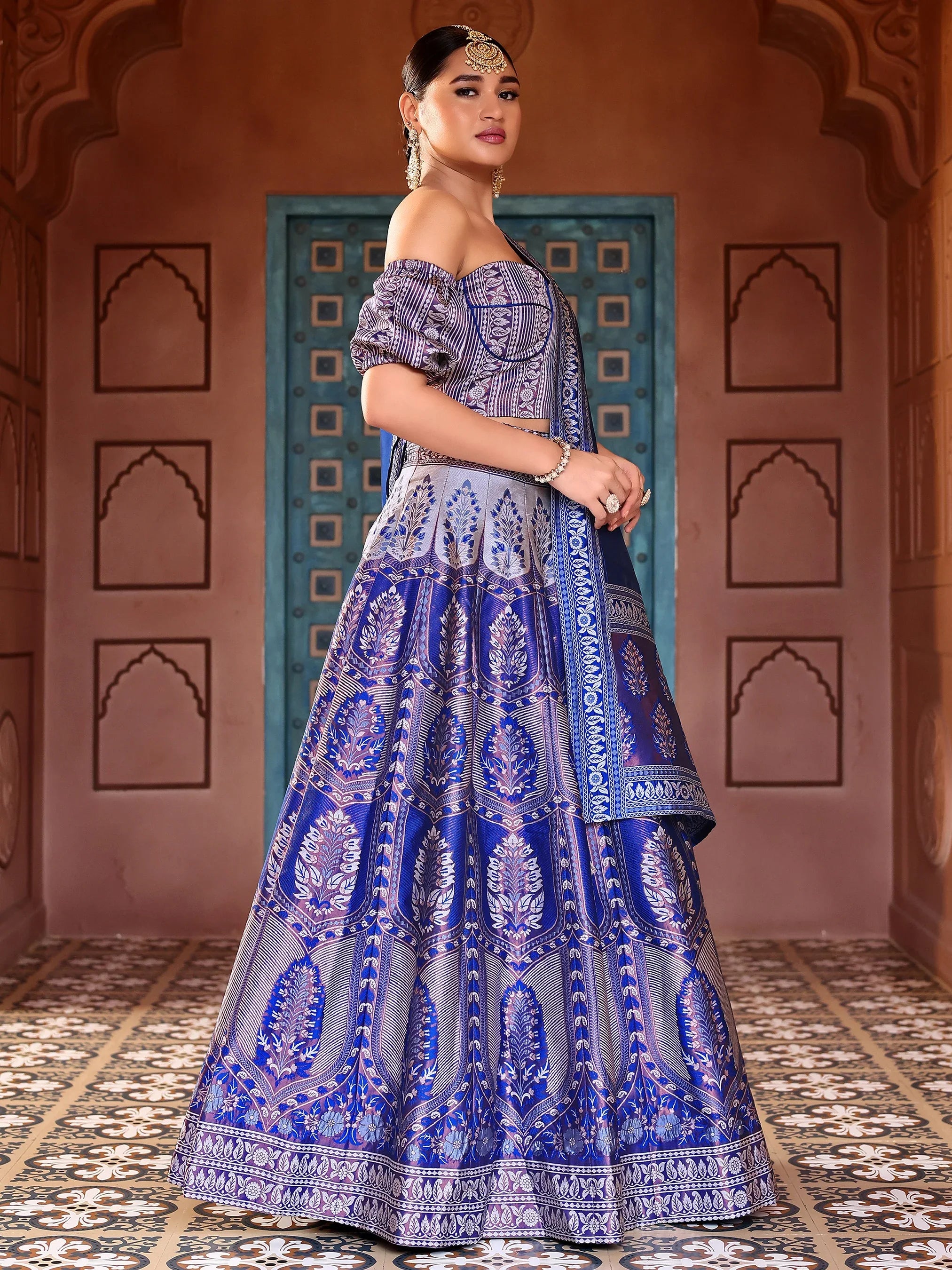 Elevate your ethnic elegance with this majestic Royal Blue Ajrakh Print Lehenga Set. Featuring a sweetheart neckline blouse with dramatic off-shoulder puff sleeves, a richly patterned lehenga skirt, and a solid royal blue dupatta with printed borders — this ensemble is the epitome of regal charm.